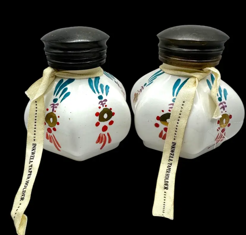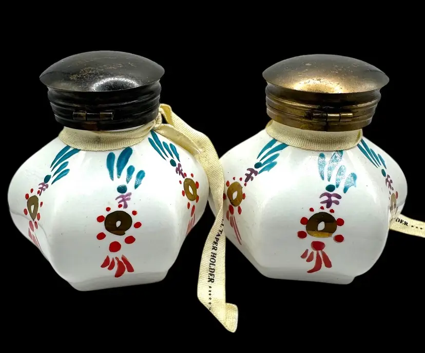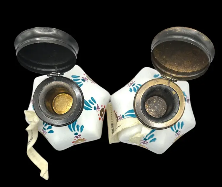 Vintage pair of porcelain inkwells or taper candle holders (per attached cloth ribbon) with brass inkwells and hinged lids.