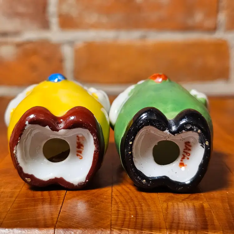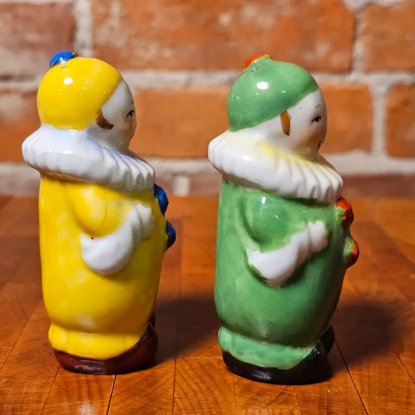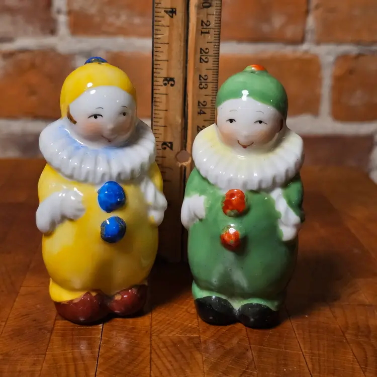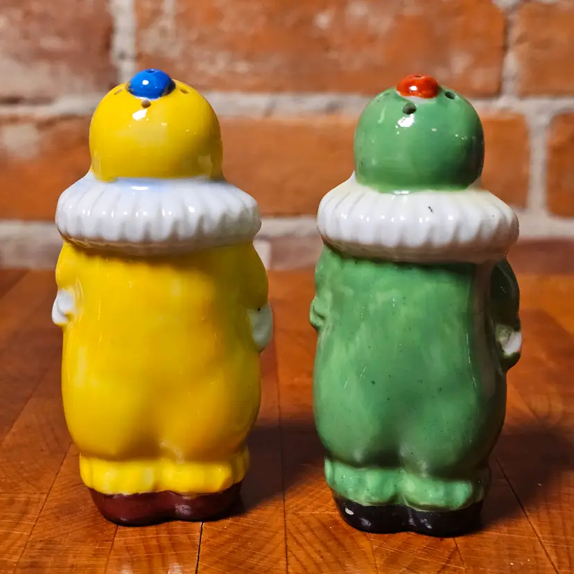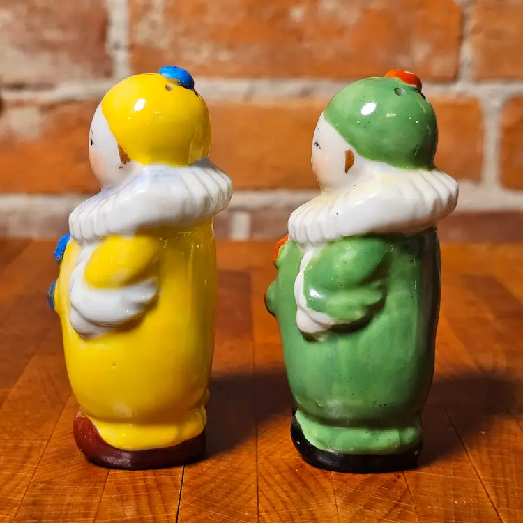 Details • Vintage clown salt & pepper shaker set • Marked Japan on base • Anthropomorphic harlequin style figures • Yellow clown with blue buttons • Green clown with red buttons • White ruffled collars • Circa 1950s–1960s