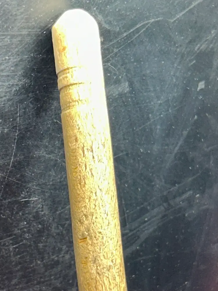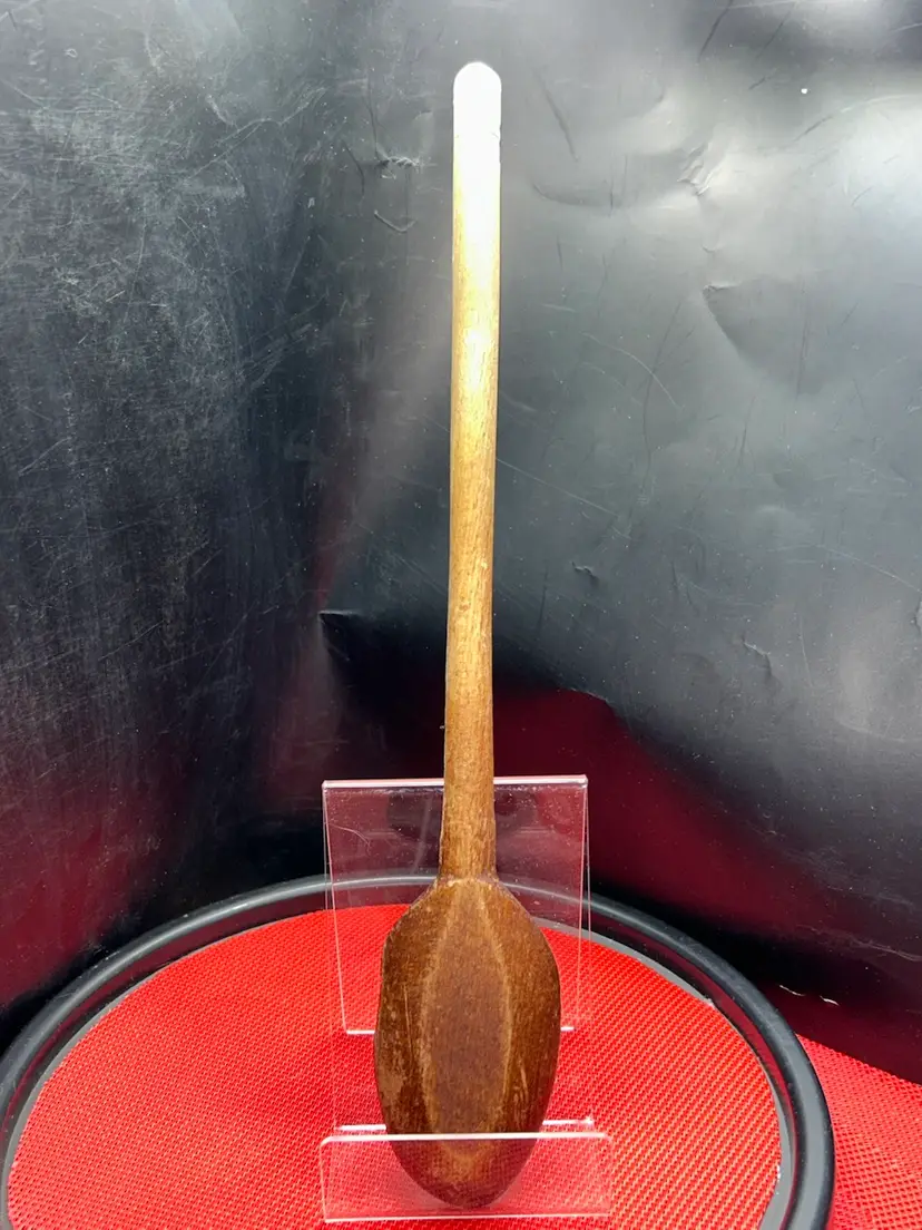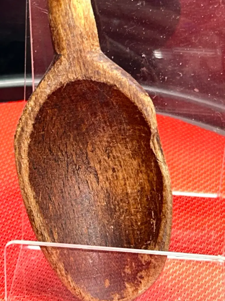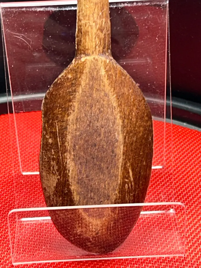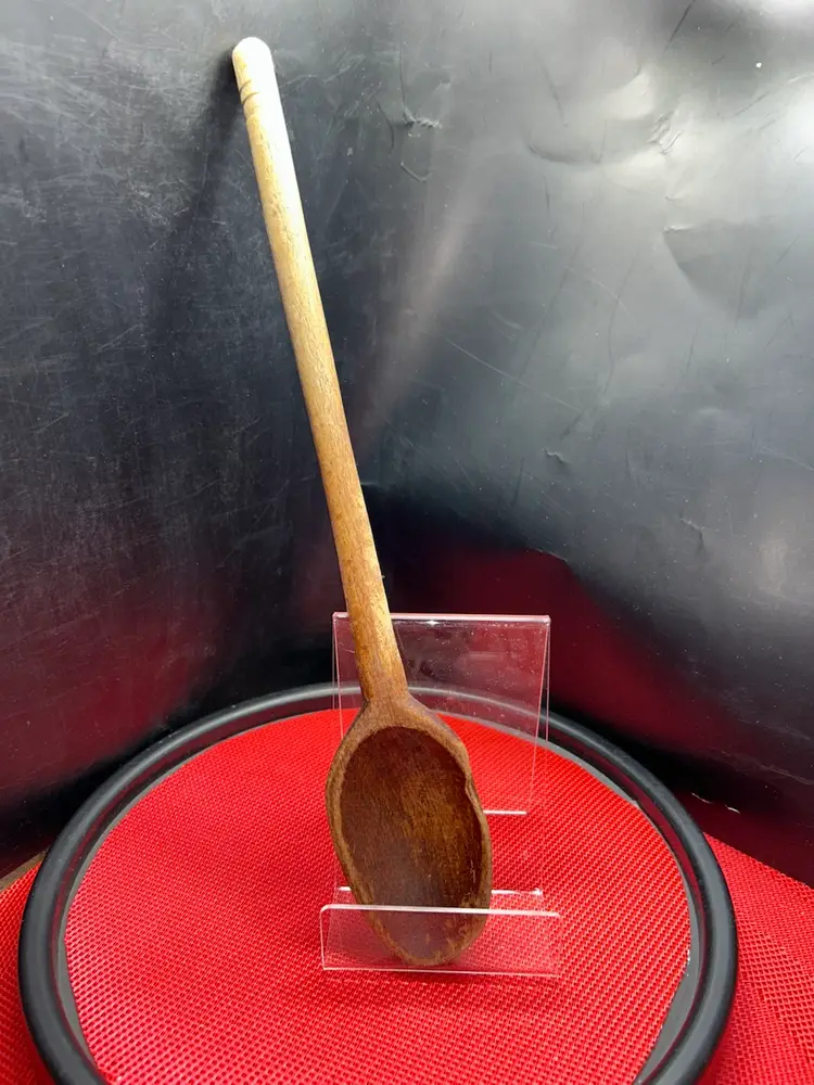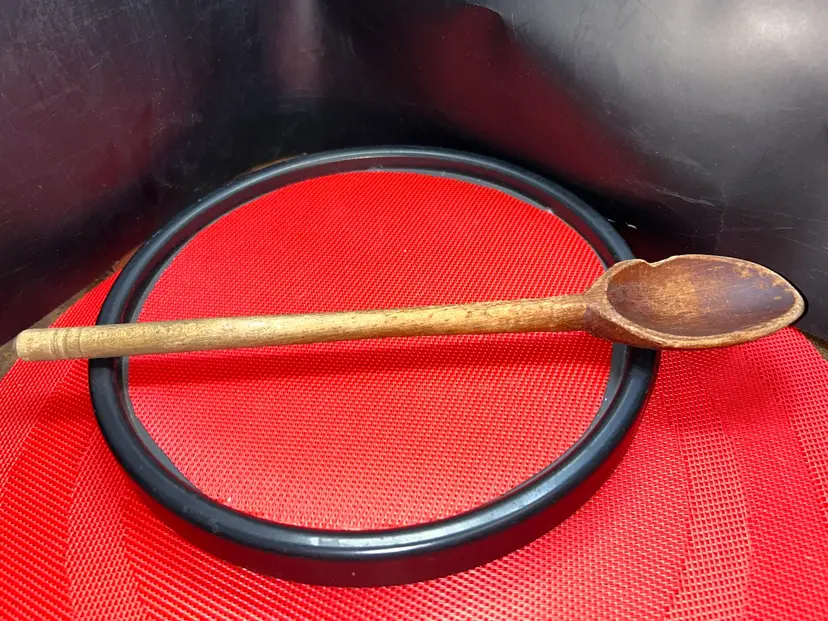 Well seasoned wooden spoon. 12.75” long,?bowl of spoon is 2” wide, handle is slightly less than 0.5” in diameter. Bowl has a piece broken off; very old damage as the gap is the same color and patina as the rest of the spoon. Ridges at the top of handle circle the entirety of the circumference.