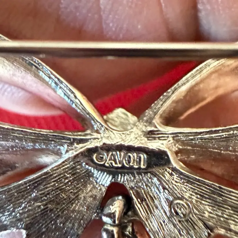 VINTAGE ANTIQUE PIN BROOCH Designer Signed Avon Bow Silver Tone Red Stone