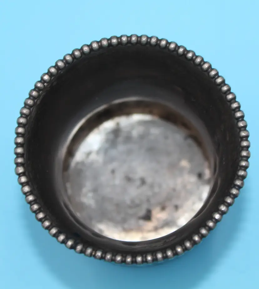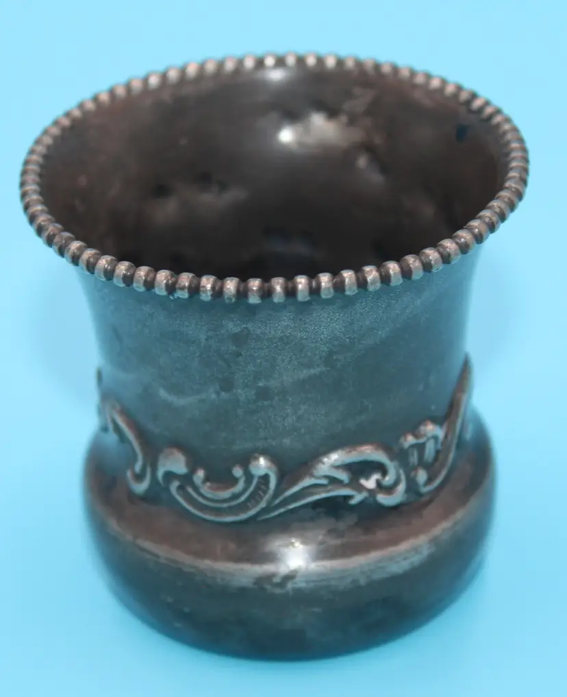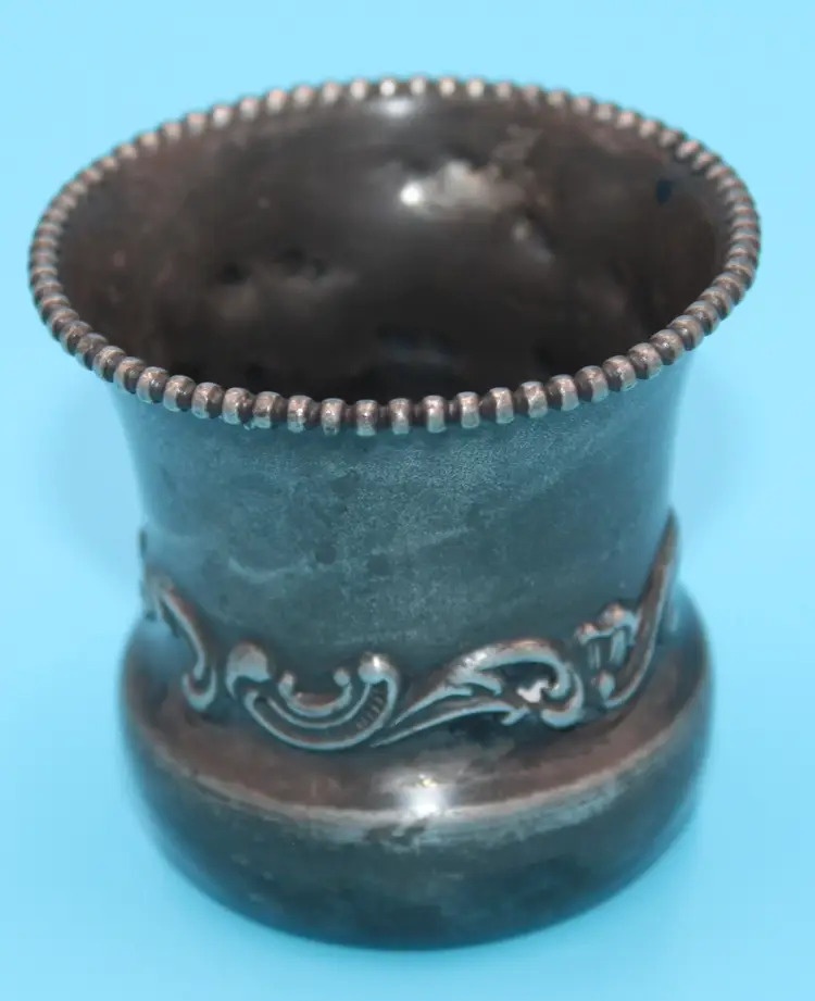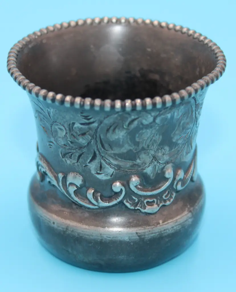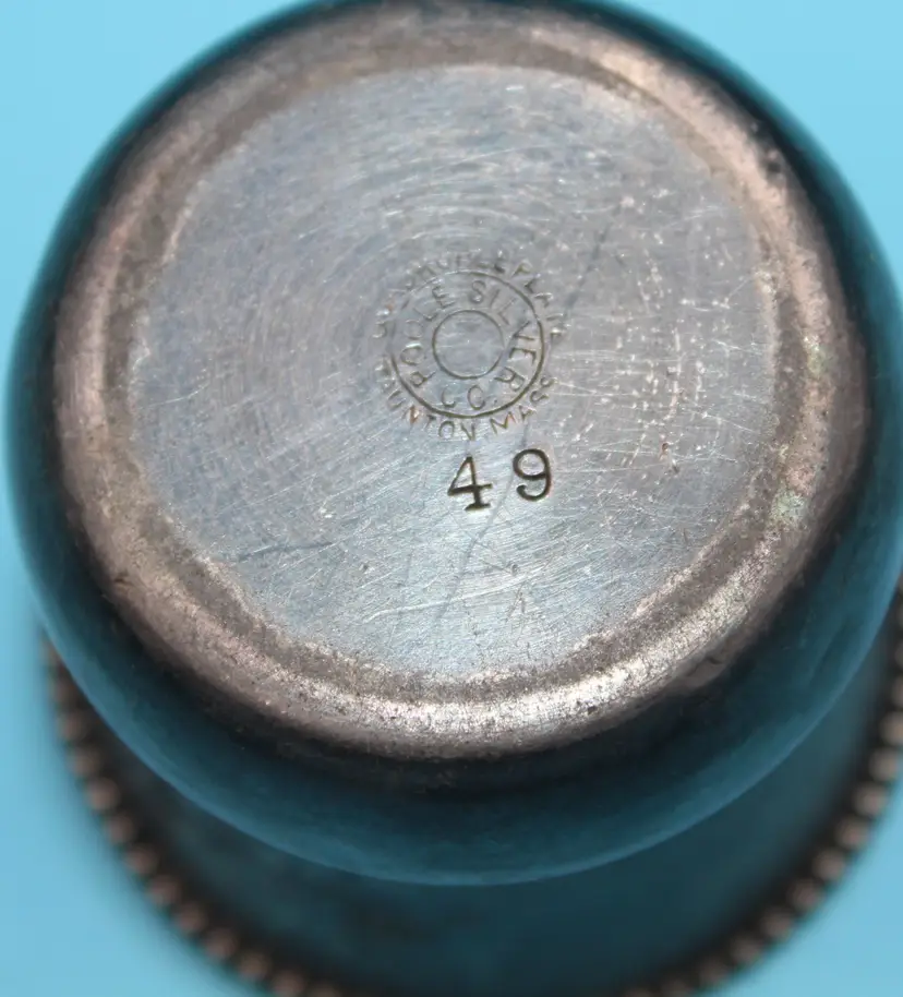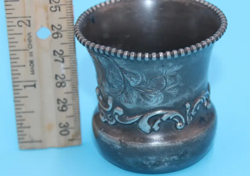 Cute tiny cup, about 2 inches tall and wide. Etched design and monogrammed. Seems to be GES. Markings clear on the bottom. Quadruple Plated. Poole Silver Company was in business in Taunton, Mass from 1892 - 1971. Design # 49. Could hold toothpicks on your table or would be an adorable bud vase.