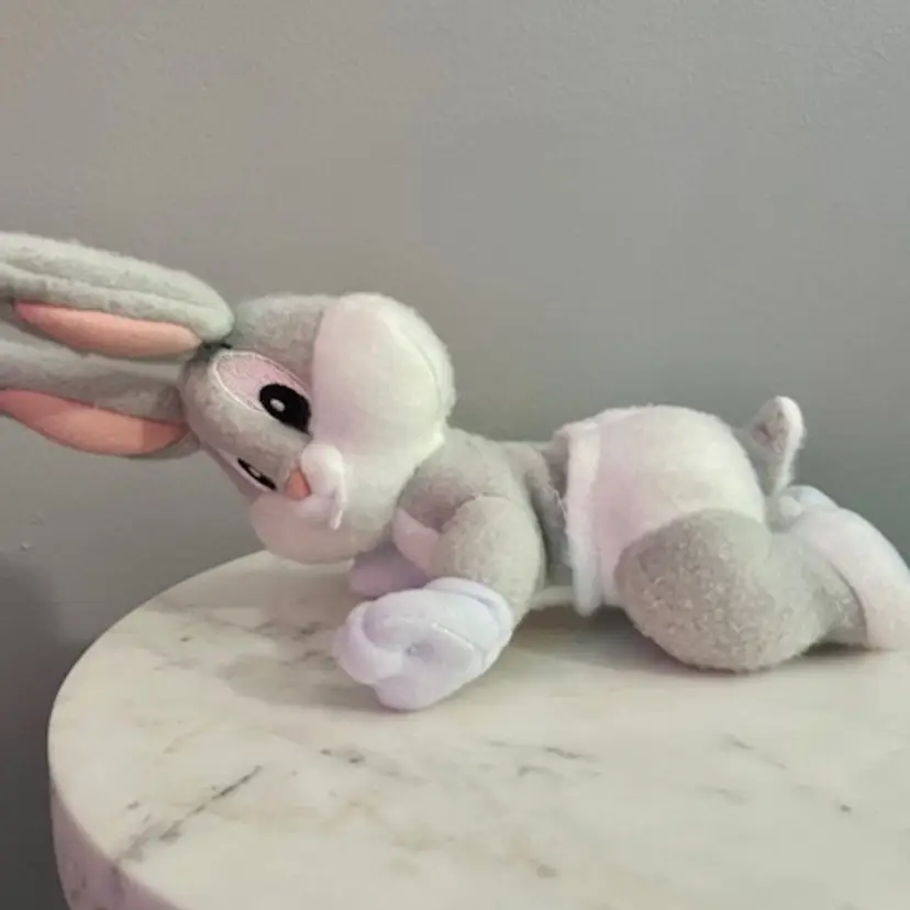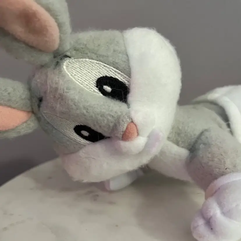 HTF baby Bugs Bunny rattle toy. In decent condition for its age. Some pilling on the plush as shown. A few minor areas of discoloration. Please closely review photos for details. Measures approximately 10.5” long from ears to feet. This comes from a smoke free and dog friendly home. Message me with any questions.