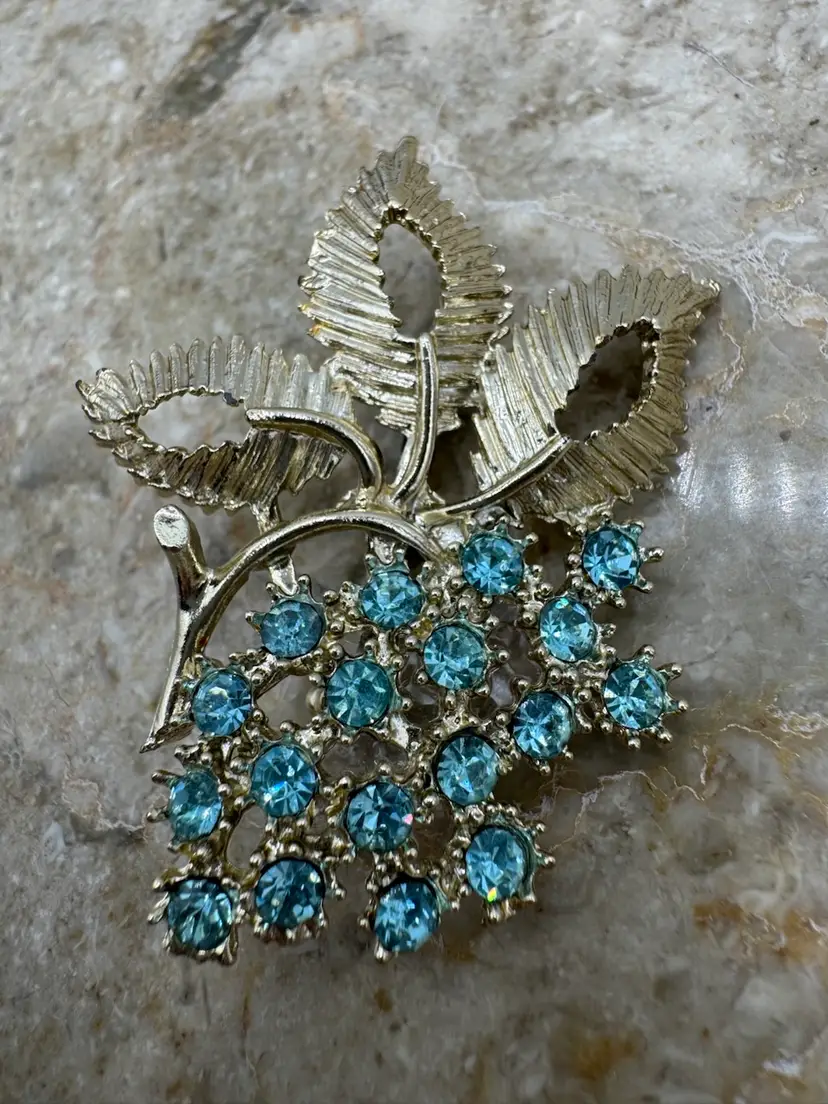 Vintage Aqua Rhinestone Brooch Leaf & Grape Cluster Design. Beautiful gold tone approach no missing rhinestones. Excellent condition. Measures 2 1/4” X 2”