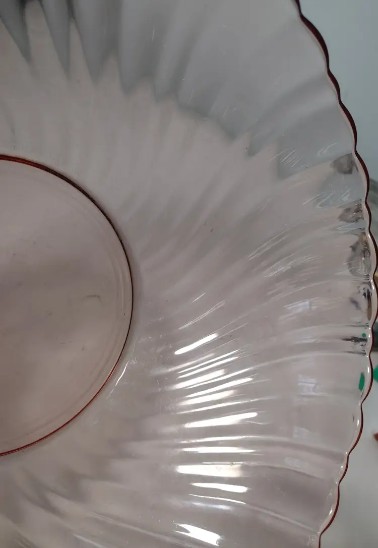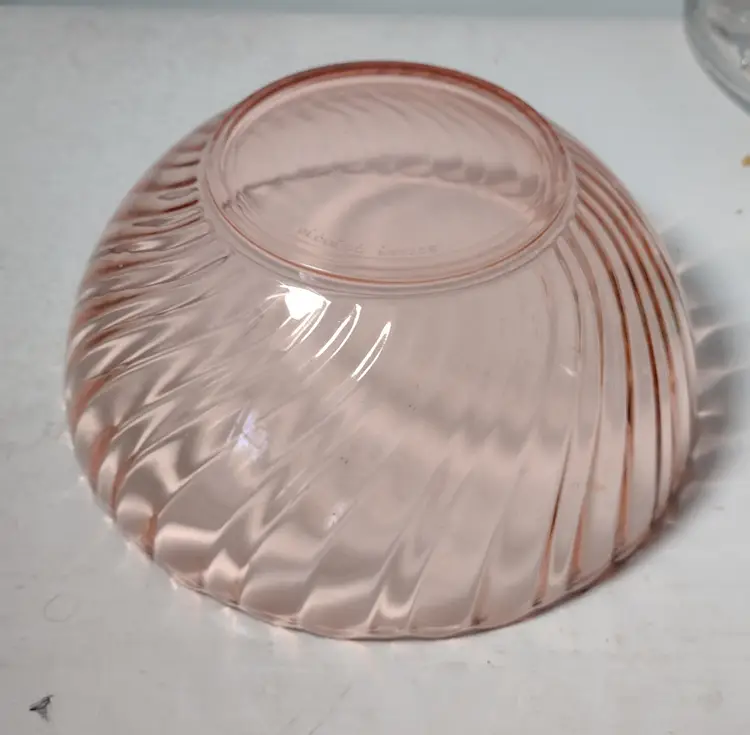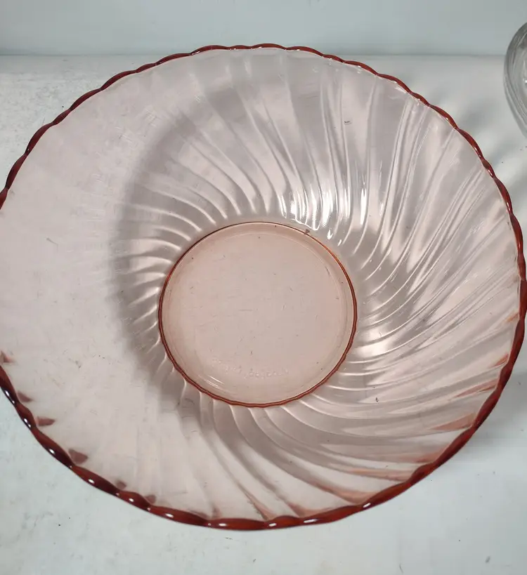 This is a beautiful pink swirl glass bowl that catches the light nicely. This is great for serving many things. Bowl measures 9" diameter x 4.25" tall.