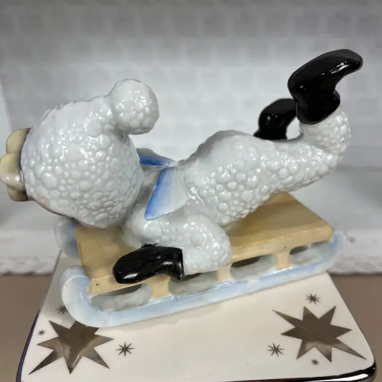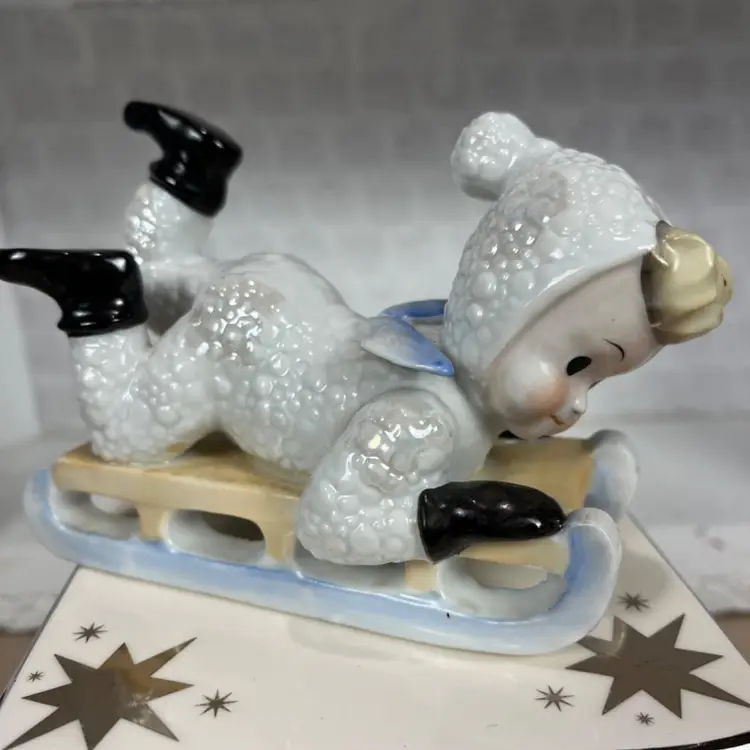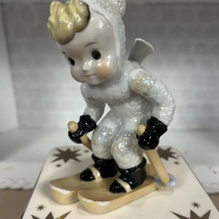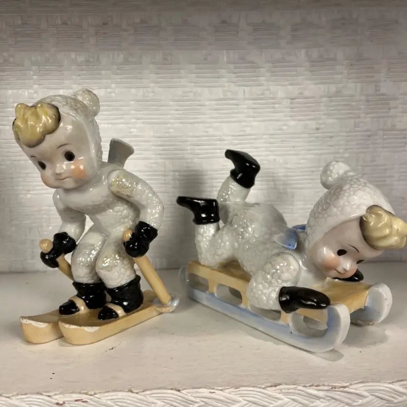 Hard-to-find vintage Norcrest (I believe the mark on the bottom is the Norcrest mark) Snow Baby Angels - one skiing and one sledding - ceramic figurines. These adorable guys are just fantastic and will look great displayed all winter! The skier is approximately 5" tall and the sled is about 5" long. Pre-owned and in used condition. Expect normal wear such as scuffs or scratches. It looks like they have a luster finish which has mostly worn off. One small chip or defect was noted on the bottom edge of the sled. See photos and ask any questions prior to purchase.