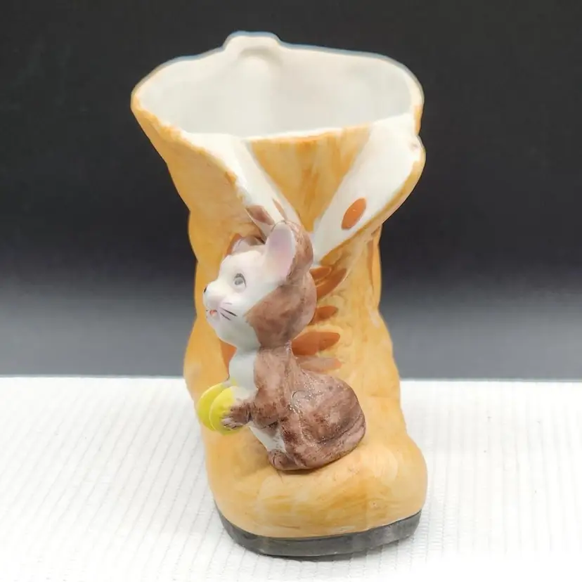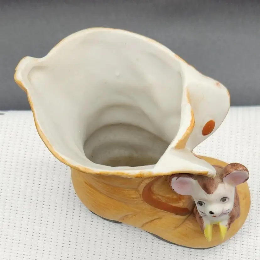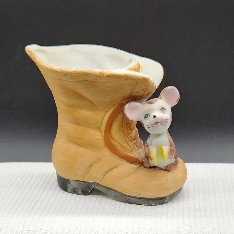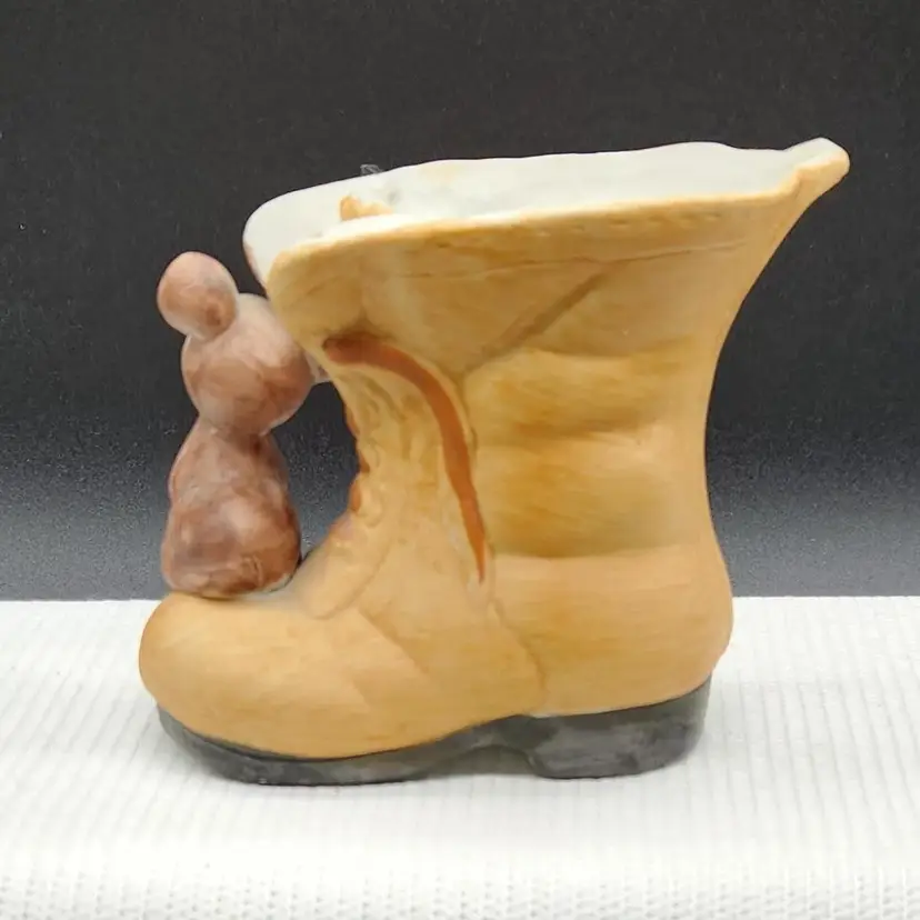 Charming ceramic planter featuring a cute mouse beside a classic boot, perfect for adding a whimsical touch to your home decor. 3.5 In H 4.5 in L 2.75 in W