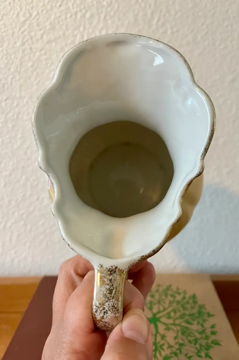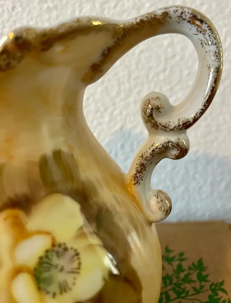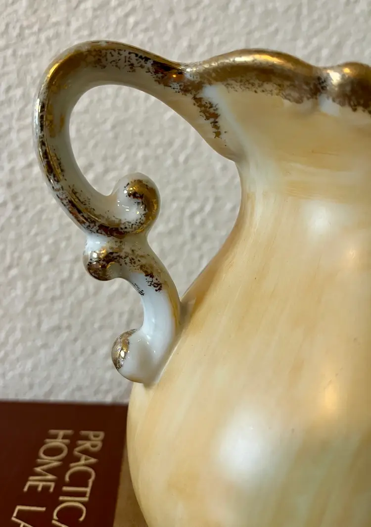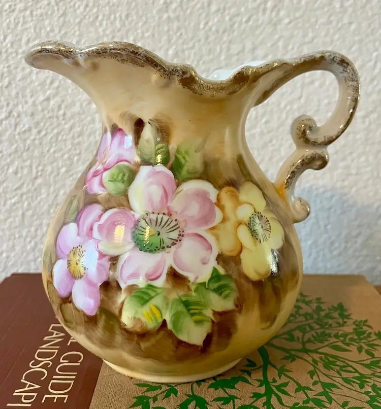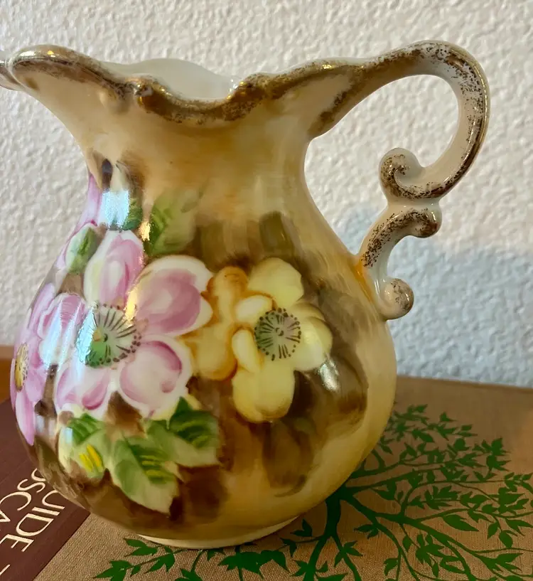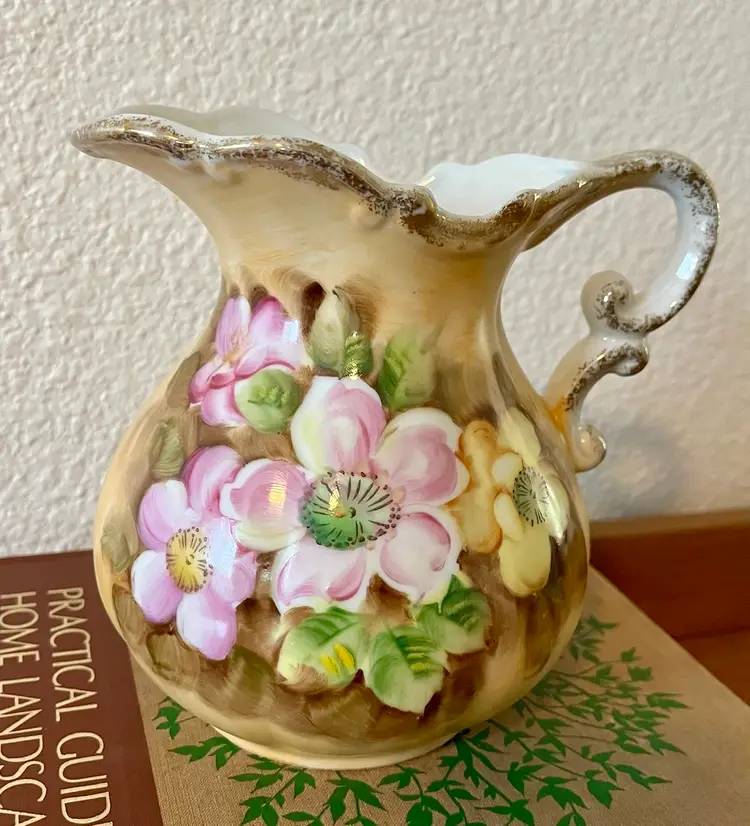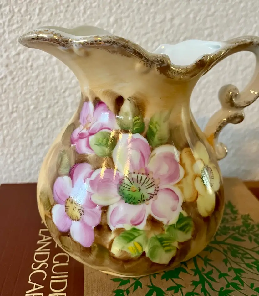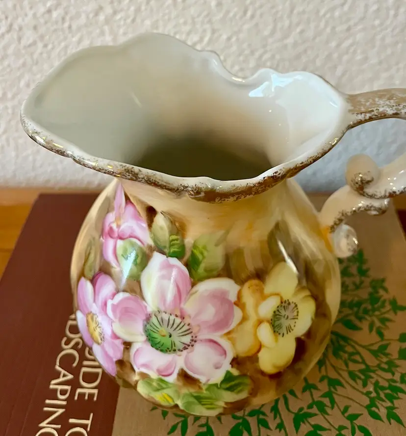 Vintage ARDCO Fine Quality Dallas Porcelain C2100 Water Pitcher Made in Japan. Beautiful hand painted pink yellow floral design. Approximately 6” tall, 6.5” deep to handle, 5.5” wide with minor surface wear and discoloration inside. No chips or cracks. Would make a beautiful vase as well.