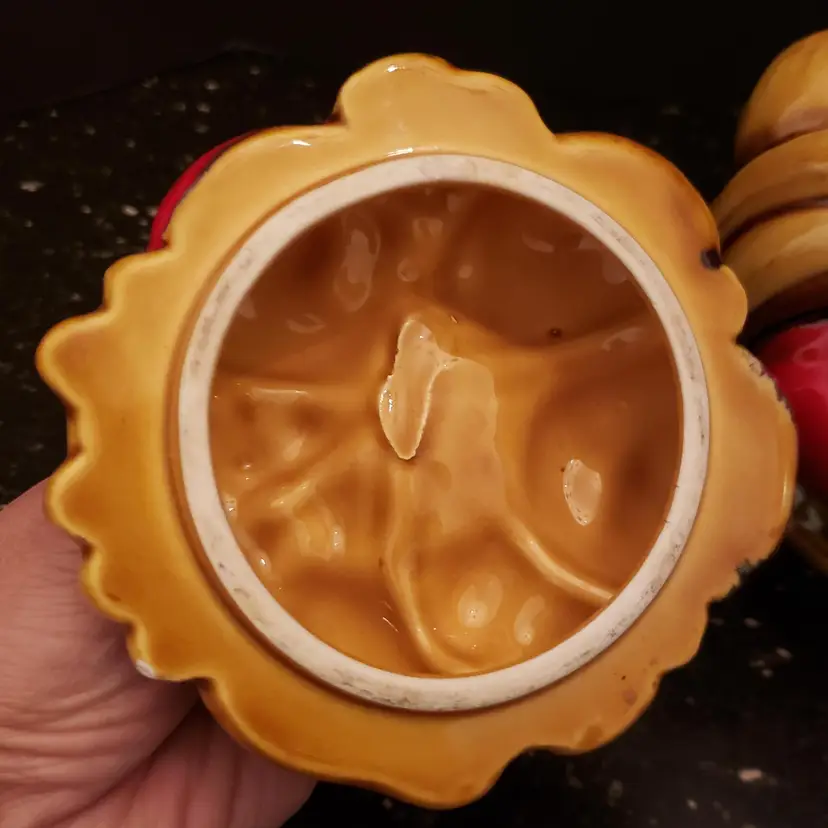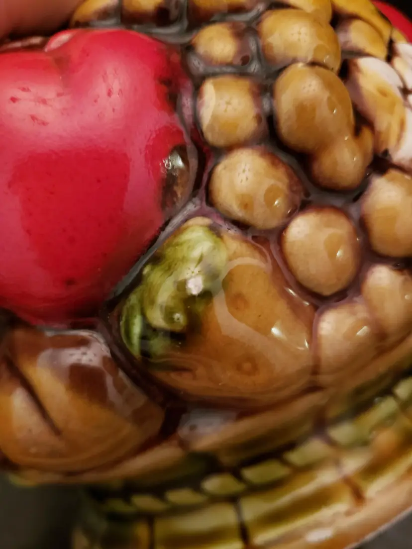 Retro and cute! Fruit motif cookie biscuit jar or bowl with lid. Marked C 1722 on the bottom.