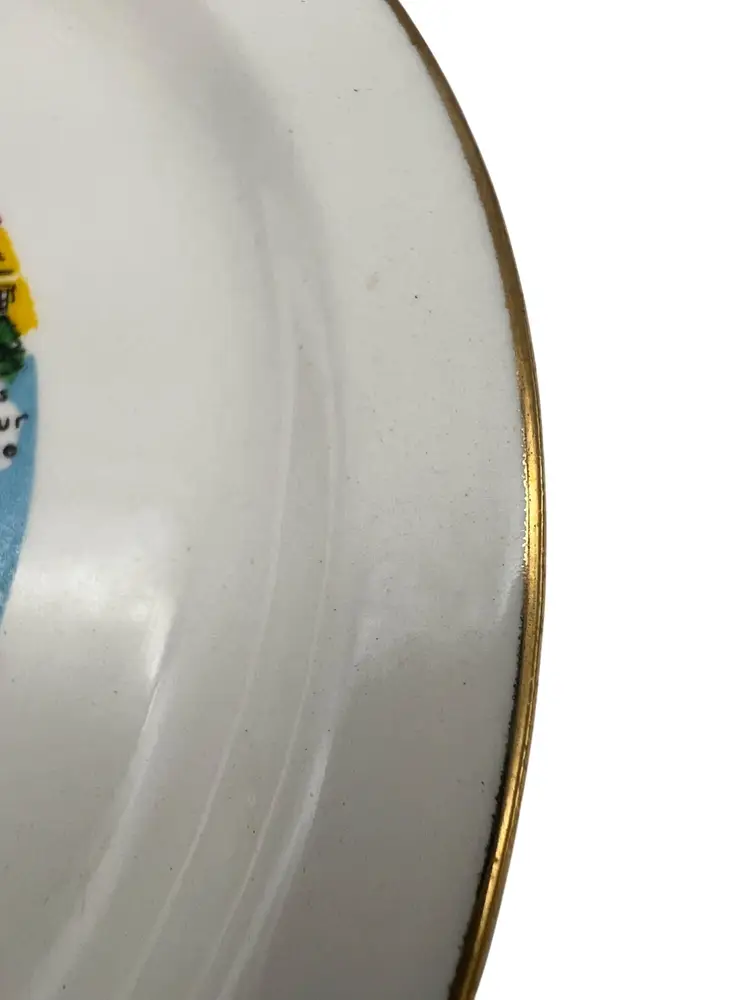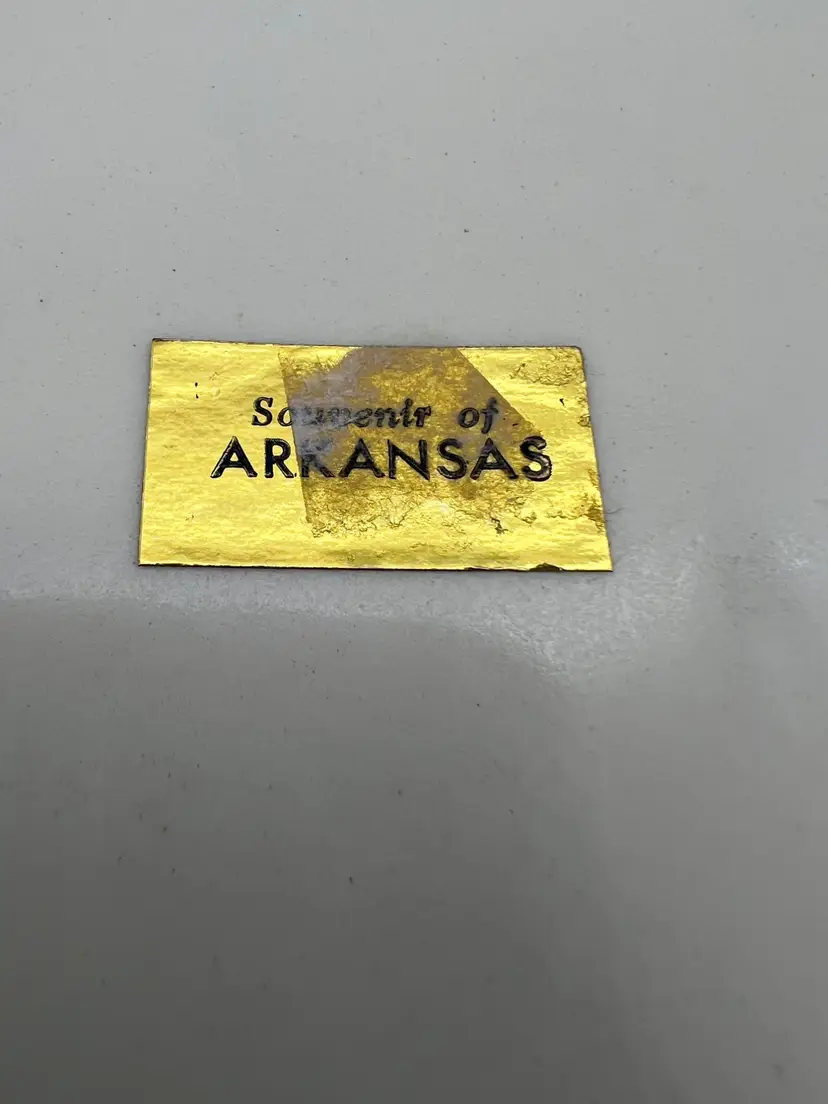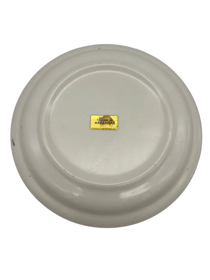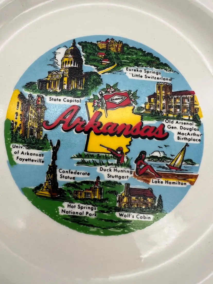 Vintage 7.5″ souvenir plate featuring Arkansas landmarks (State Capitol, Hot Springs, Eureka Springs “Little Switzerland,” Wolf’s Cabin, Lake Hamilton, Stuttgart duck hunting, MacArthur birthplace). White ceramic with gold metallic rim. Great addition for Arkansas collectors or mid-century Americana displays.