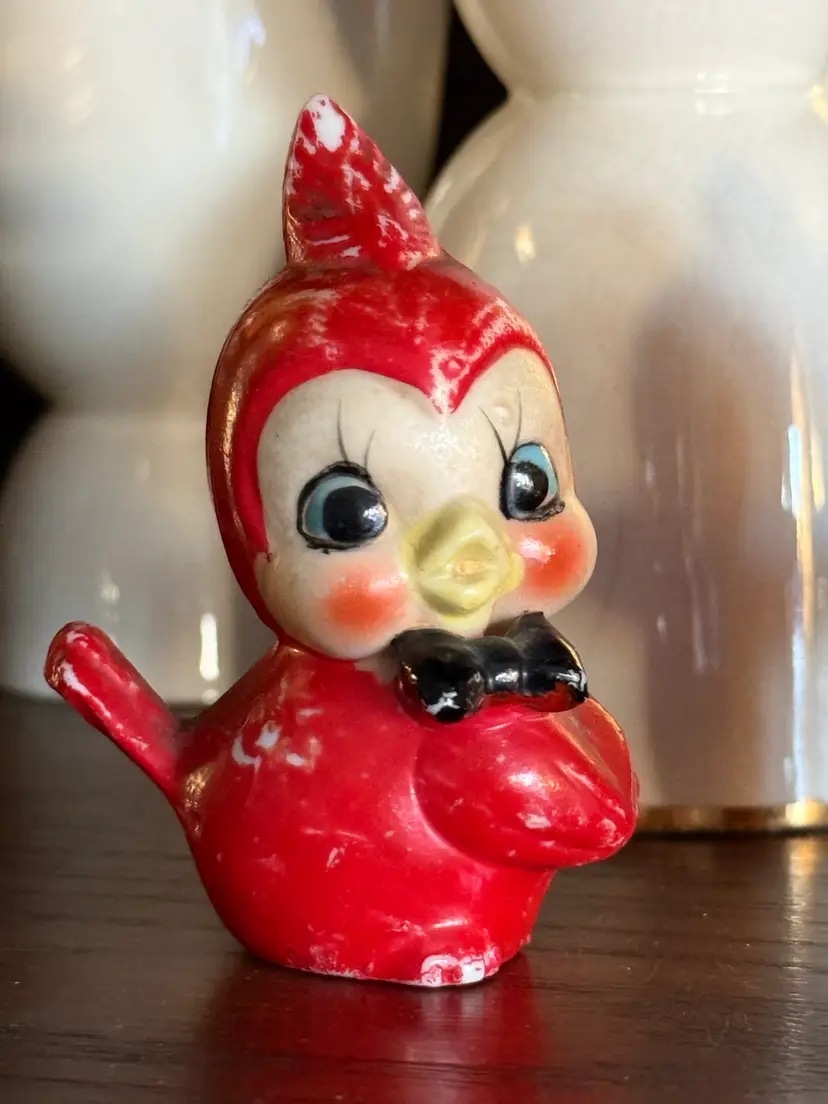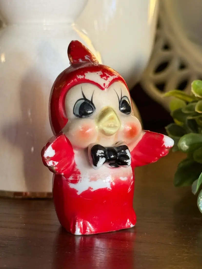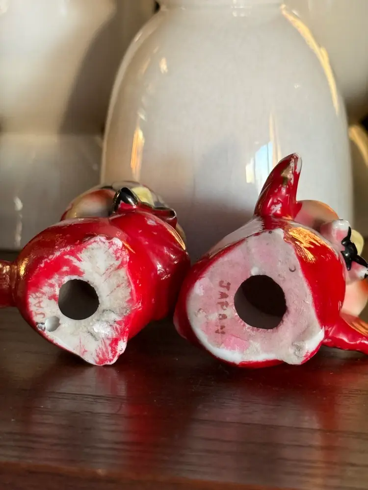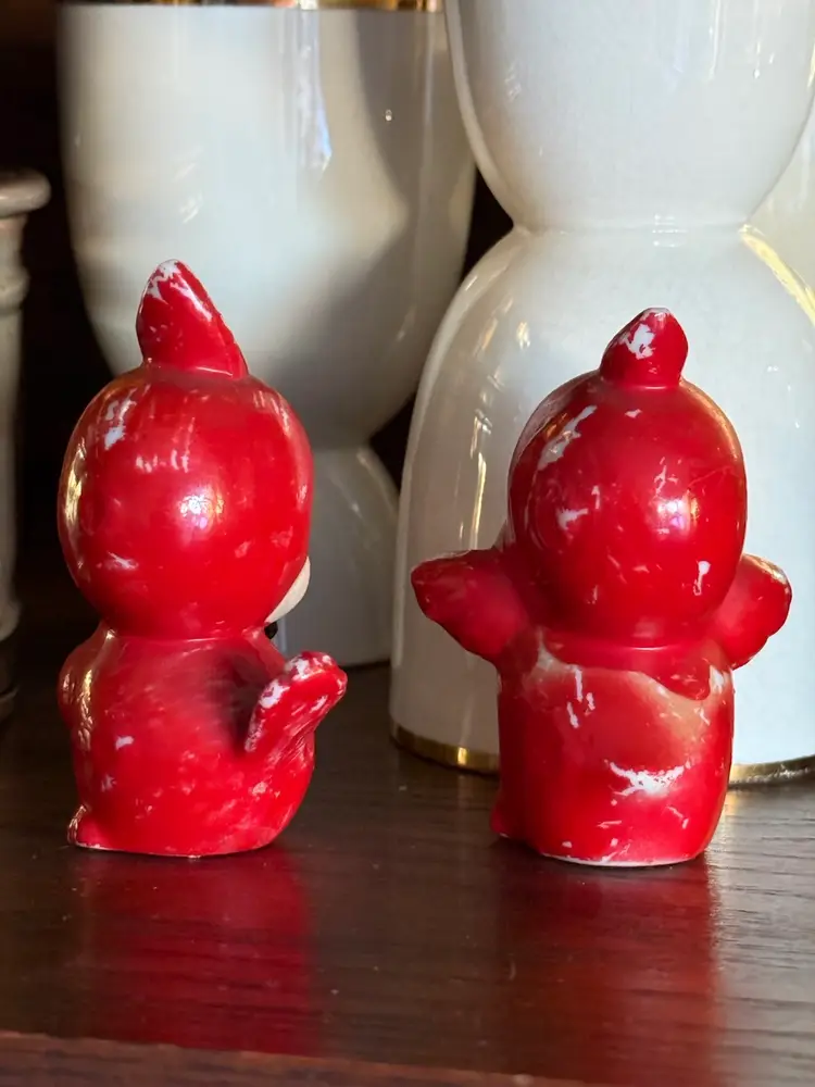 Add a touch of vintage charm to any space with this set of two Arnart Creations anthropomorphic ceramic bird figurines. Made in Japan in the 1950s, these glossy red birds are a perfect addition to any collector's mid-20th-century collection. The small size and kitschy style make them a great accent to any room. The figurines are signed Japan and come unboxed, making them a unique and rare find for any lover of decorative collectibles.