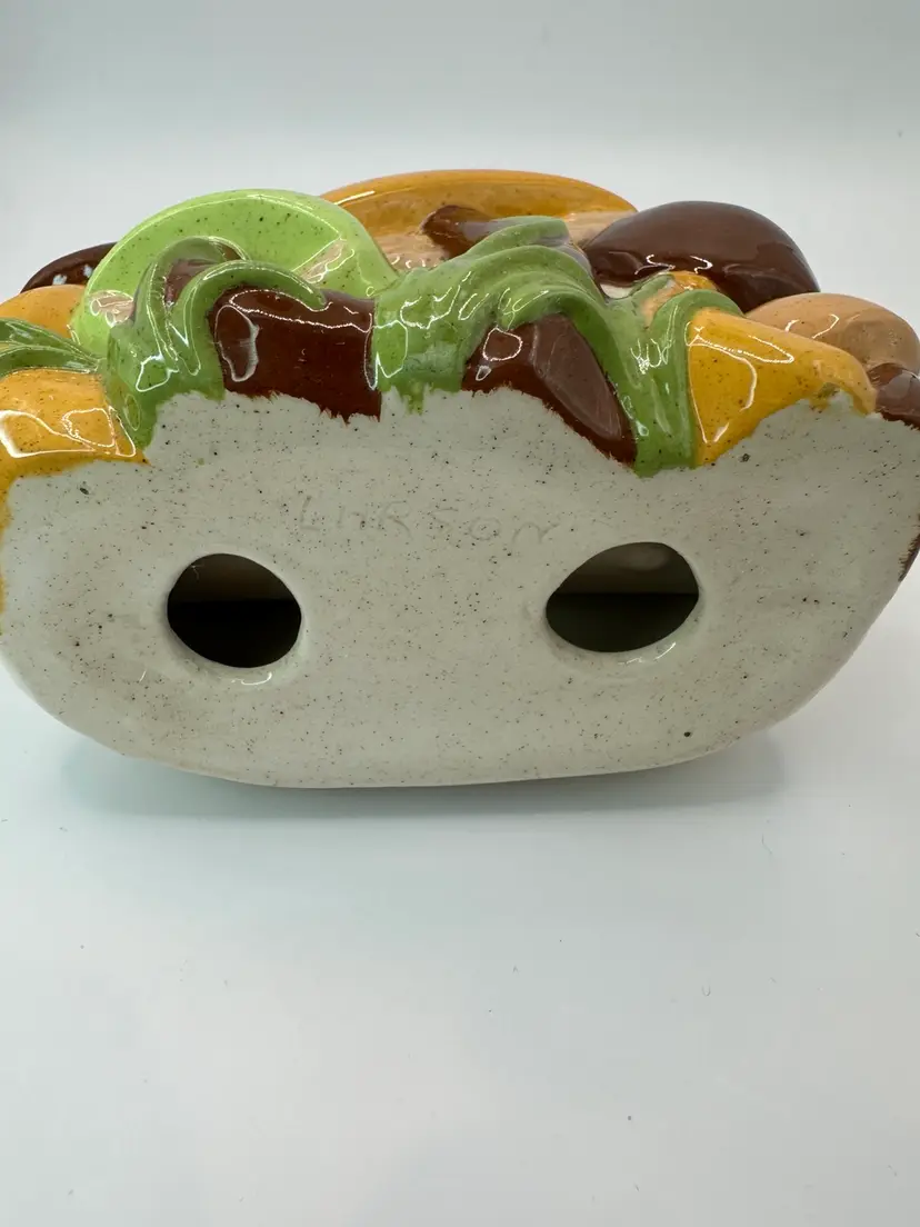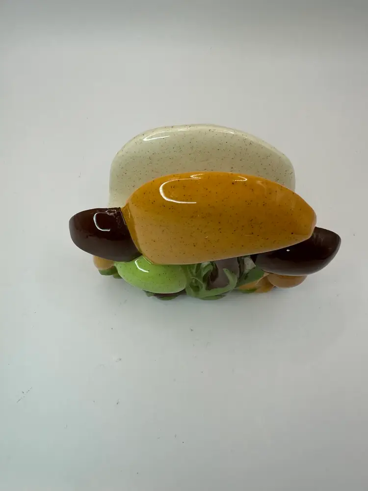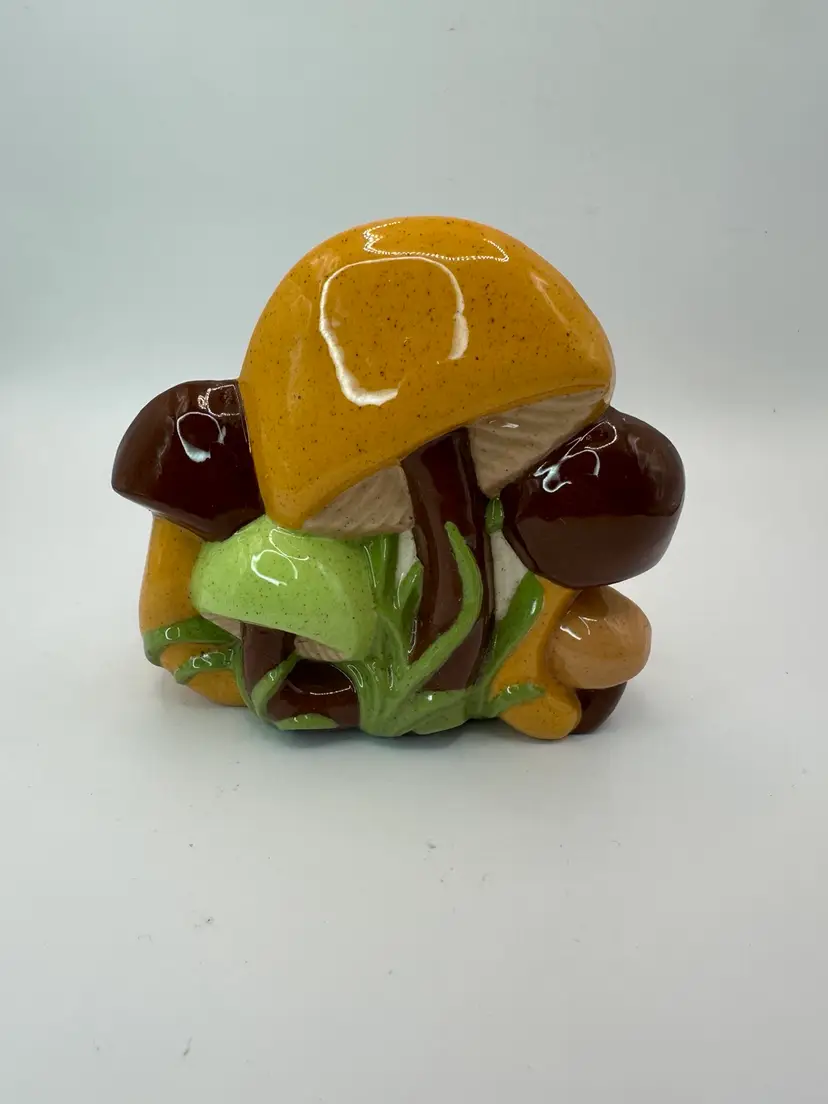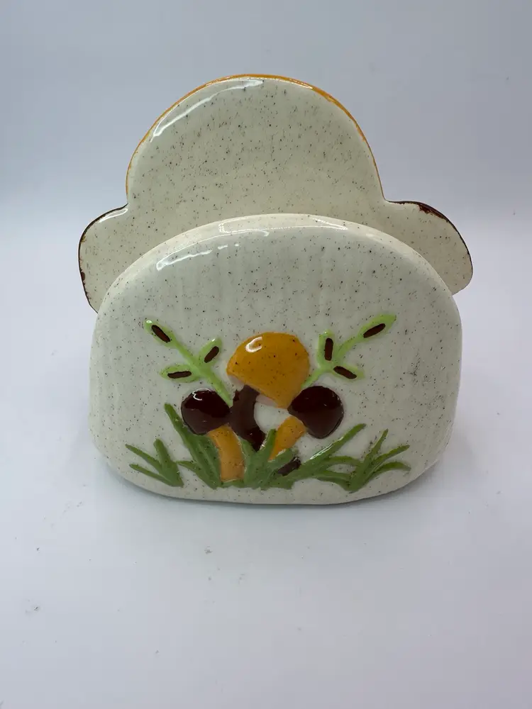 Adorable mushroom napkin holder/letters. Excellent condition. No chips or cracks. Approximate measurements: 4-1/4 in. tall 4-3/4 in. wide