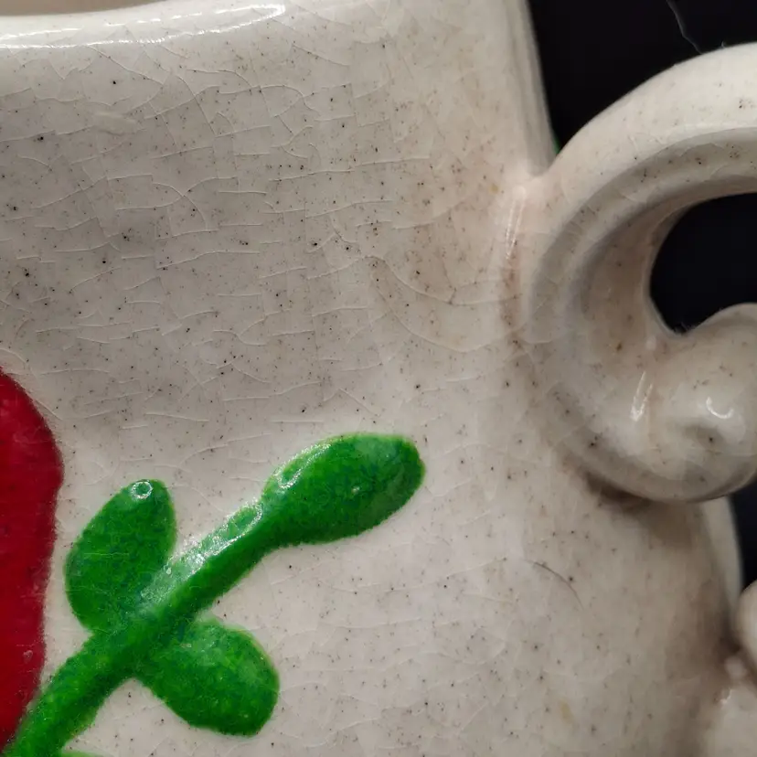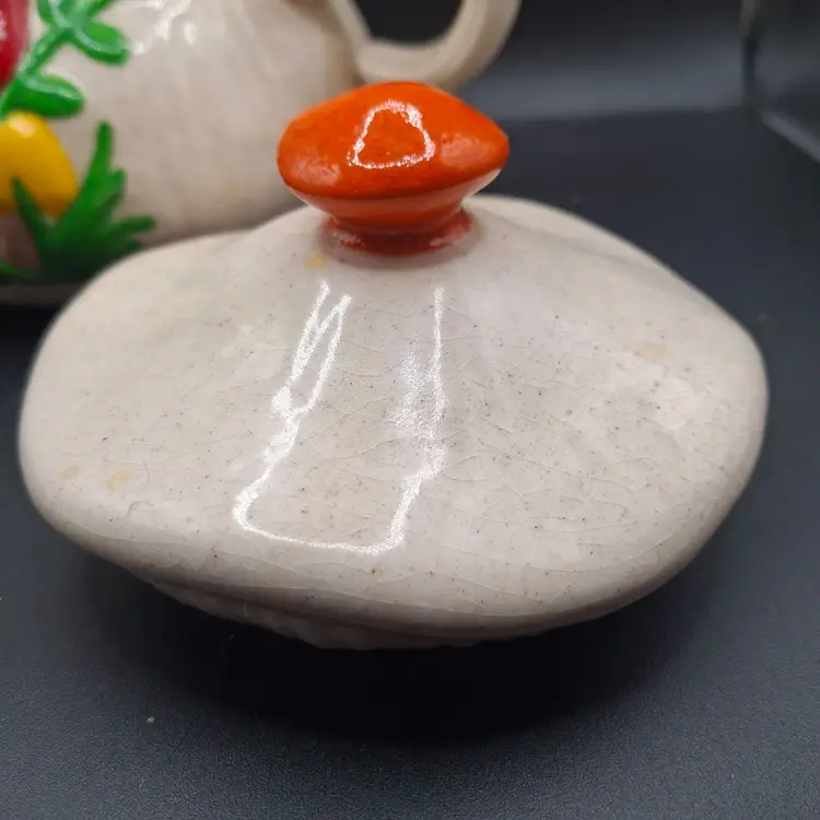 • Hand-painted mushroom design • Lid with an orange knob • Curved handle for easy grip • Glossy finish • Whimsical theme
