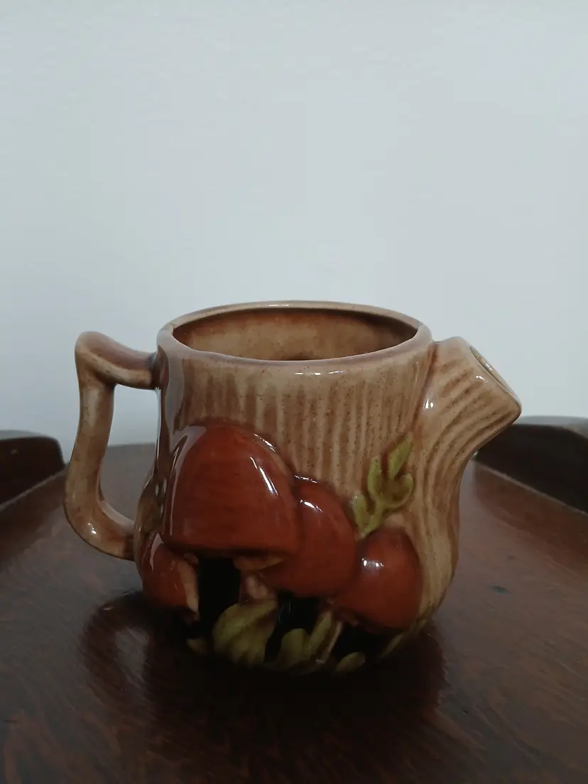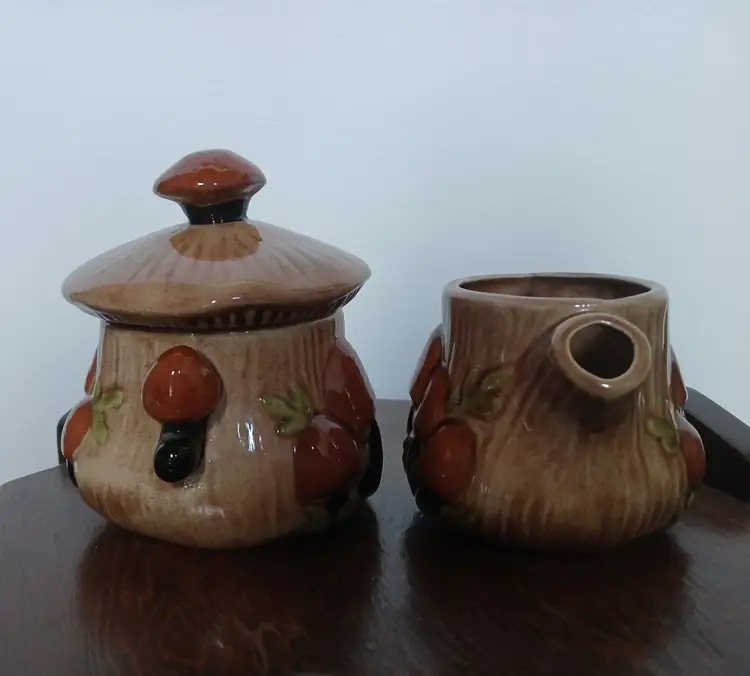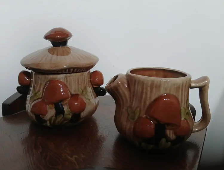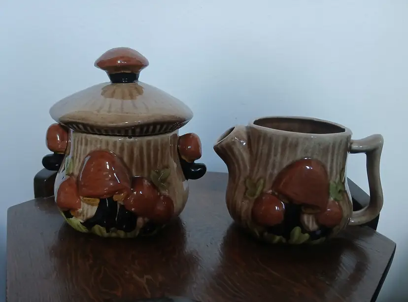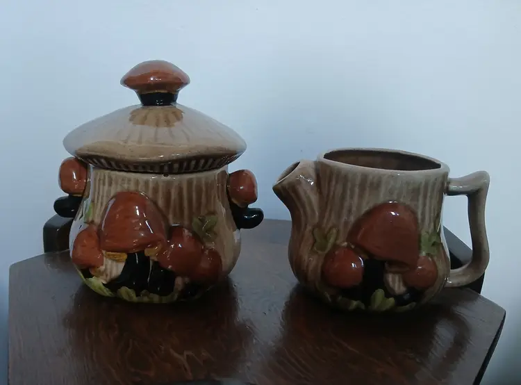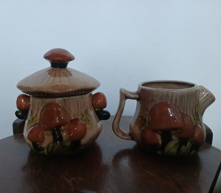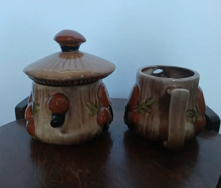 Beautiful vintage creamer and lidded sugar bowl set from Arnel's. Desirable mushroom pattern in shades of brown, tan, green, black and yellow. Great addition to your kitchen collection!