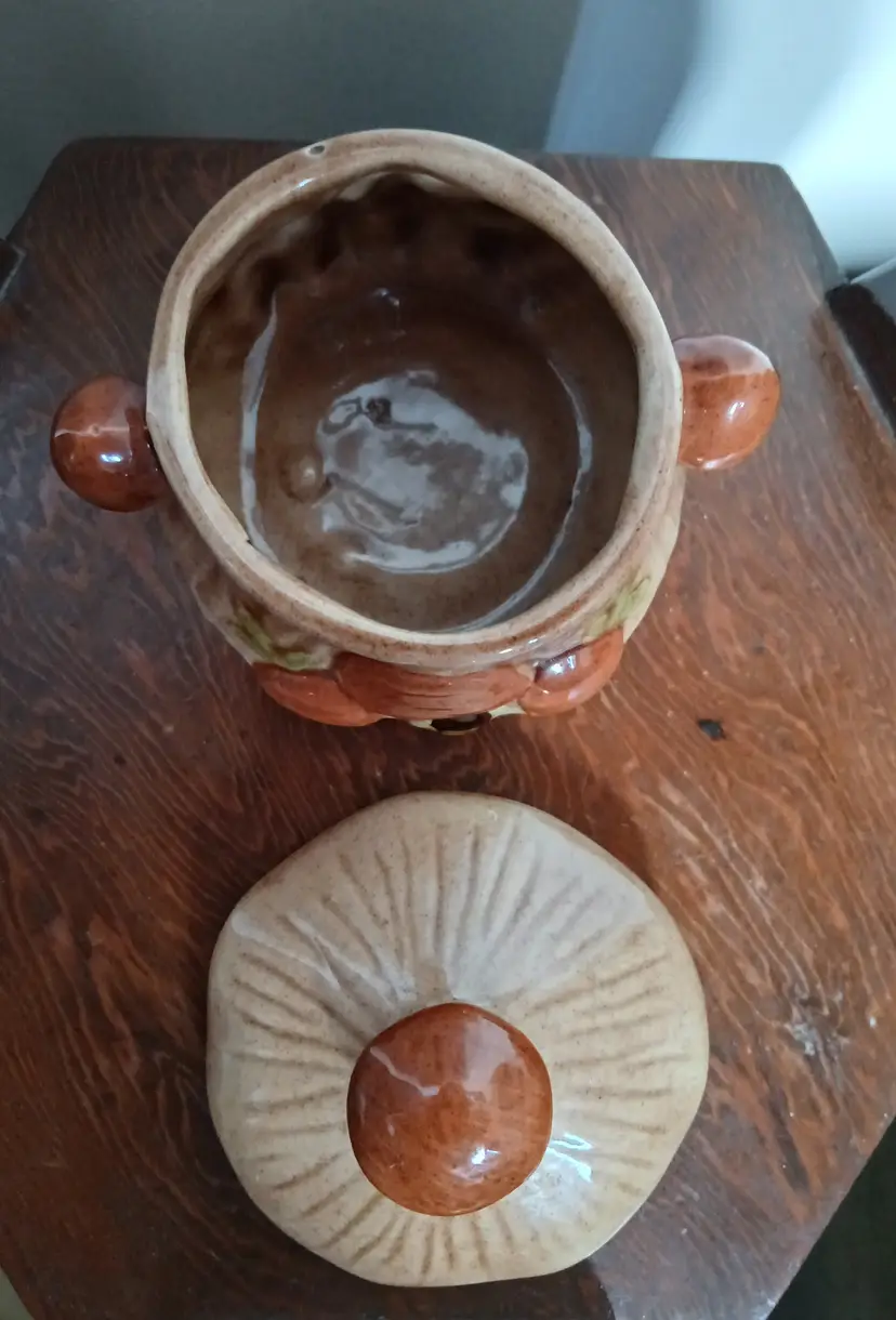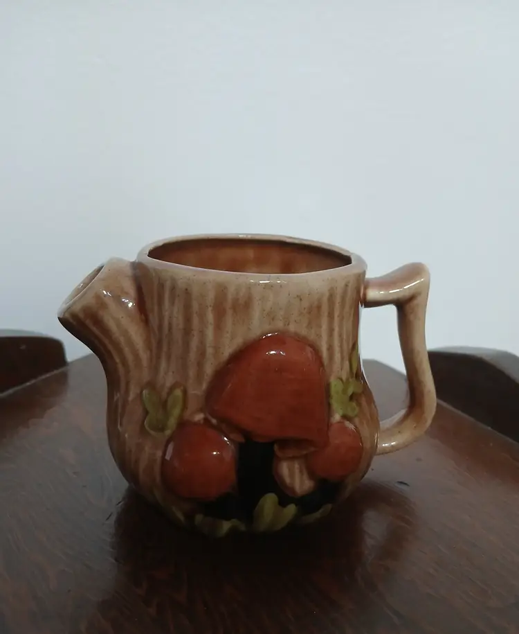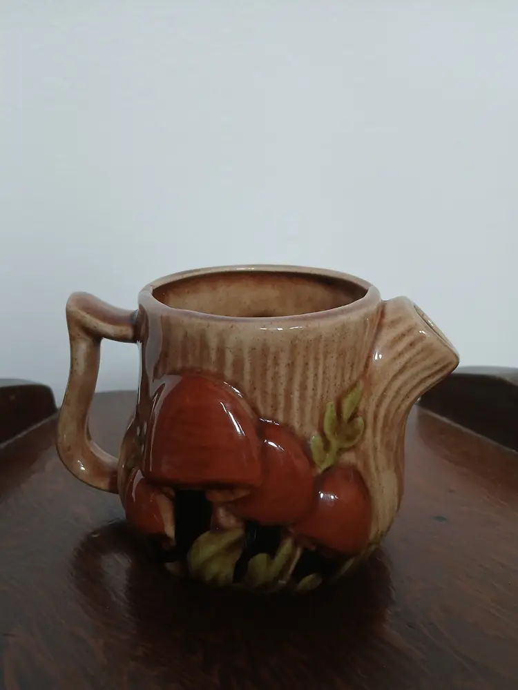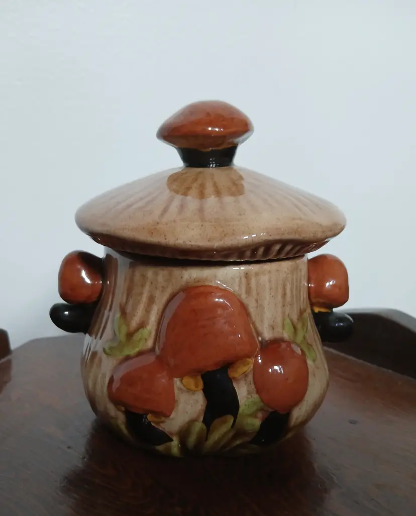 Beautiful vintage creamer and lidded sugar bowl set from Arnel's. Desirable mushroom pattern in shades of brown, tan, green, black and yellow. Great addition to your kitchen collection!