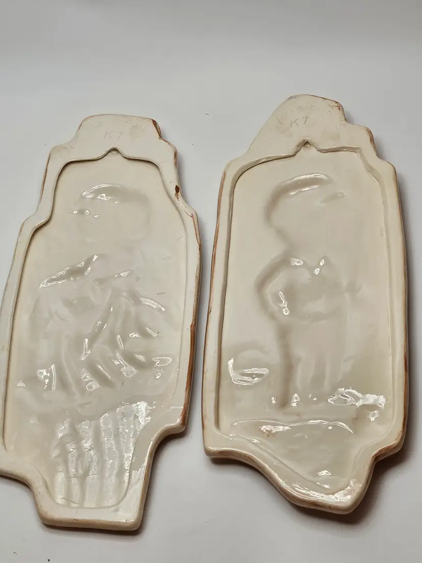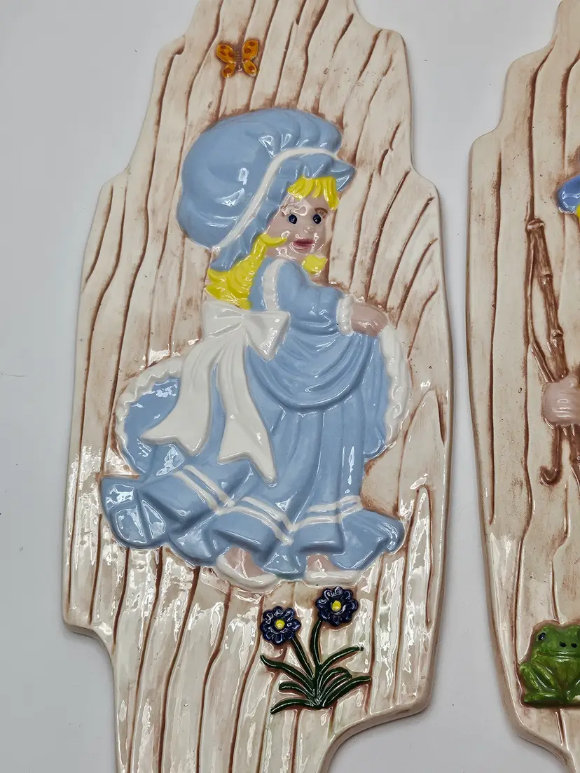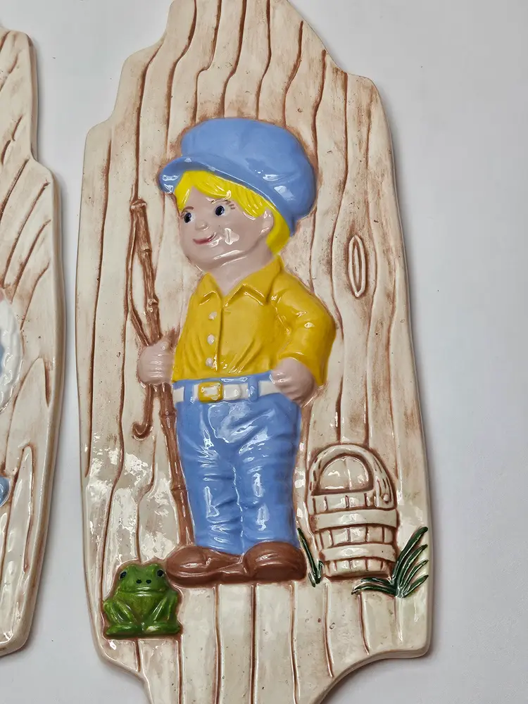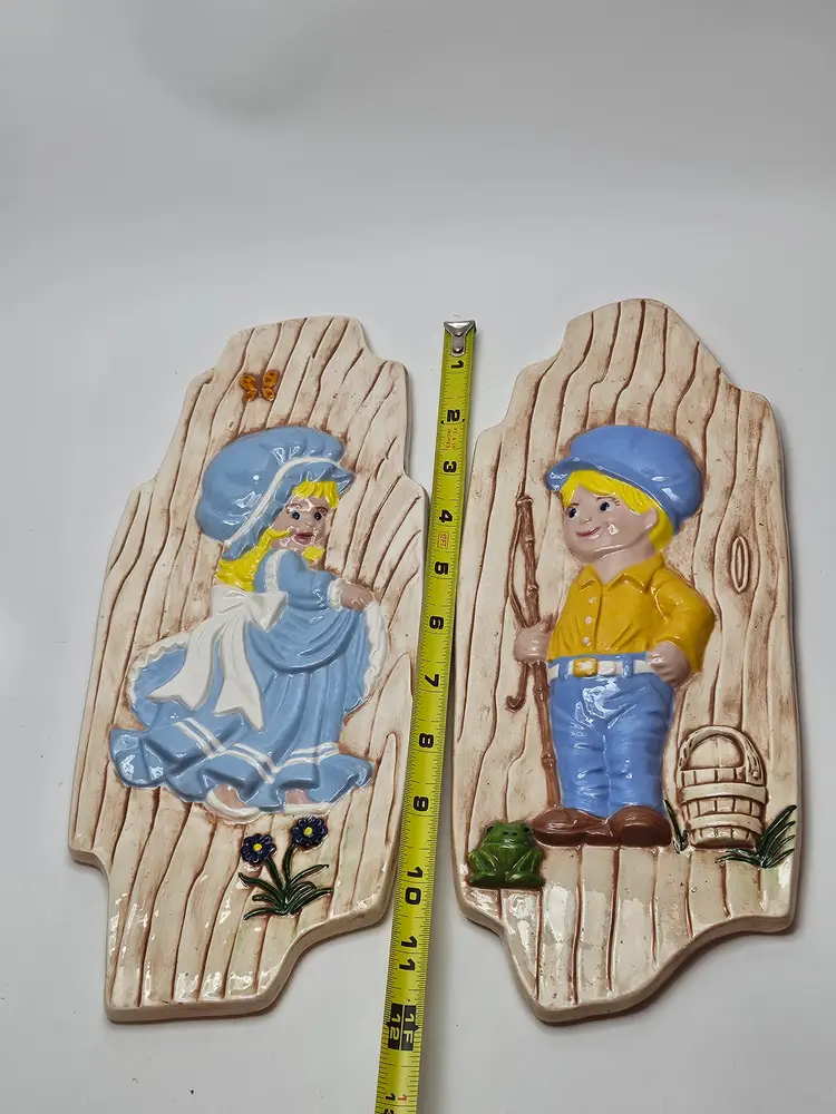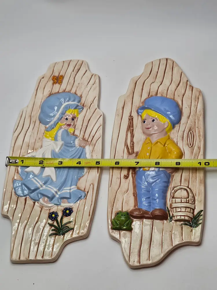 The Vintage Arnel's Wall Plaques in the Boy and Girl Pattern K7, manufactured in 1976, are a charming addition to any room. Made of clay with a glossy finish, these hand-painted wall art pieces feature a nostalgic 1970s style. Perfect for all occasions, these plaques are ideal for teens, boys, adults, girls, and kids alike. Set of two, these decorative collectibles are a unique touch to your space with their kitschy design. Add them to your entryway, bathroom, kitchen, bedroom, den, playroom, or nursery to bring a touch of retro flair to your decor.