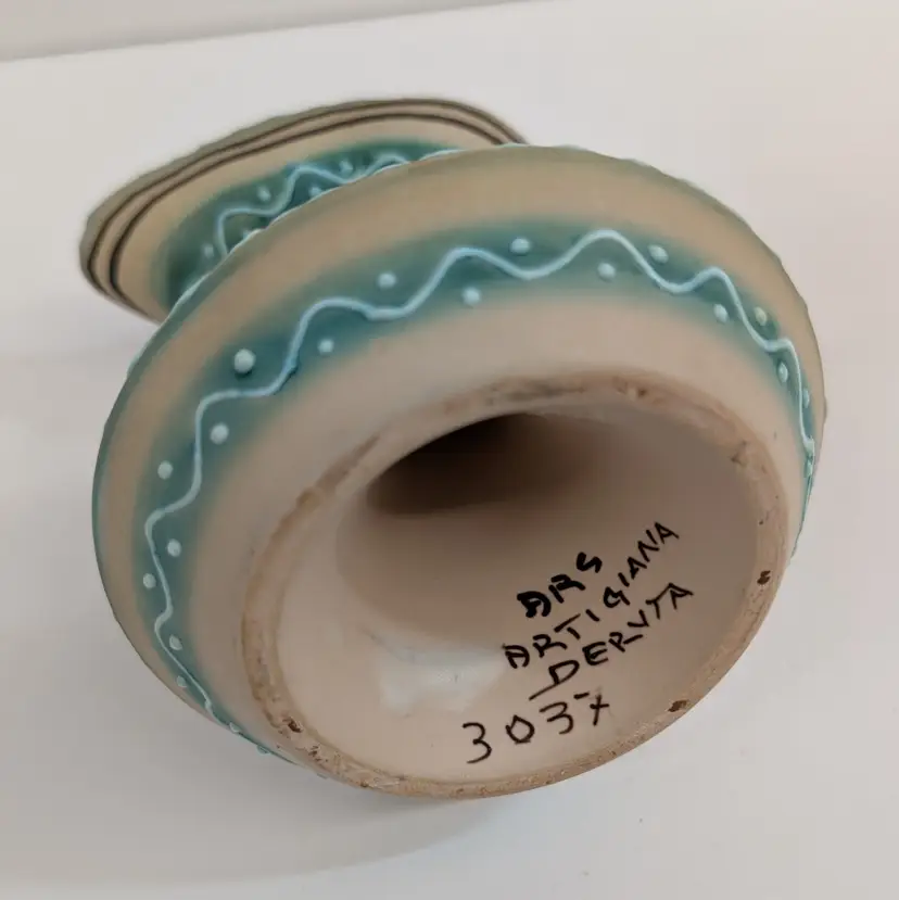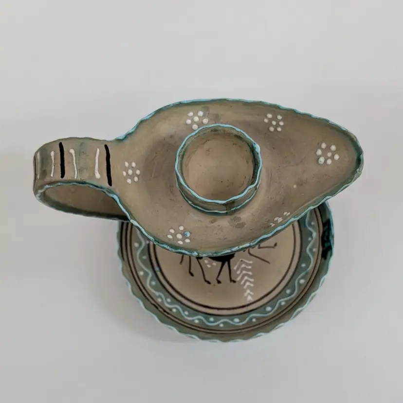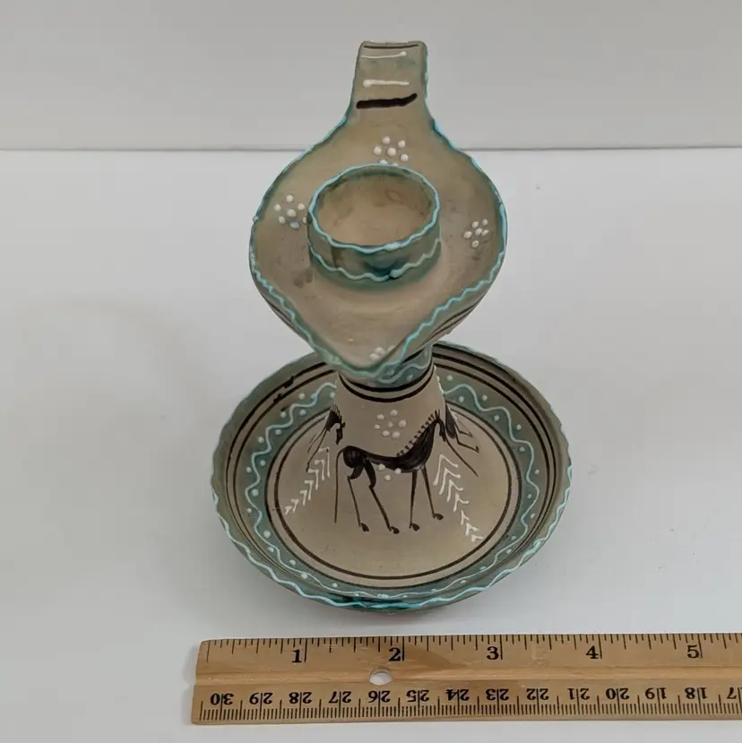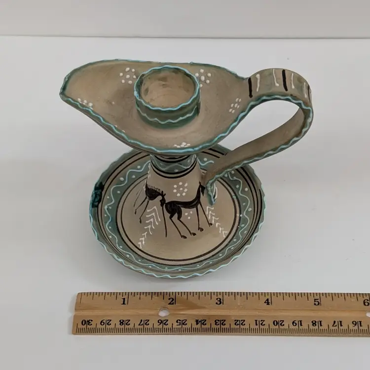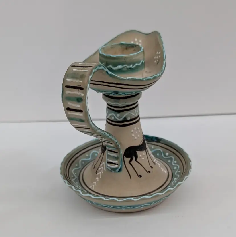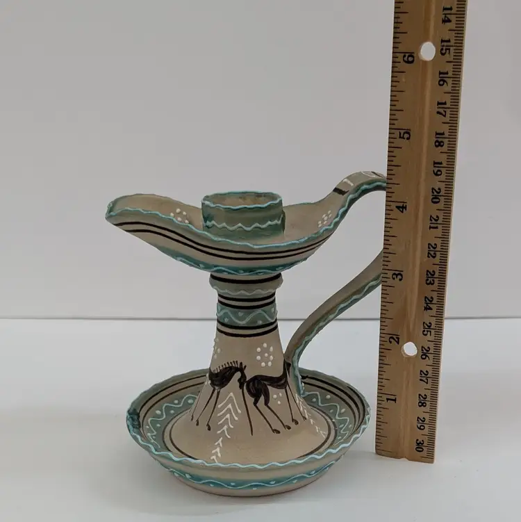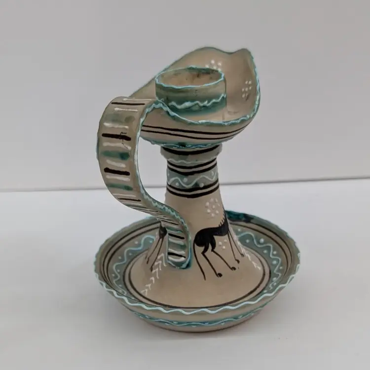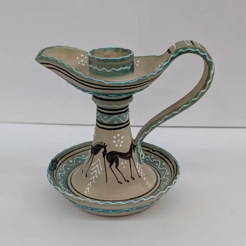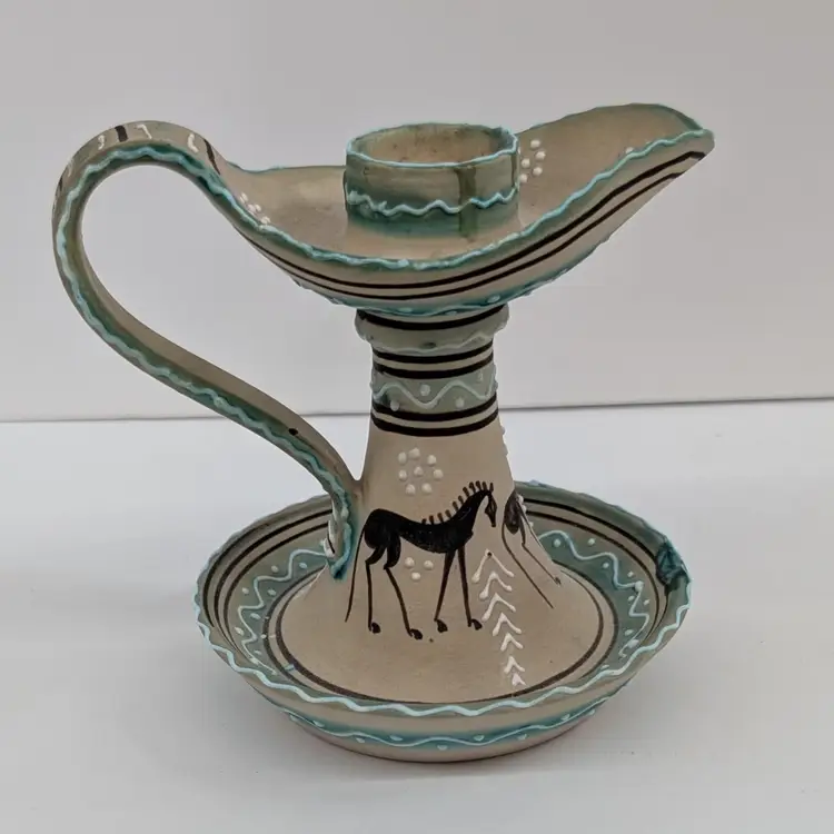 Lovely, hand painted candlestick from Deruta with a horse and raised boarder design. In nice, used condition. Measurements ~ 5 x 4 x 4.25"