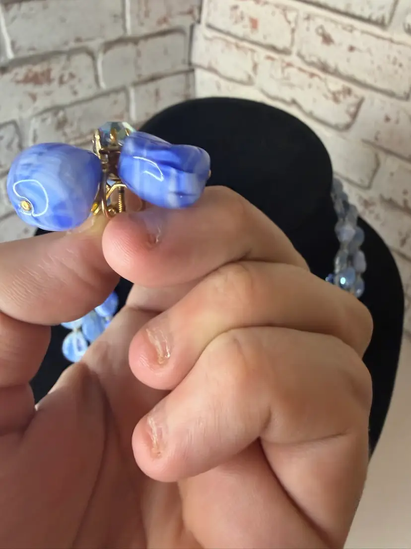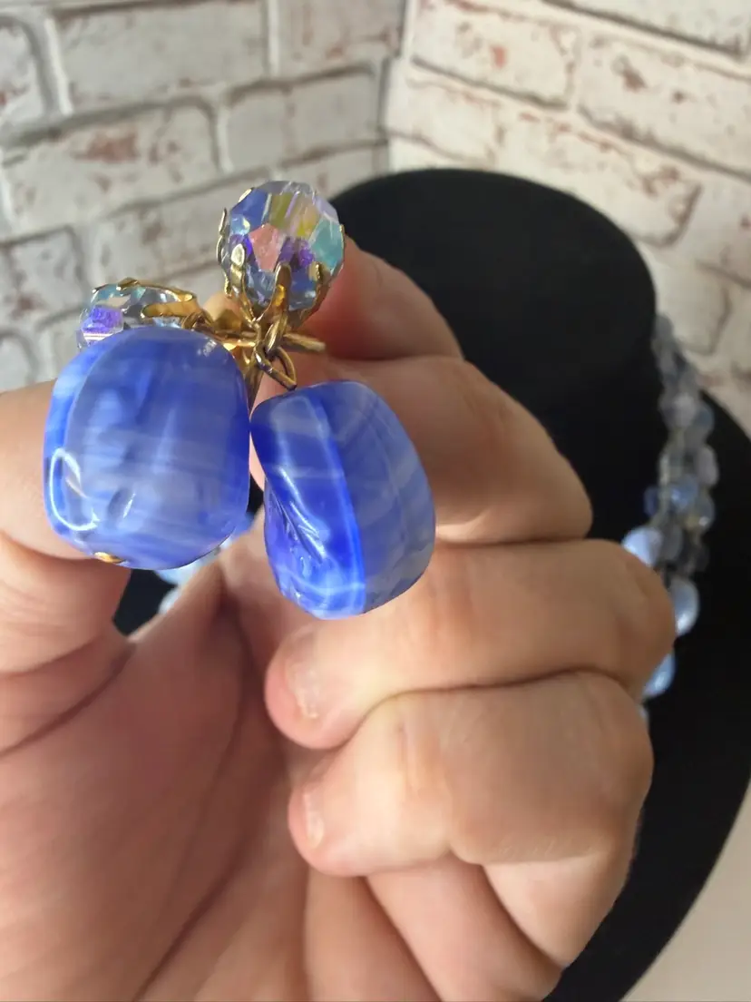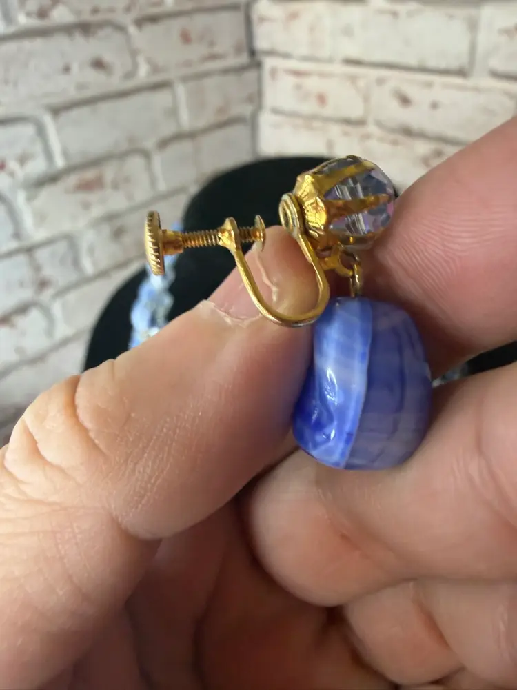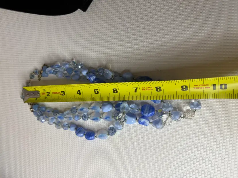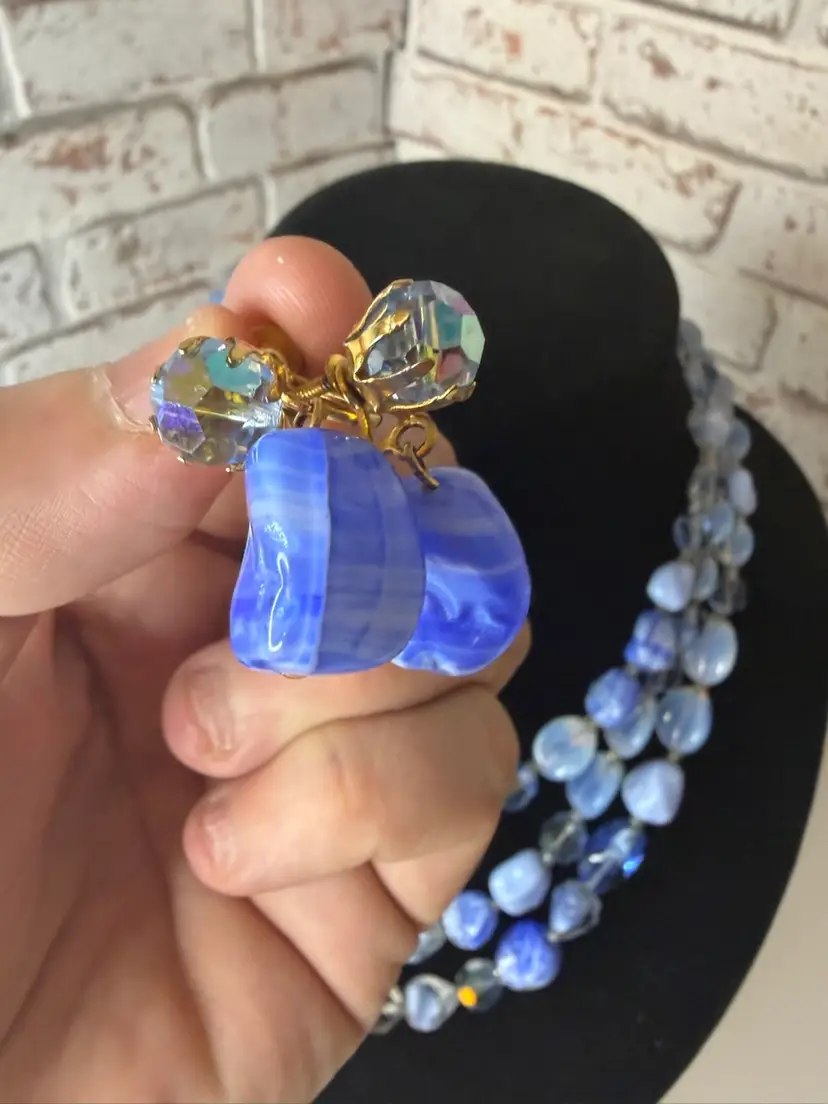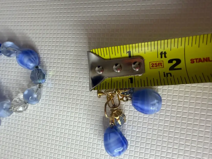 Measures 9” earring one 1” glass and beads pretty blue and with in glow it turns a light purple