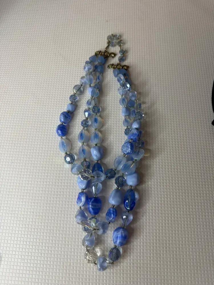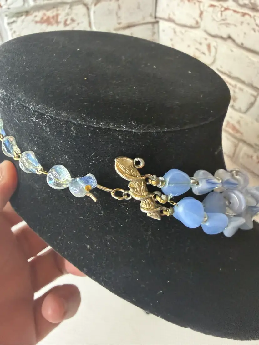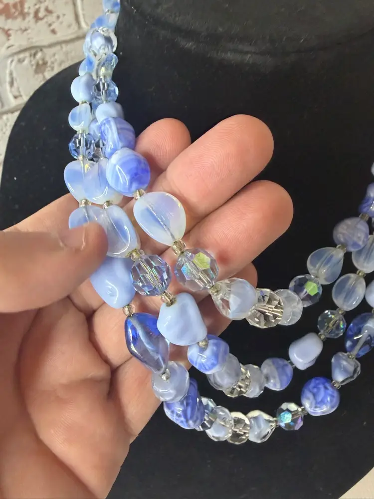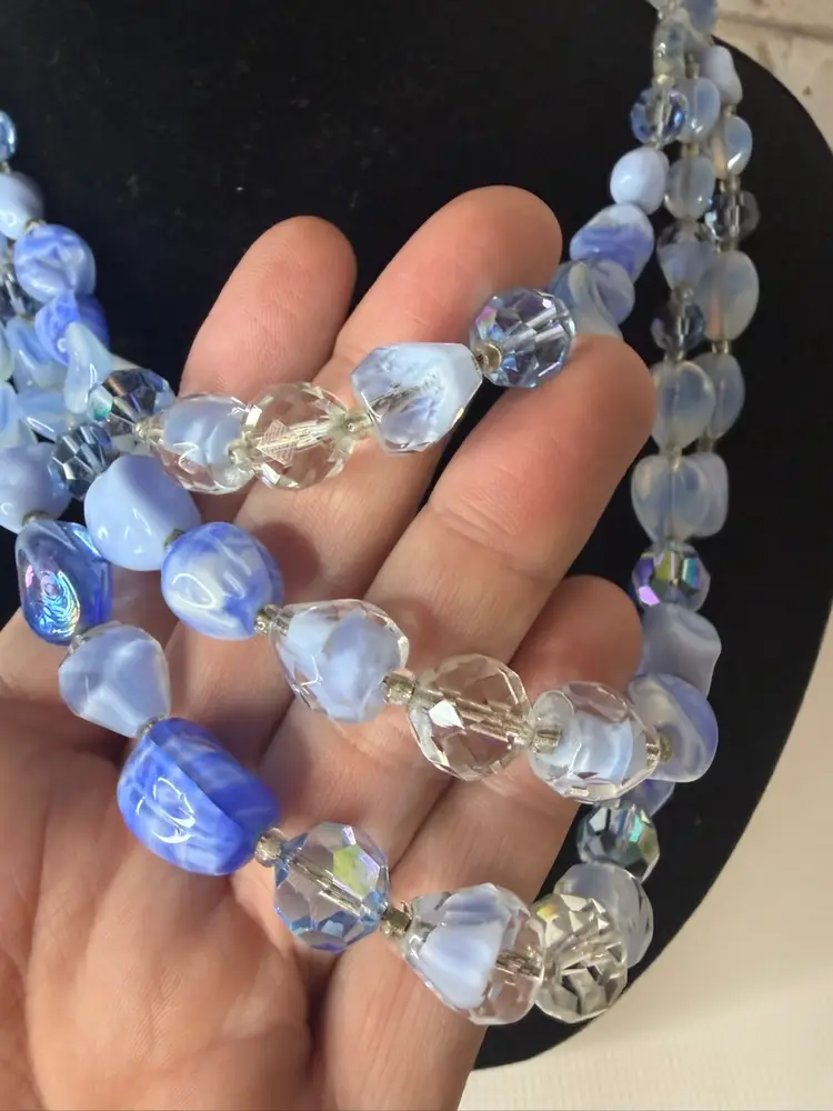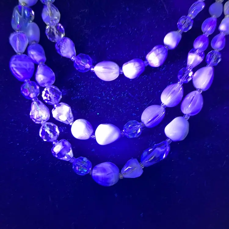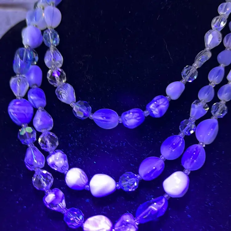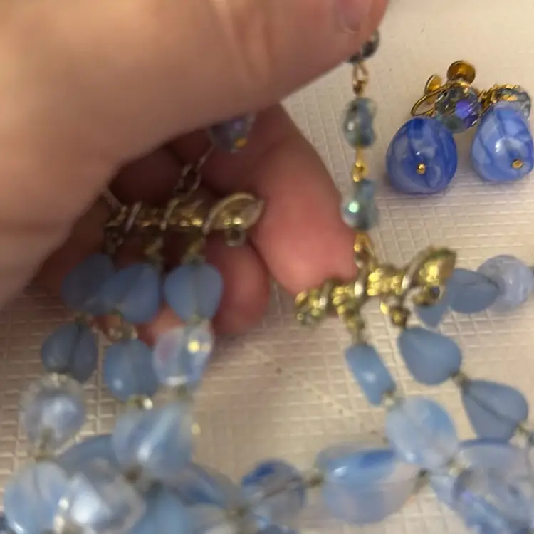 Measures 9” earring one 1” glass and beads pretty blue and with in glow it turns a light purple