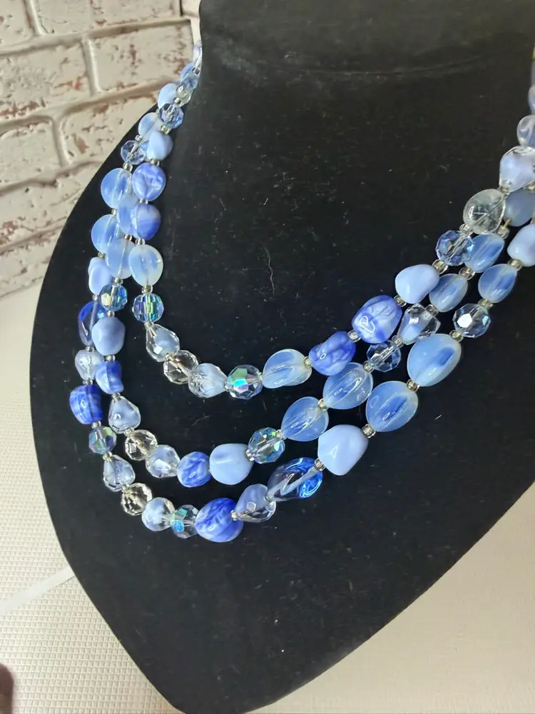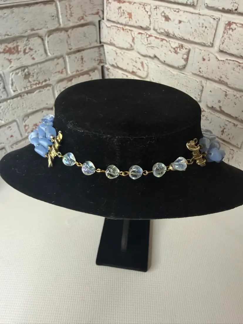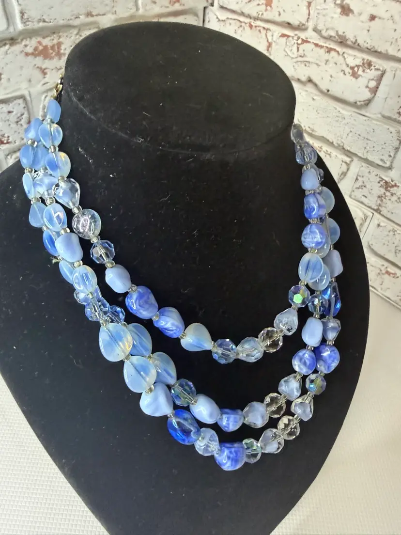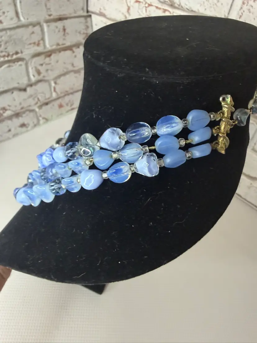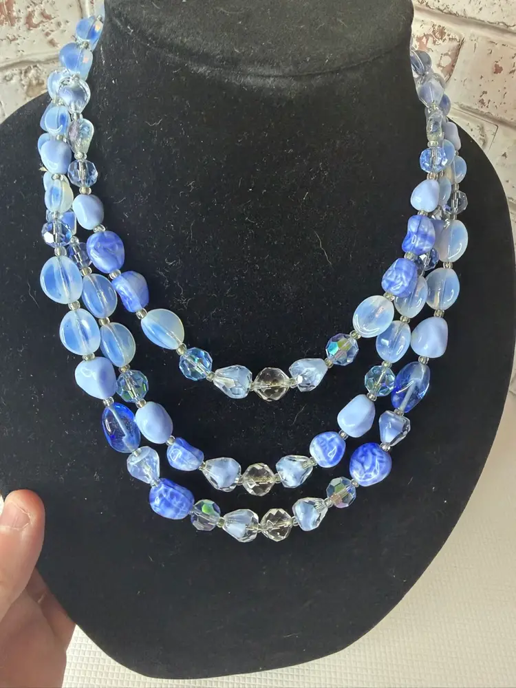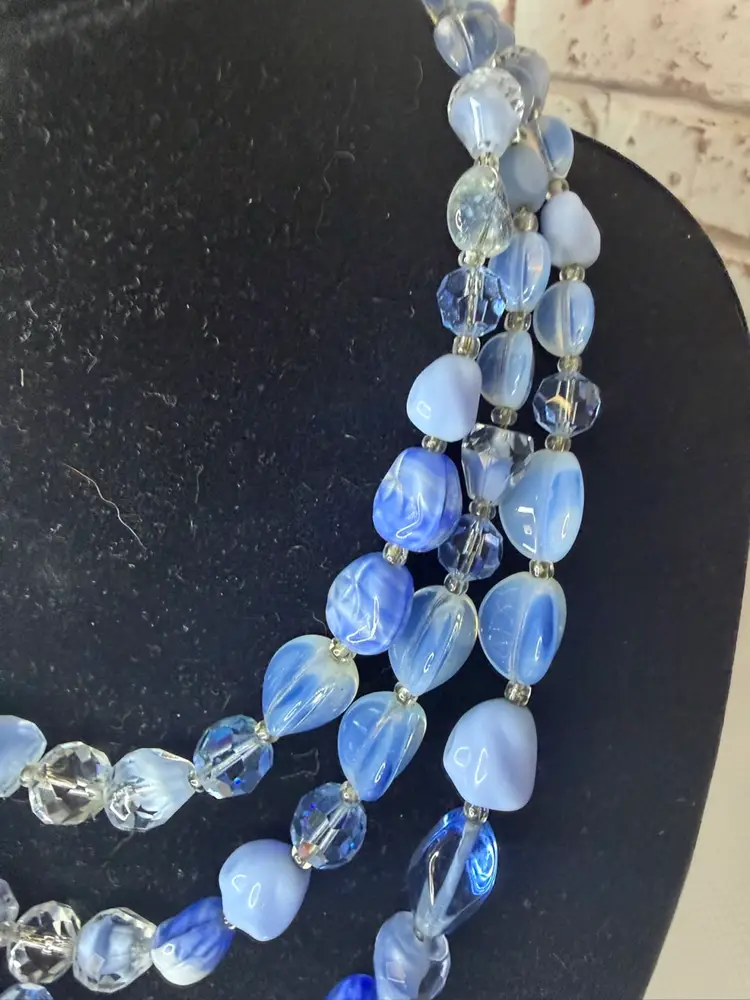 Measures 9” earring one 1” glass and beads pretty blue and with in glow it turns a light purple