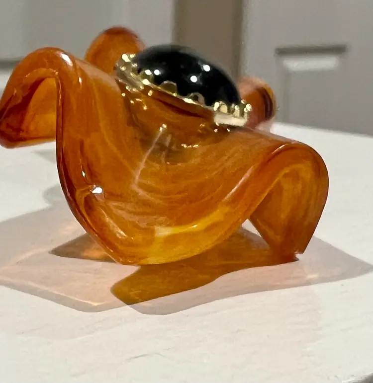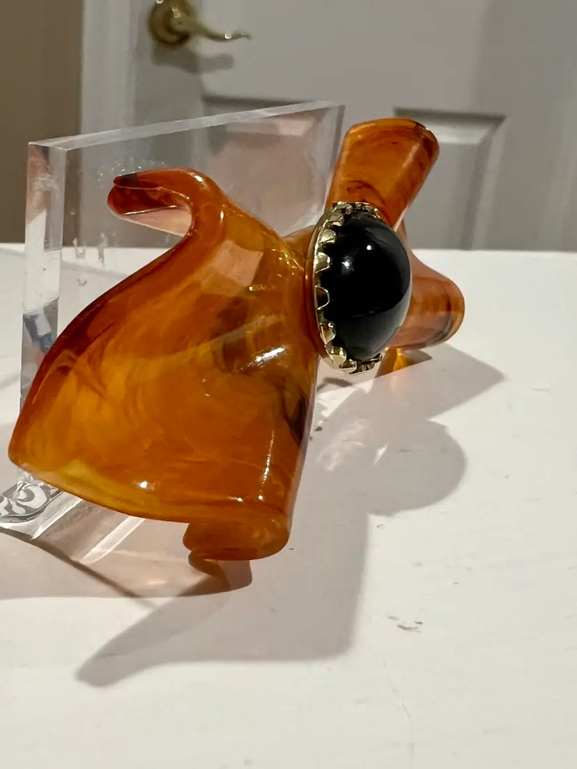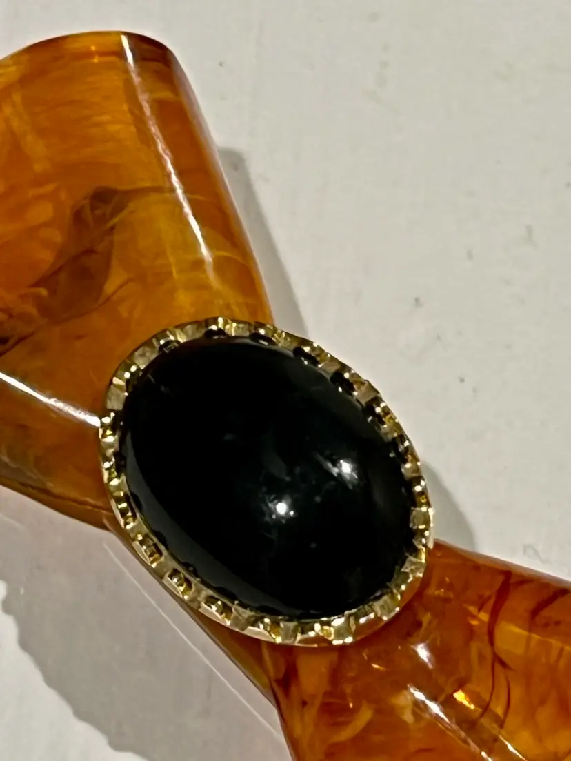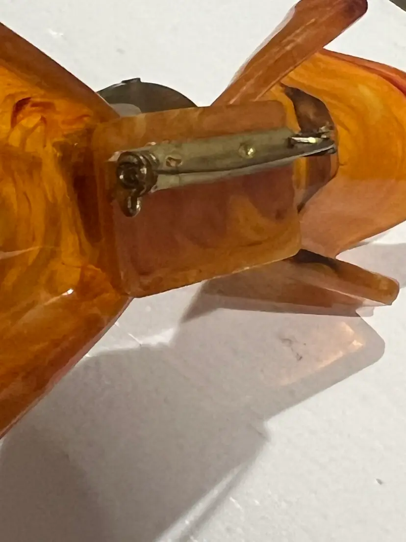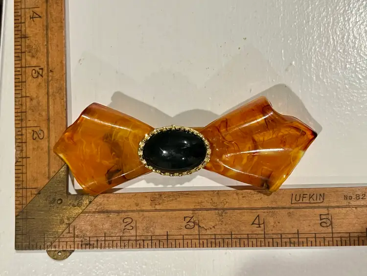 At one time I believe this could have possibly been a hair Brad it could be transformed back to that very easily. Mr. Google tells me that this is Apple Bakelite but I’m no expert and uncertain so I am just calling it celluloid. It’s a wonderful condition for its age quite lovely and would be a beautiful addition to any vintage brooch or barrette collection. Please note in the first couple of photos. The brooch is on a clear stand just to show details. The stand is not included.