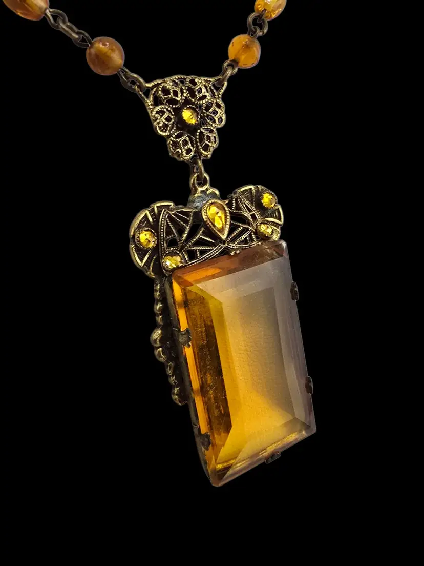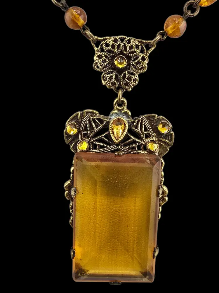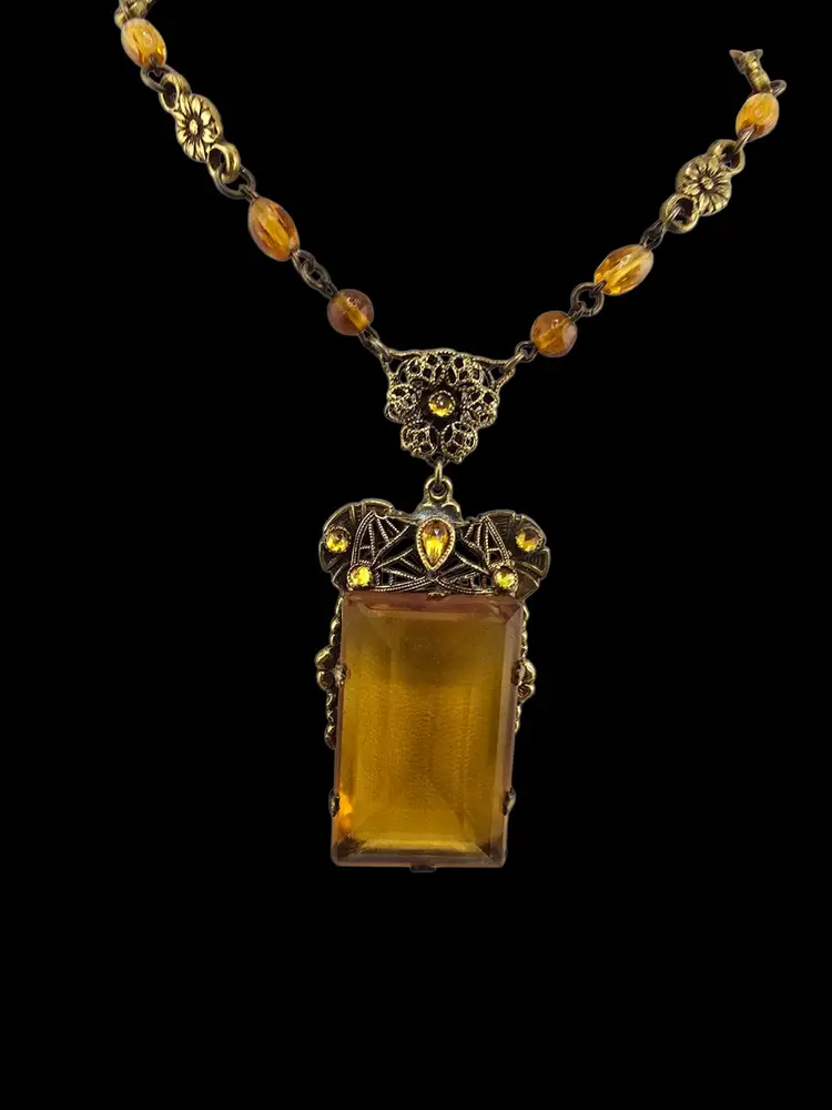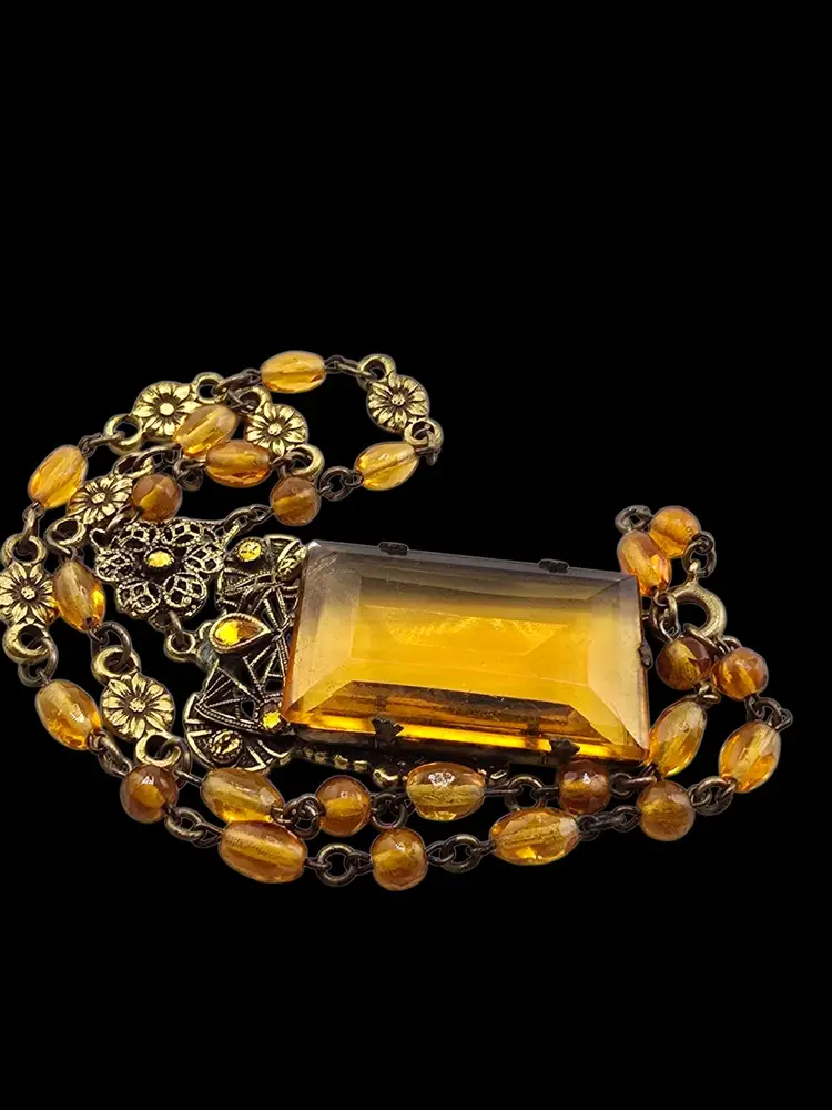 Details: • Faceted amber glass centerpiece • Ornate brass filigree accents • Floral and bead chain detailing • Secure clasp closure