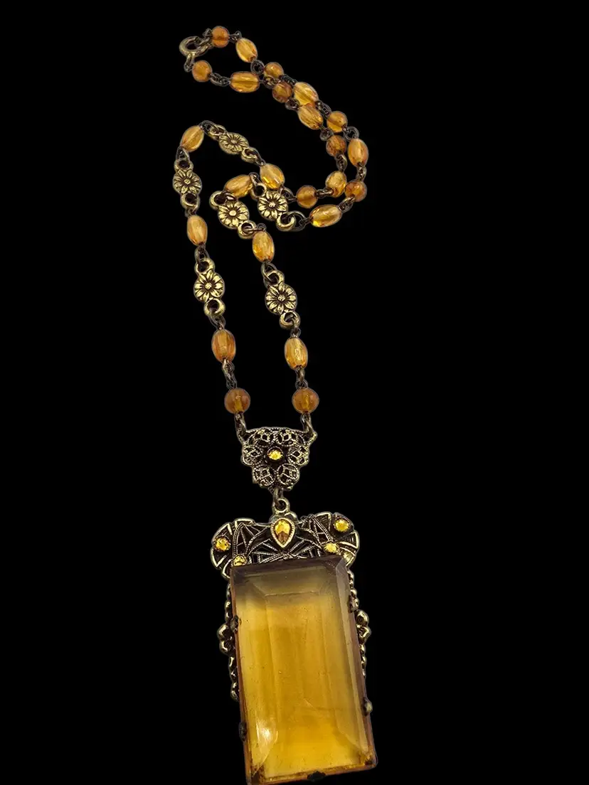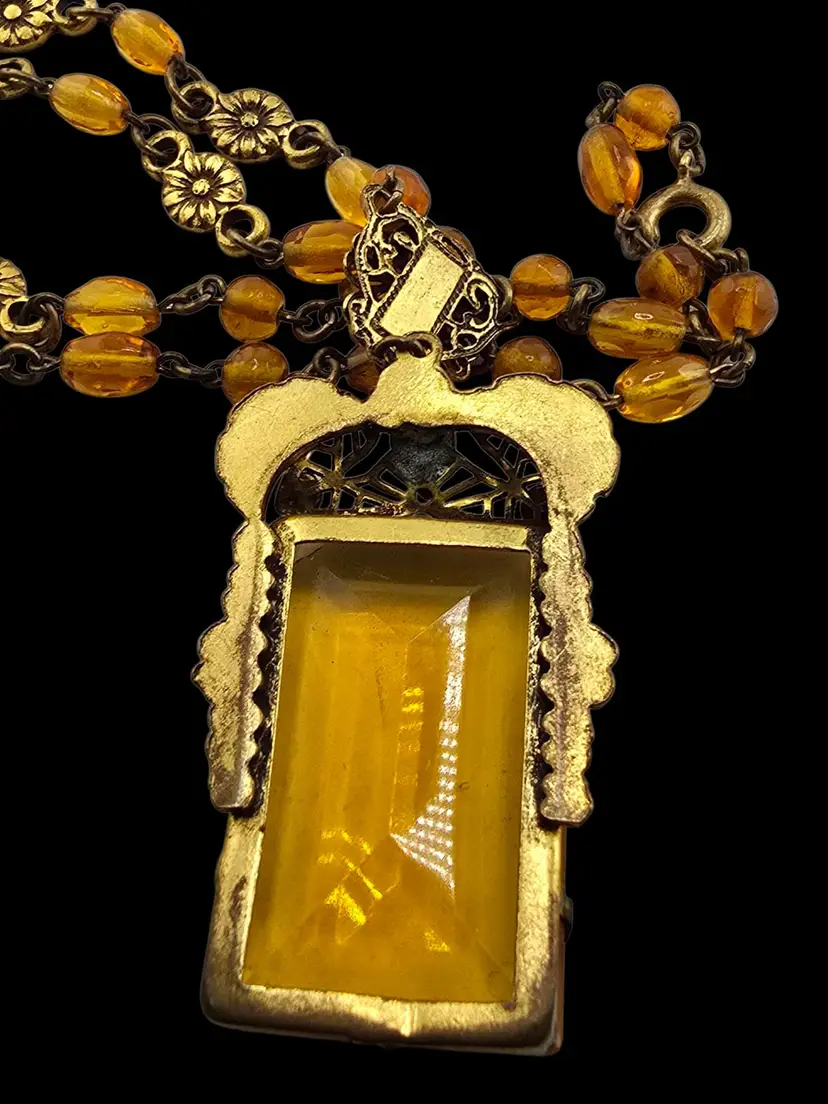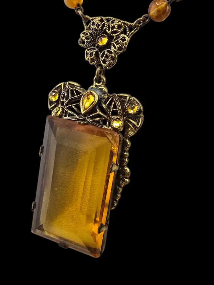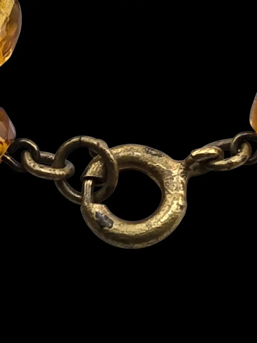 Details: • Faceted amber glass centerpiece • Ornate brass filigree accents • Floral and bead chain detailing • Secure clasp closure