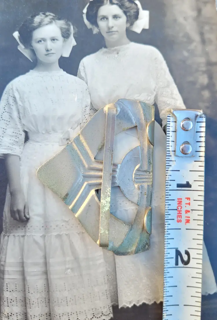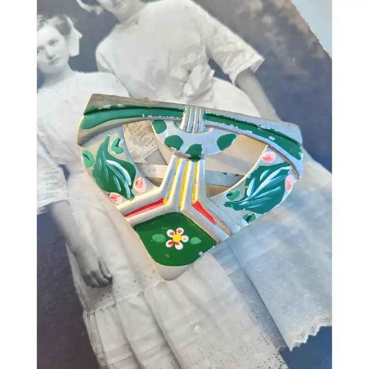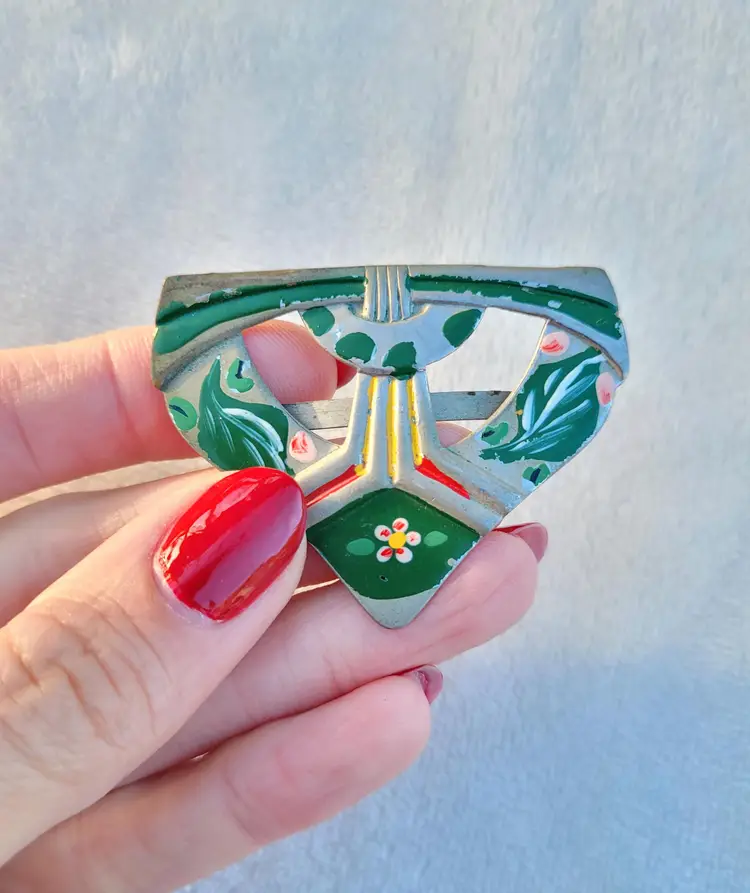 Beautiful hand painted half of a belt buckle, circa 1920s. It's in good condition other than missing its mate, with some wear on the paint. It could perhaps be turned into a brooch or pendant?