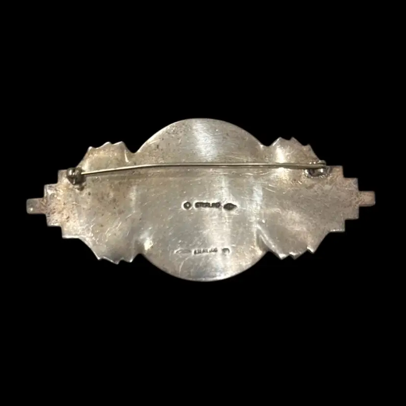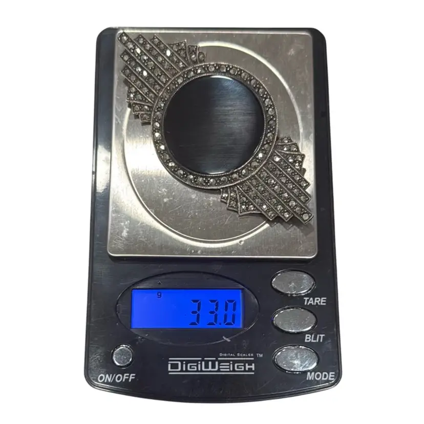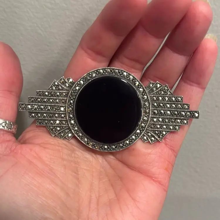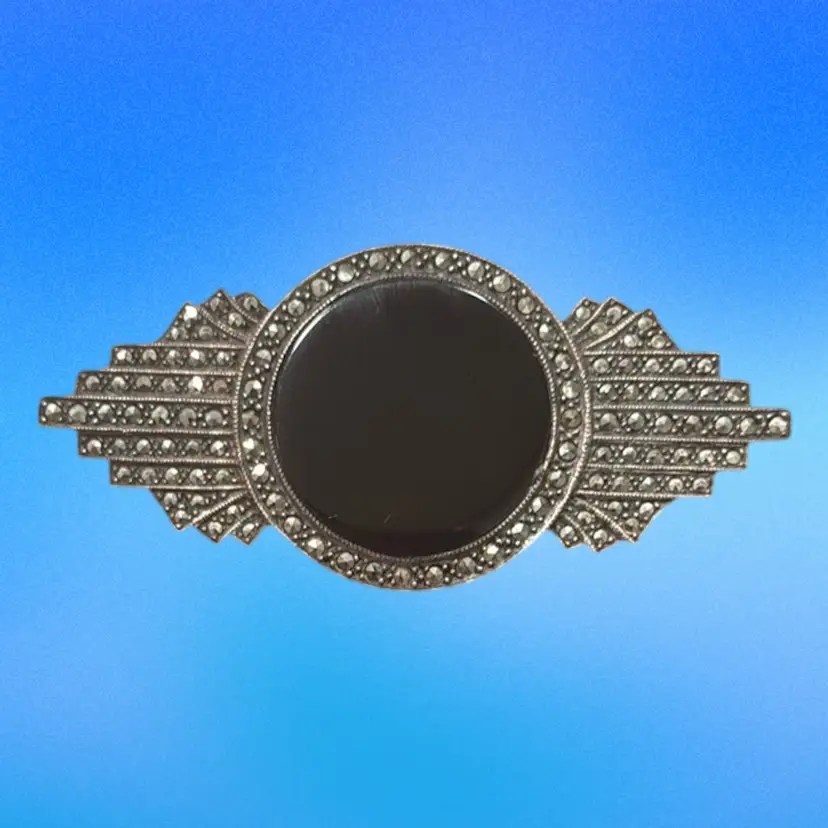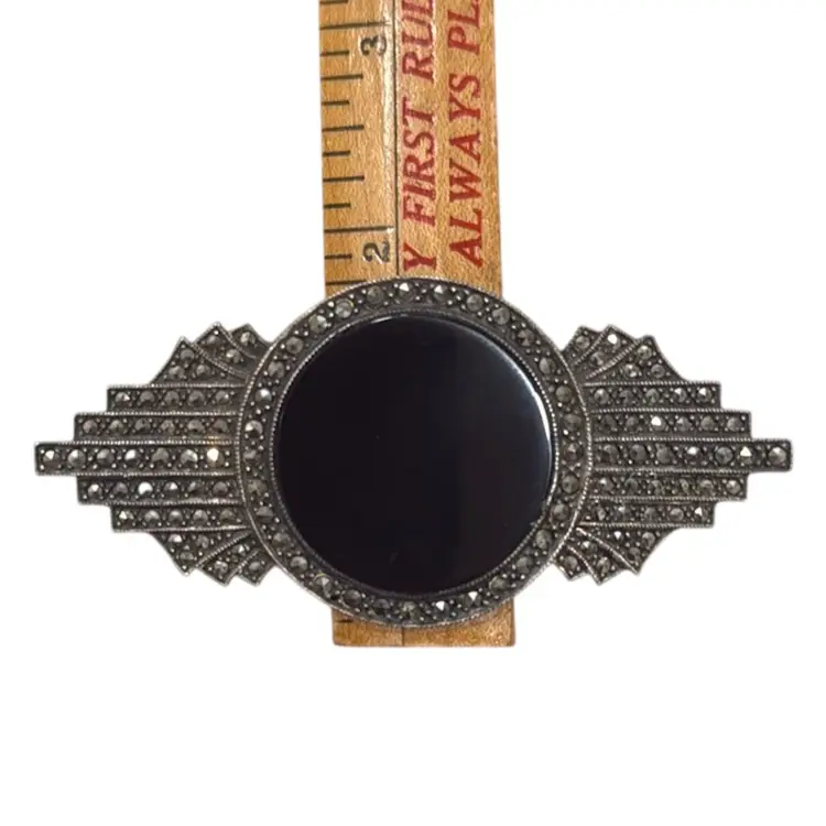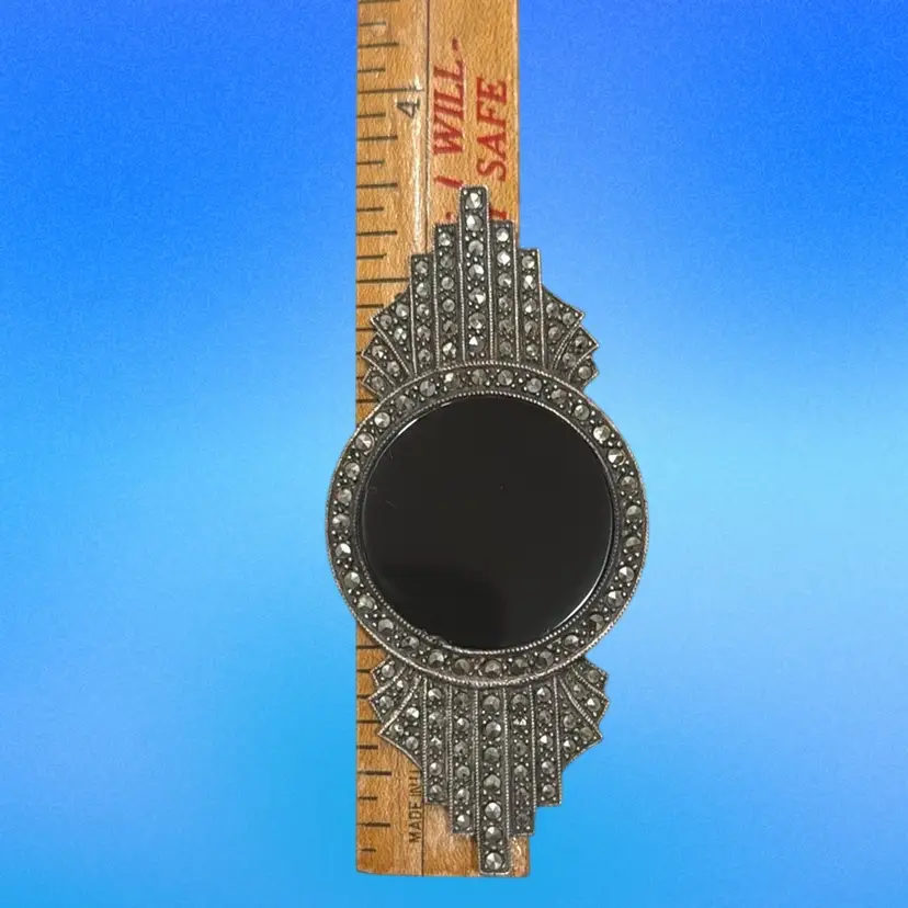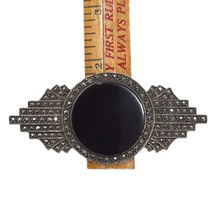 Vintage Art Deco Hallmarked Sterling Silver Onyx & Marcasite Brooch 3.5”x1.75”, 33g