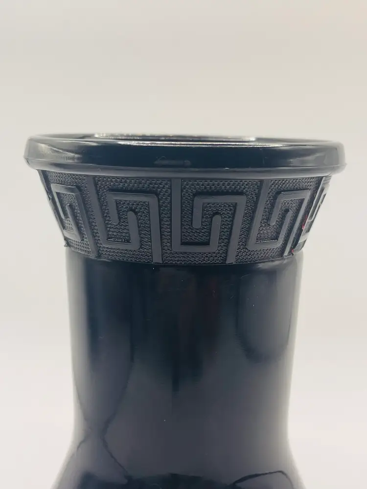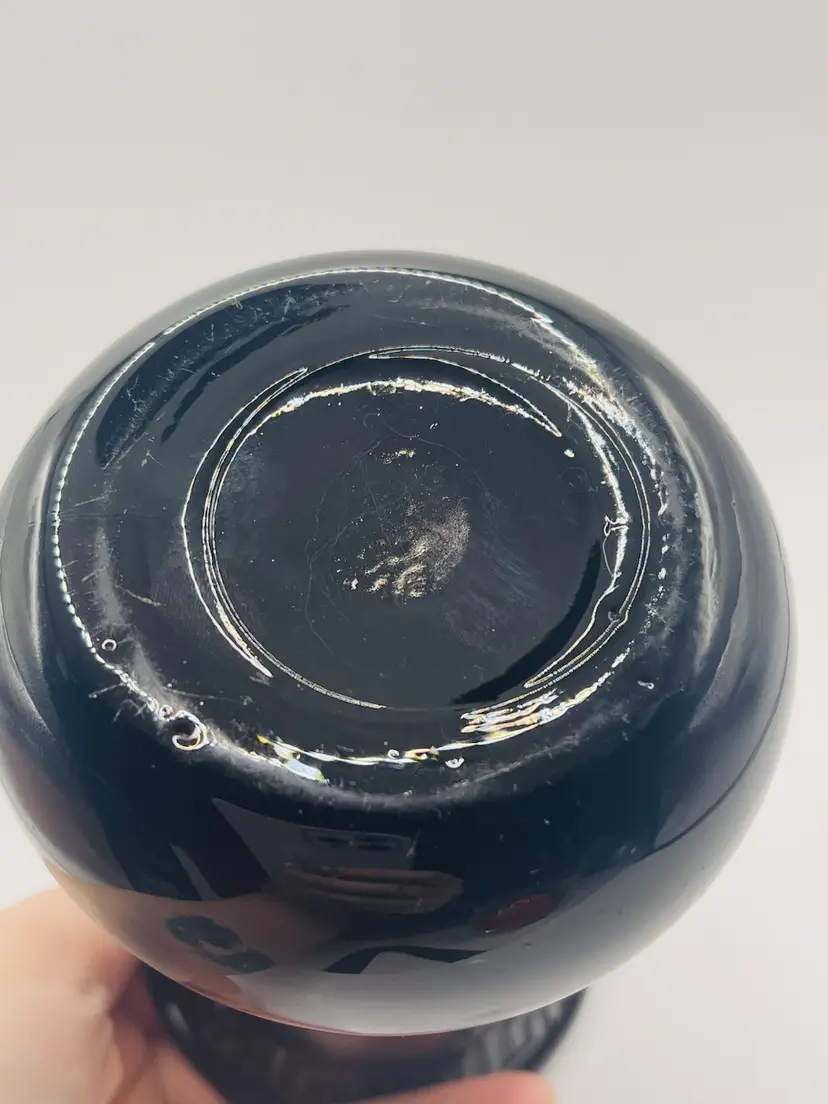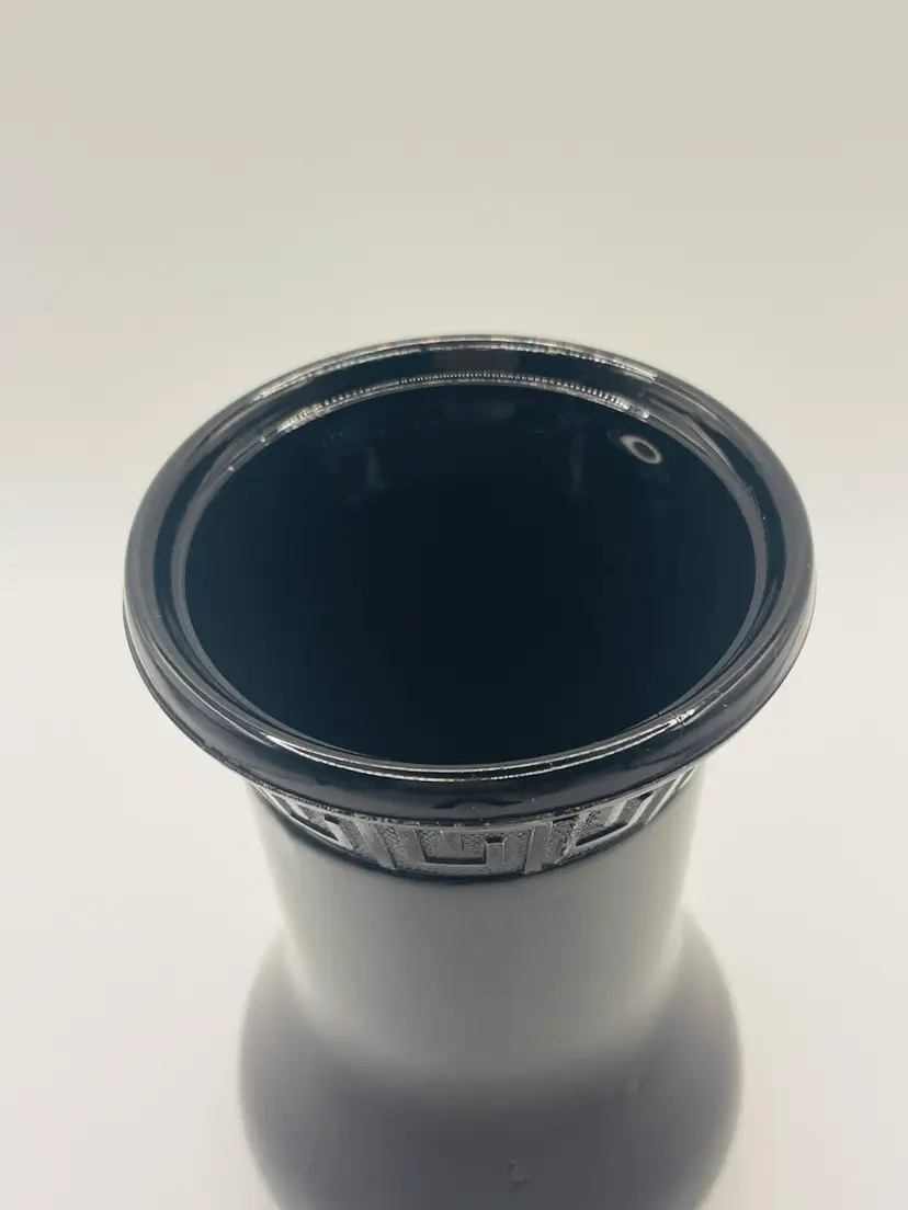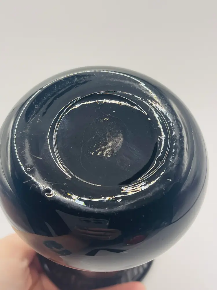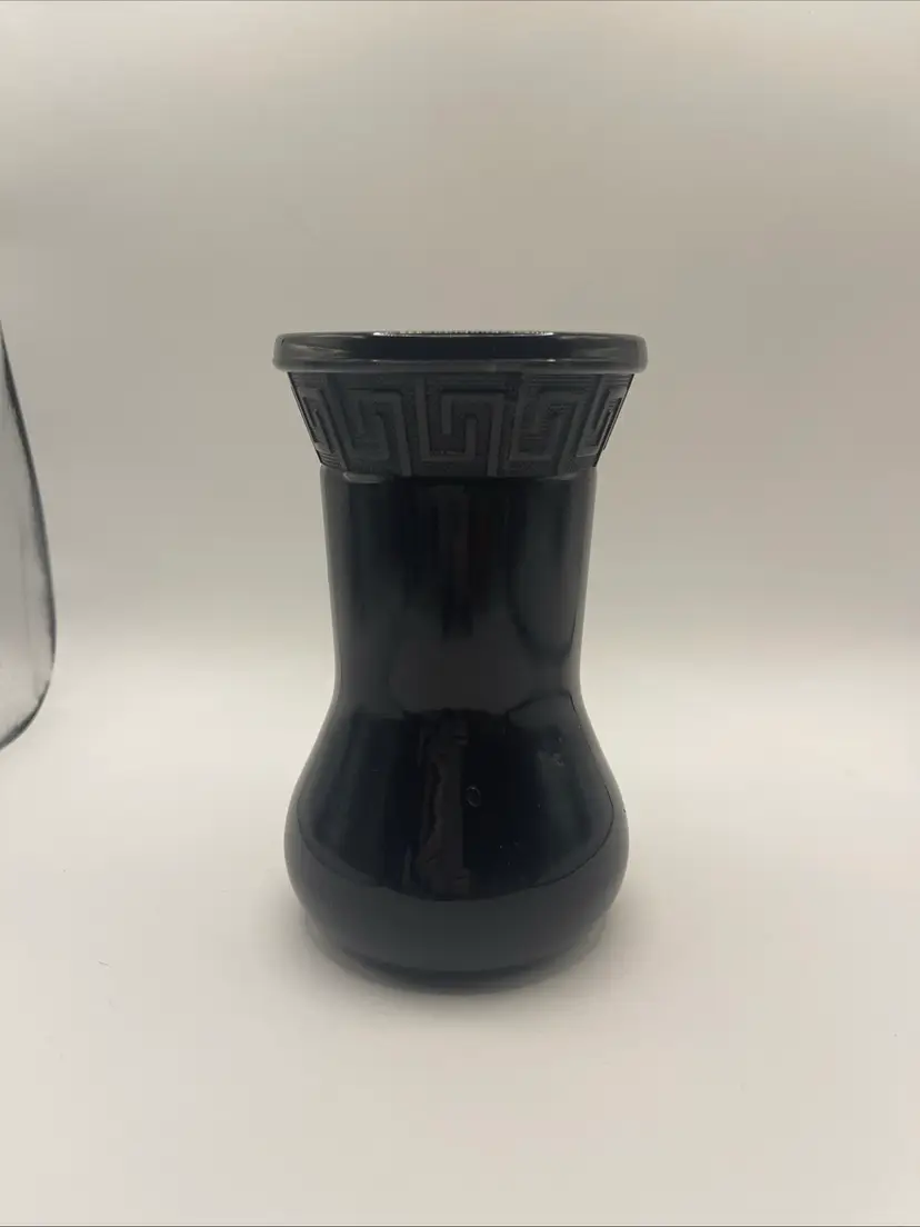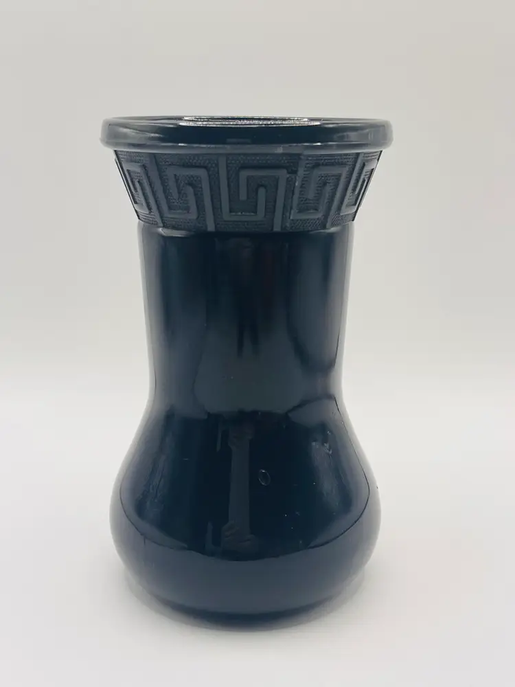 Vintage, art deco, L.E Smith Glass Company Greek Key vase. This is a black amethyst colored vase, there is a small lip that runs around the top edge which allows for the potential of a flower frog to be added. This specific pattern was made from 1926-1937 (so we’re bordering on antique and not just vintage!), This stands 6 inches tall, there are no chips or cracks. There is two areas on what I would call the backside, that appear to be a small circle and other circular impressions in the glass. They are not deep or sharp which makes me feel that they are mold marks ask this is a pressed glass piece. They can be seen in the second to last photo, as well as a photo showing the amethyst coloring.