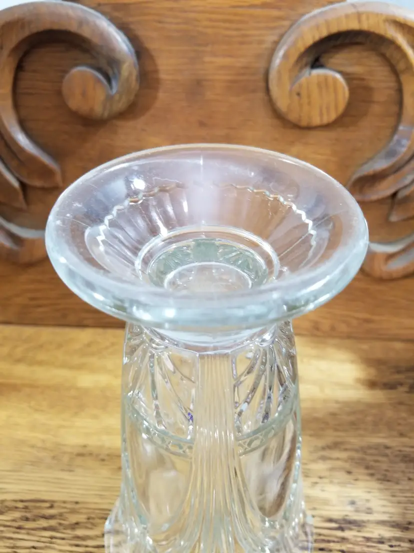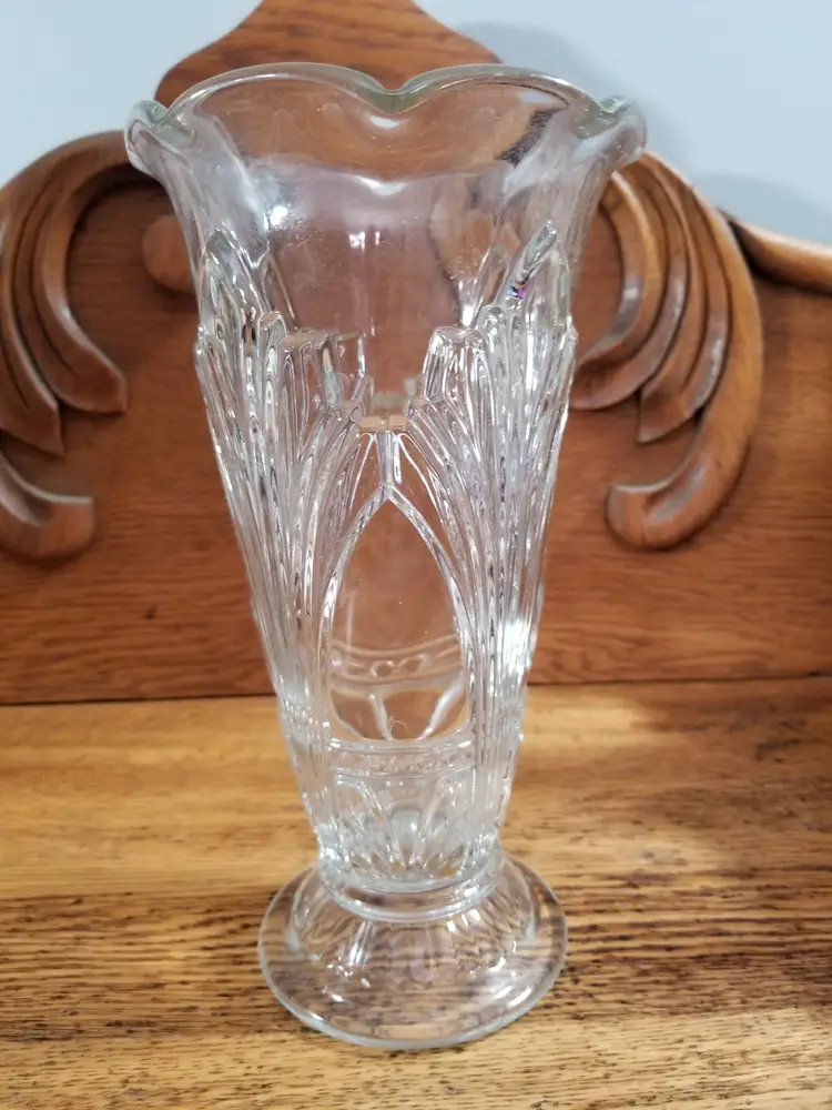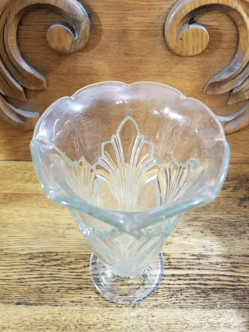 Vintage Art Deco Pressed Glass Vase 9” Fan Pattern Scalloped Rim Beautiful vintage Art Deco pressed glass vase, featuring a striking fanburst / fountain-style design rising from the base and a softly scalloped rim at the top. This vase stands approximately 9 inches tall and measures about 5 inches across the opening. The clear glass catches the light beautifully, highlighting the crisp pressed details and classic Deco symmetry.