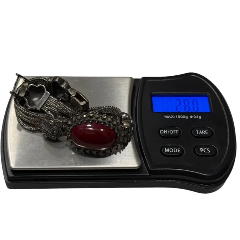 This vintage estate bracelet pays tribute to the Art Deco era and features a captivating oval carnelian cabochon as its centerpiece. Dating from the midcentury it is a fine example of Art Deco Revival style. The warm, rich tones of the carnelian are beautifully contrasted by a dazzling halo of shimmering marcasite stones. Intricate sterling silver detailing, characteristic of the Art Deco style, flanks the central stone with stylized floral elements also embellished with marcasites. The bracelet is expertly crafted with multiple strands of rope braided sterling silver chain. Bracelet fastens securely with a foldover clasp. Bracelet measures 7.5 inches in length and weighing 28 grams.
