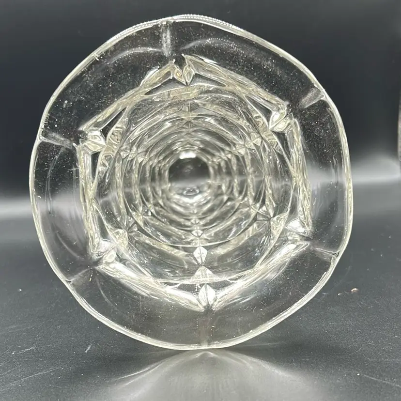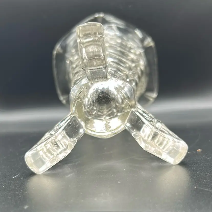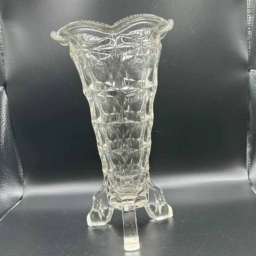This piece is an art deco rocket vase made by Indiana glass in the constellation pattern. It is known for its tripod footage designs. It dates back to around the 1930s to 1940s. There are no chips or cracks. It stands 8 inches tall and 4 1/2 inches wide.
