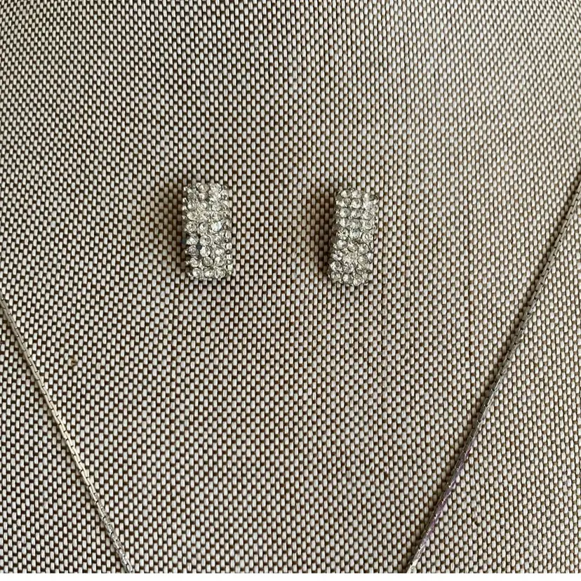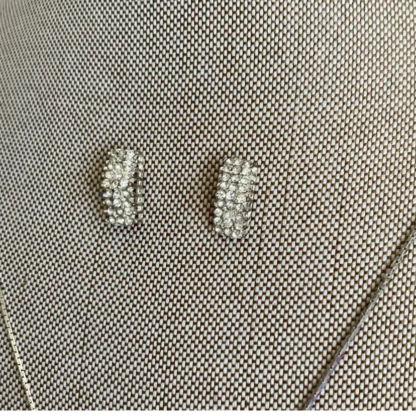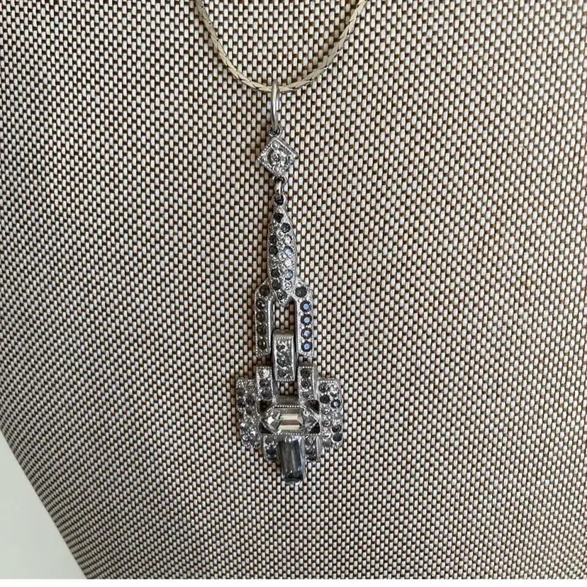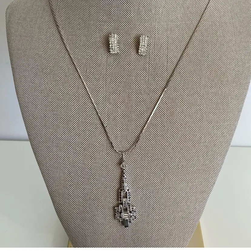 Vintage Art Deco silver pendant necklace with crystal accents and matching earrings. The rhinestones are black and clear. The pendant measures 2 1/2" x 3/4". The petite silver tone box chain measures 23".