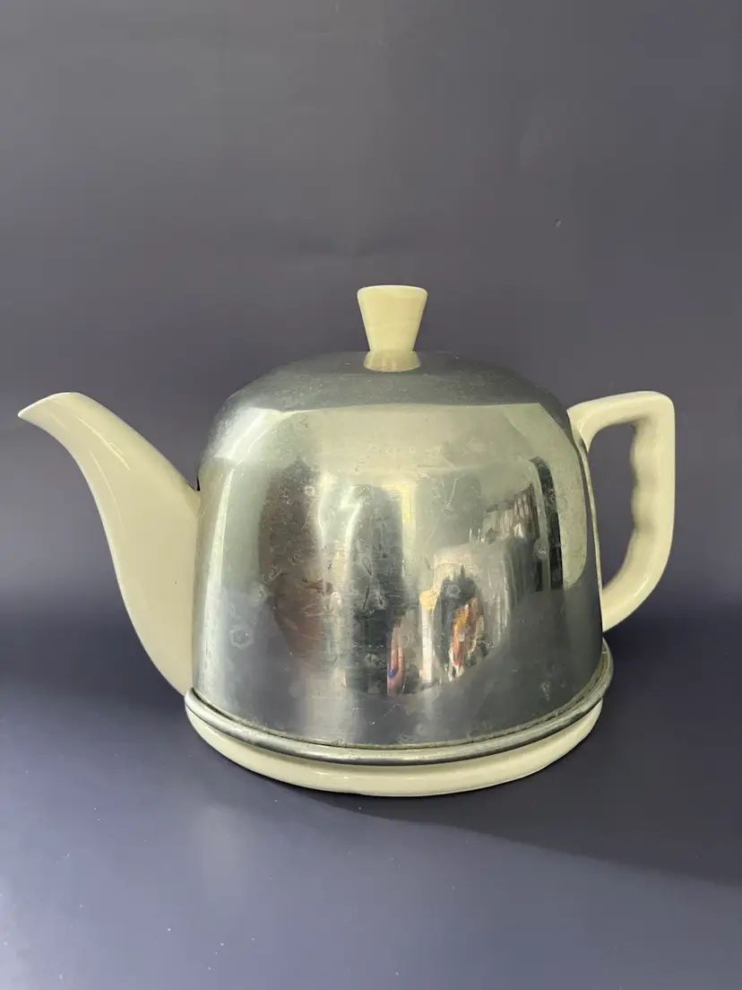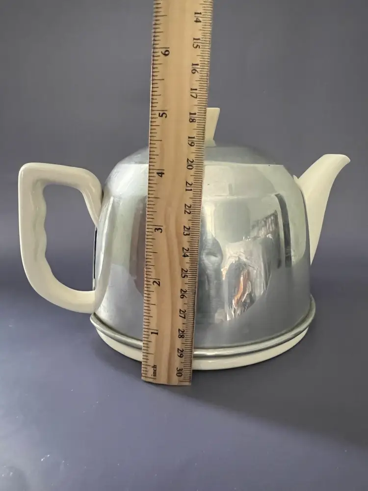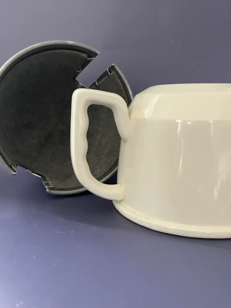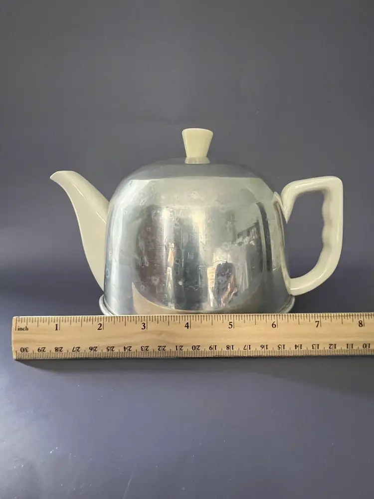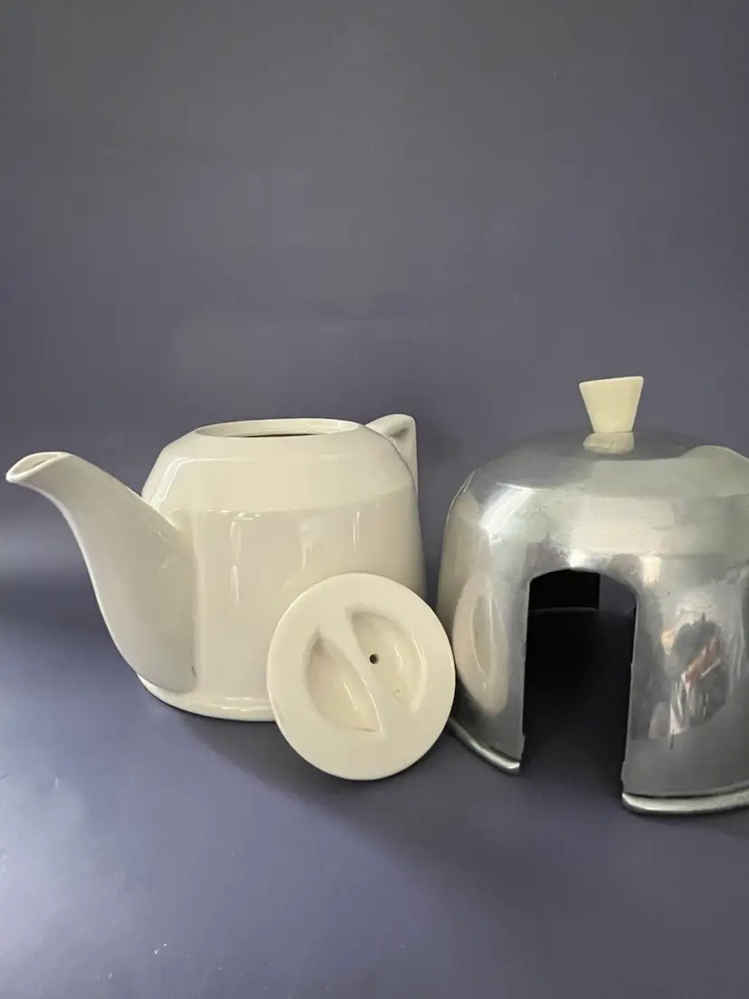 This beautiful Ranmaru teapot from the Potter's Selection product line is a must-have for any tea enthusiast. Made from high-quality stoneware, this round teapot comes in a vintage white color scheme that is sure to complement any kitchen decor. The teapot comes with an aluminum felt lined cozy to keep your tea warm and fresh. The cozy has a minor dent but is unusually good repair for its 80 + years. It is an original piece from Japan, with an impressed back-stamp that adds to its authenticity. The teapot comes in a set of 3 and has a solid pattern.