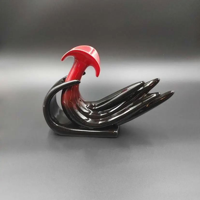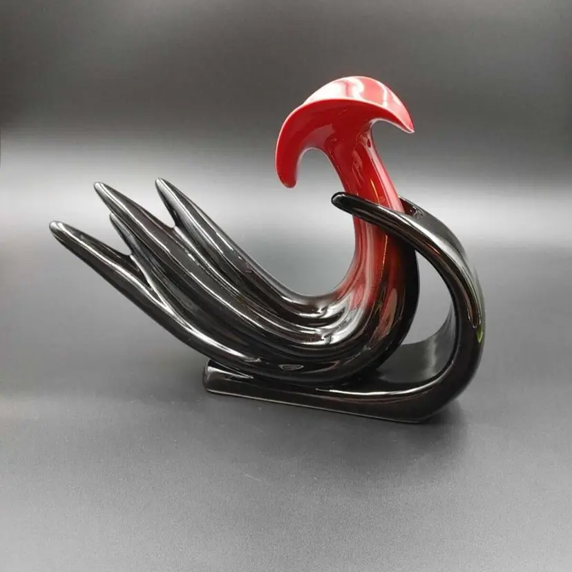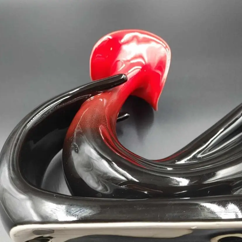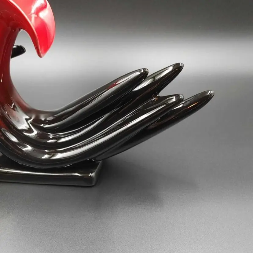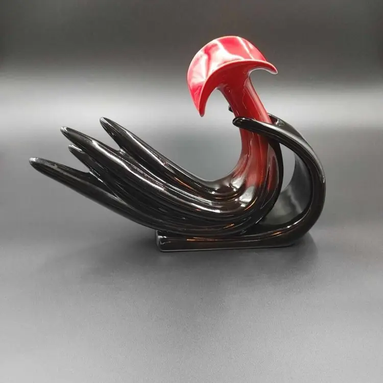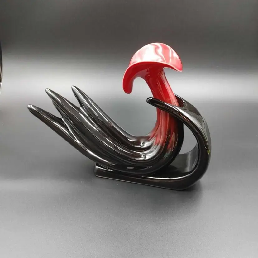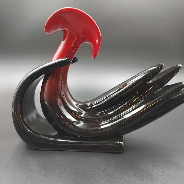 Fabulous Art Deco Vase in the form of a Rooster/Bird. Red And Black from the 1980s. Retro. Measures approx. 12" long by 8.25" tall at the largest areas. In Very Good condition with no chips, cracks or breaks.