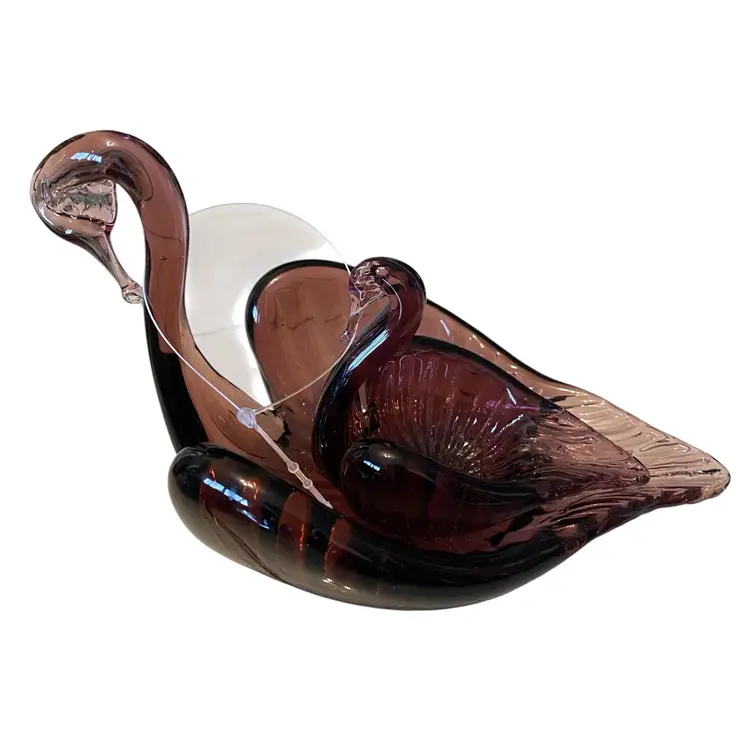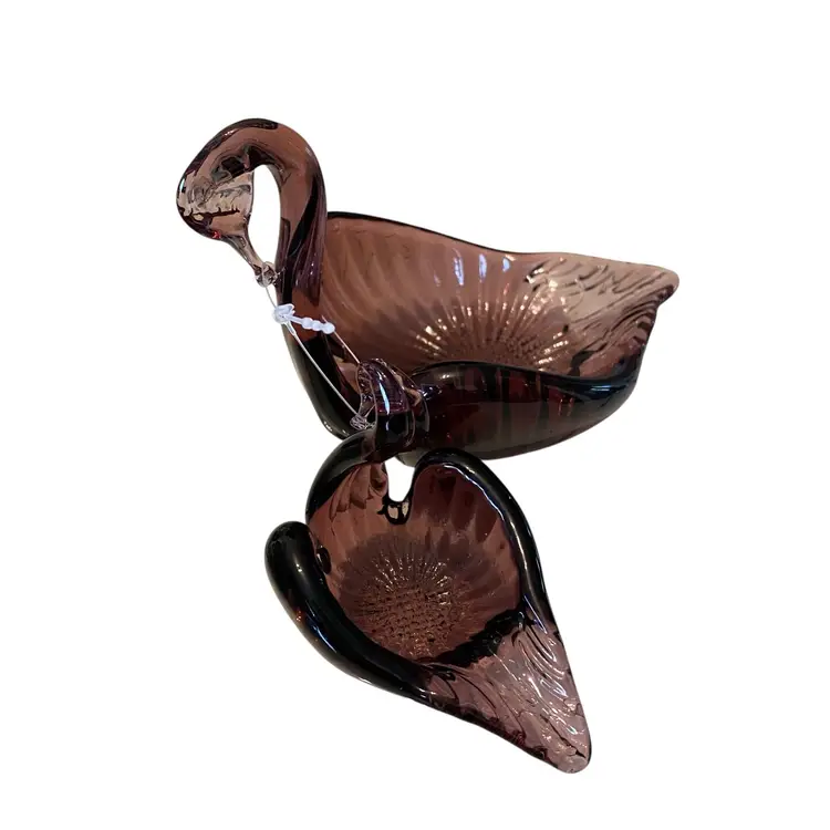 Vintage Art Glass Amethyst Purple Swans Double Trinket Dish Bowl 6in and 3.5in