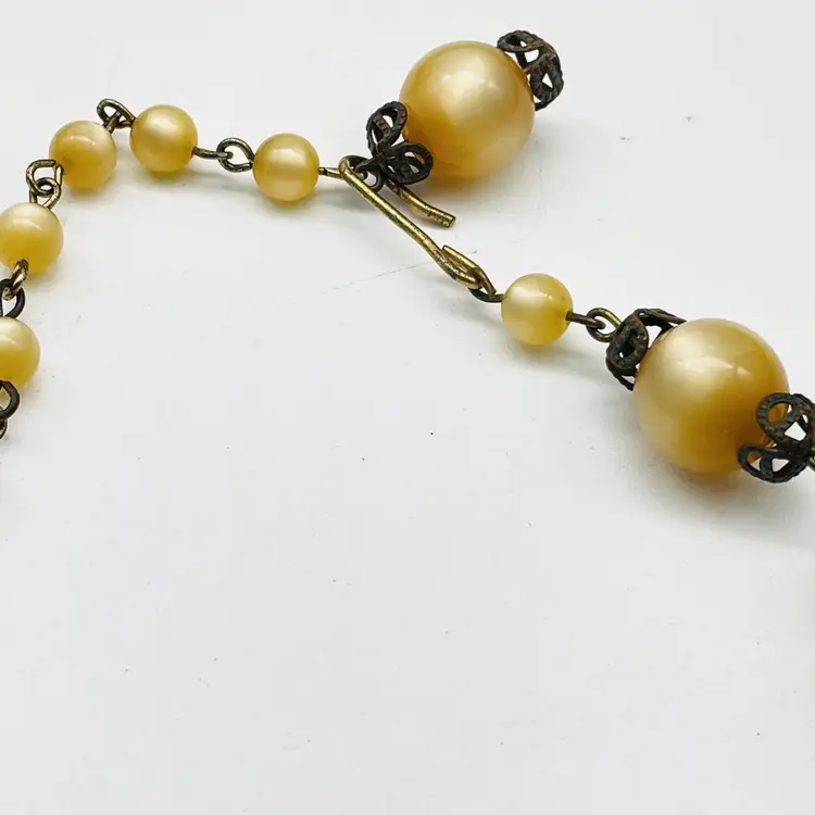 Gold-tone round beads and filigree spacer accents add elegant vintage style Graduated bead design with yellow faux pearls and decorative bead caps Measures approximately 16 inches in length (see photos for full measurement) Secures with classic brass-tone hook clasp Lovely statement necklace for vintage jewelry collections or special occasions Condition: Gently worn, no visible flaws, very light surface wear consistent with age