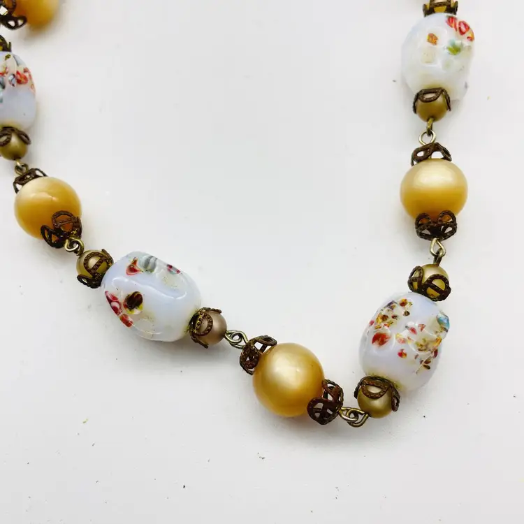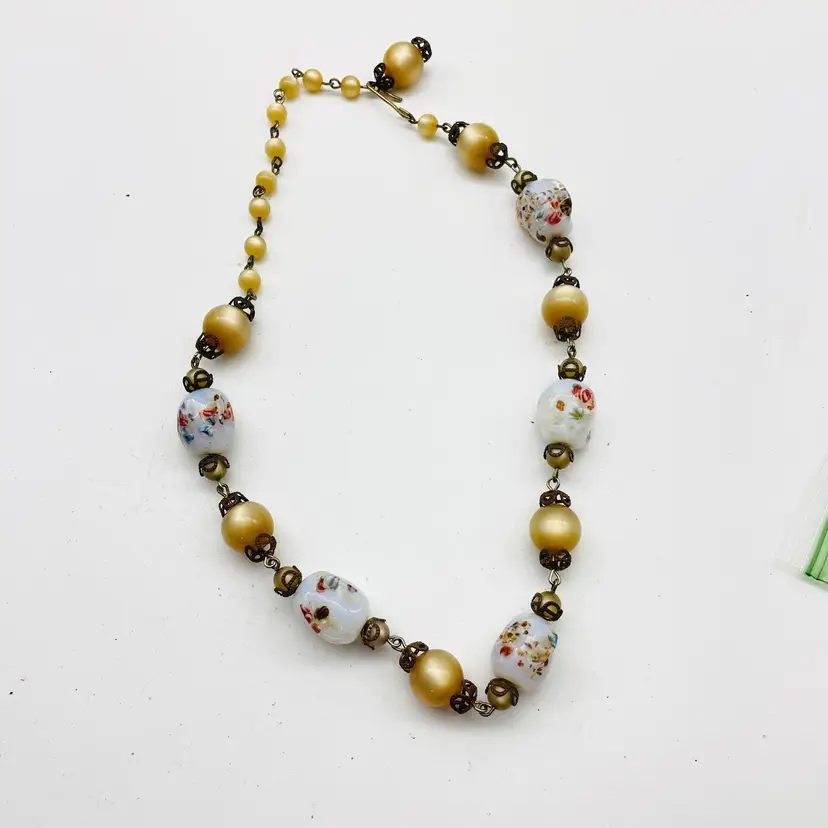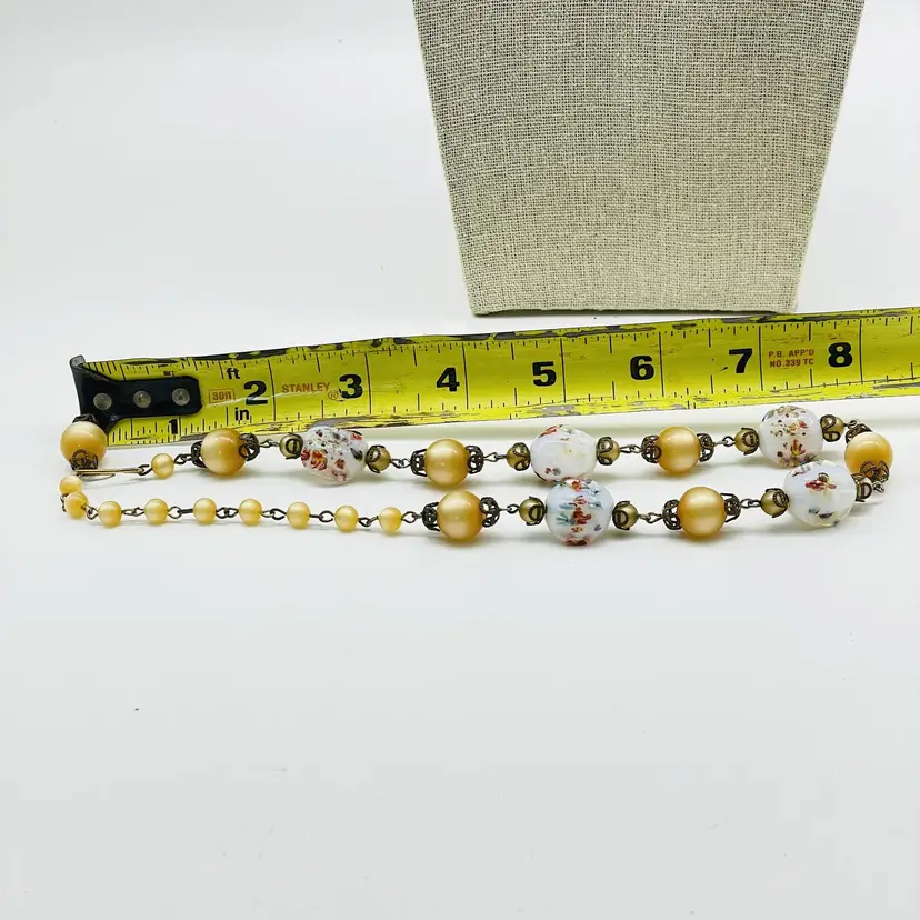 Vintage Art Glass Bead Necklace Floral Swirl Yellow Pearl Gold Tone