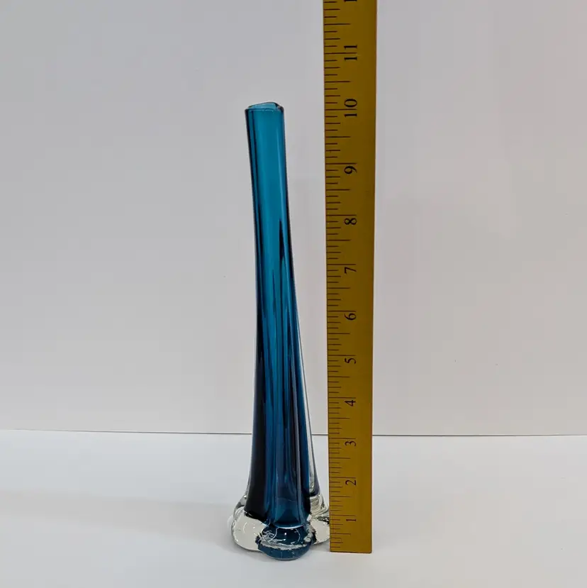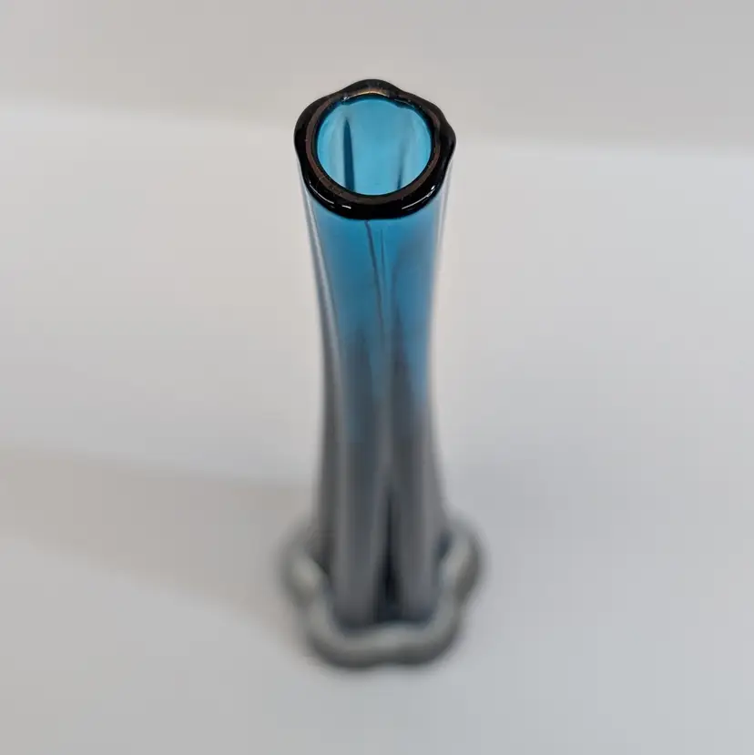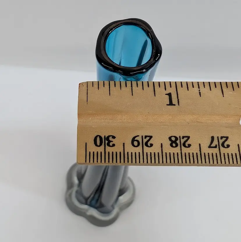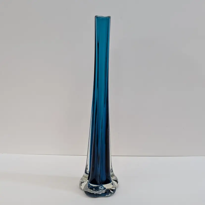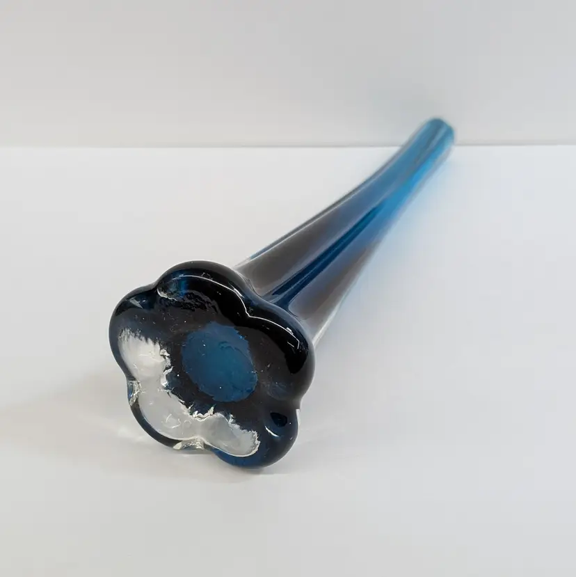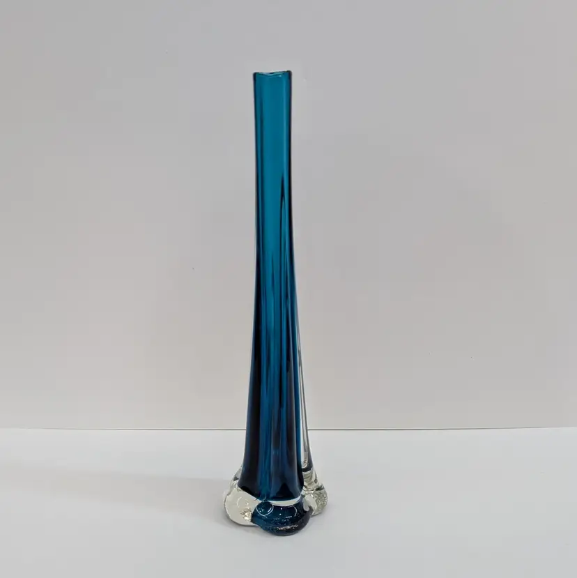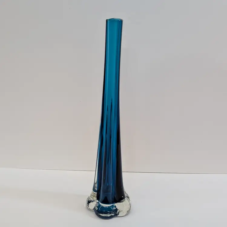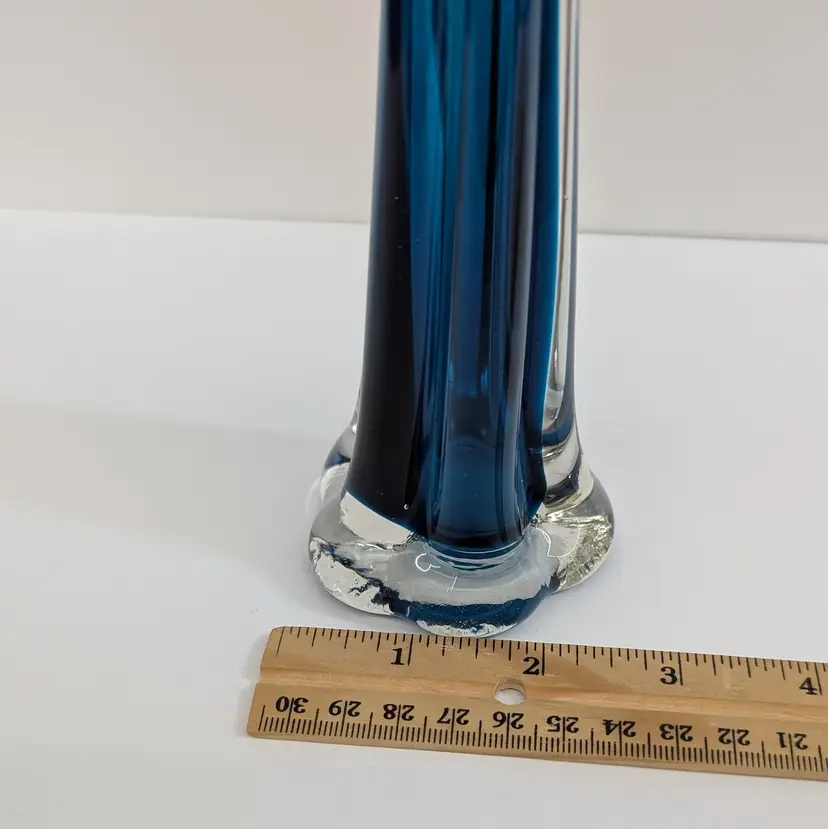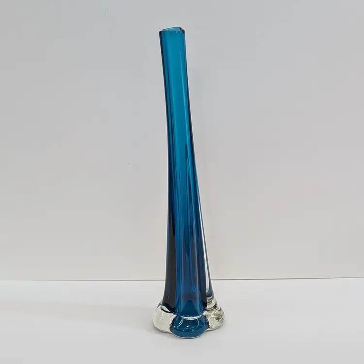 Long, stretched art glass vase with a clear flower or elephant foot base and a blue stem. There are some internal bubbles but in nice, used condition. Measurements ~ 2.5 x 10" with a 0.75" opening