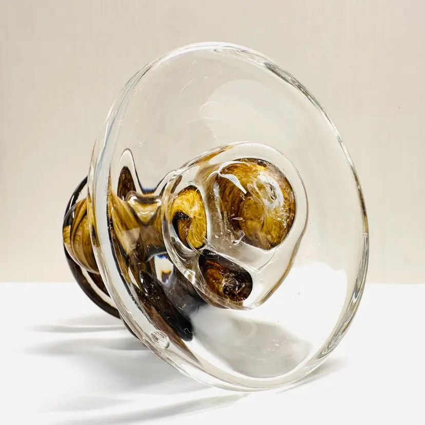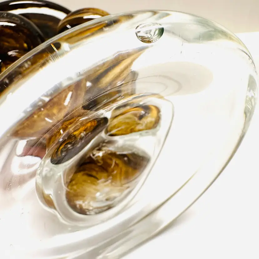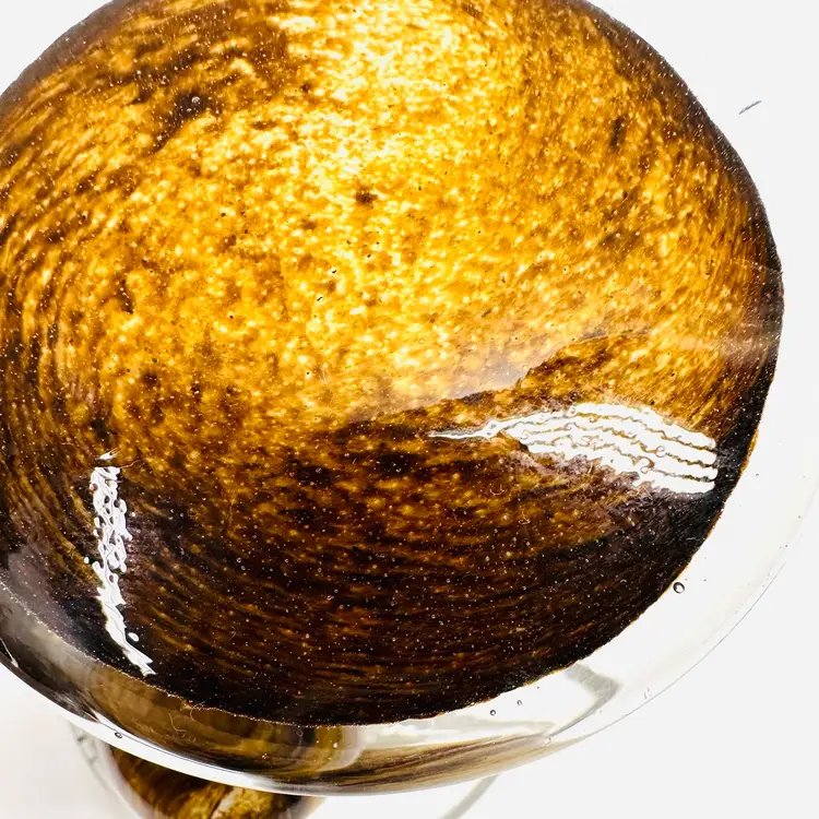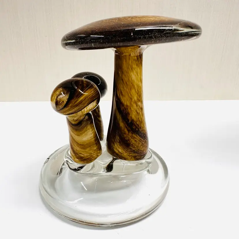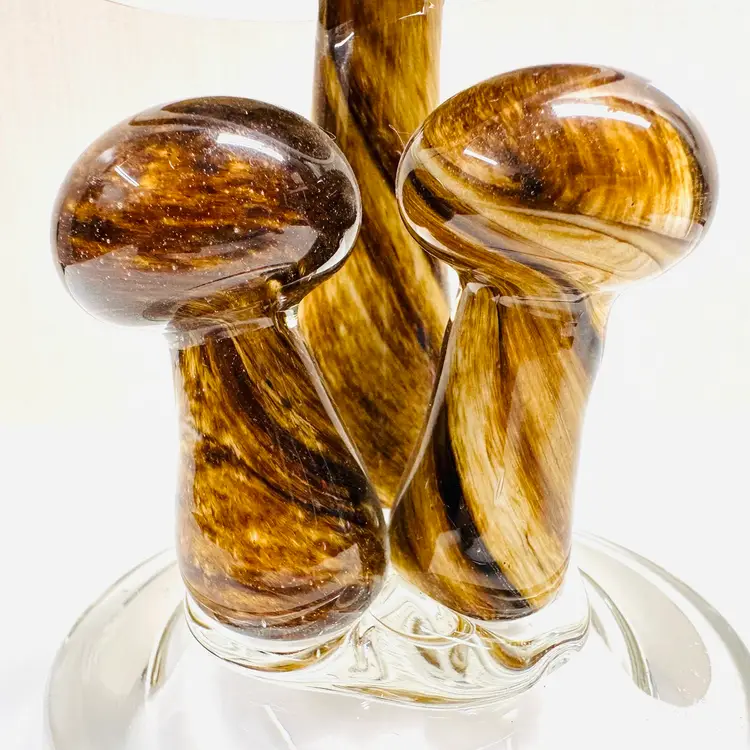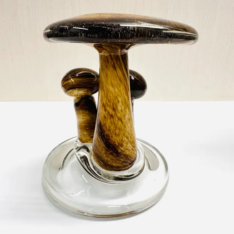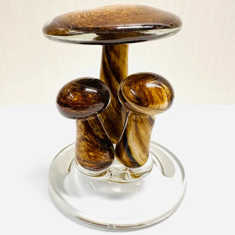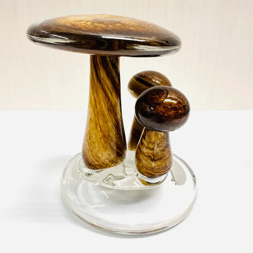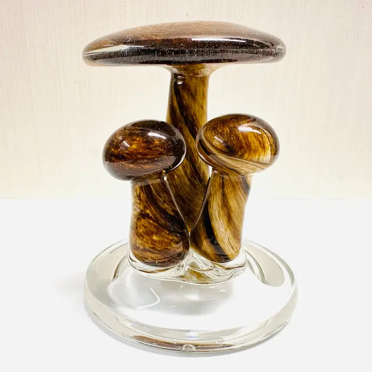 Previously owned Art Glass brown mushrooms (three) figurine or sculpture. There are no maker marks. Great for fall or forest decor. Note there is a bubble in the base and a few very small ones in the big mushroom cap (see pictures).