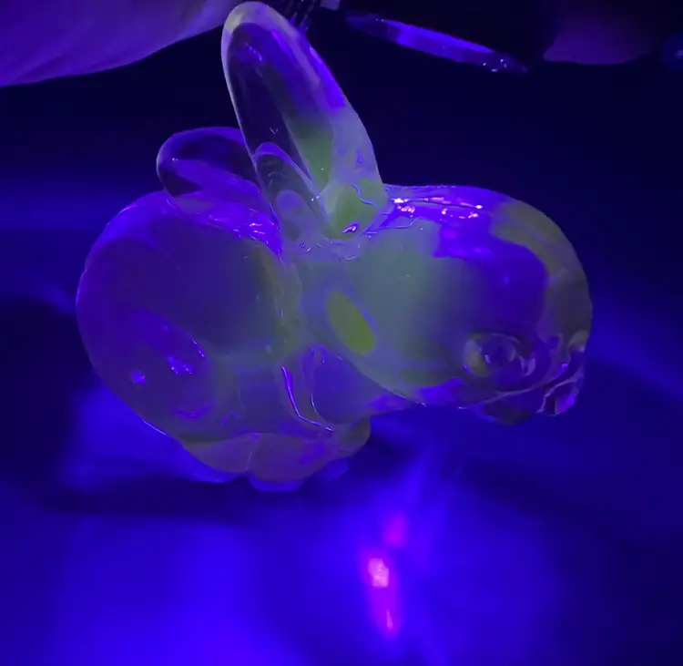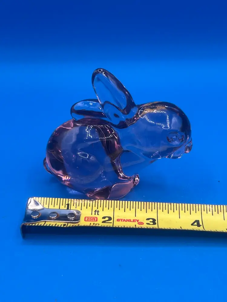 Some searches say this adorable guy is a Fenton bunny, others say Heisey. There are no stickers. It's in very good condition and glowed under the black light. It measures approx 3 1/2 x 3 1/2.