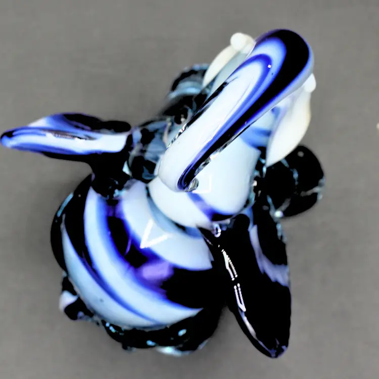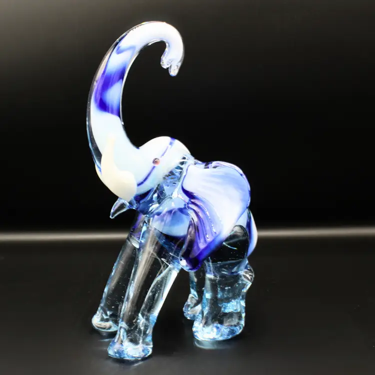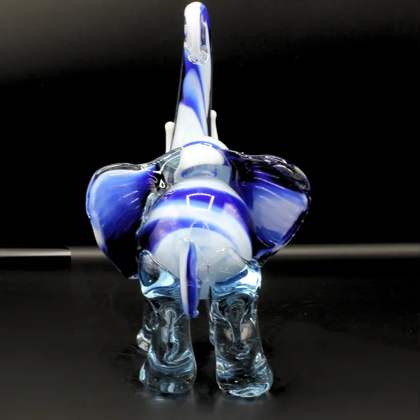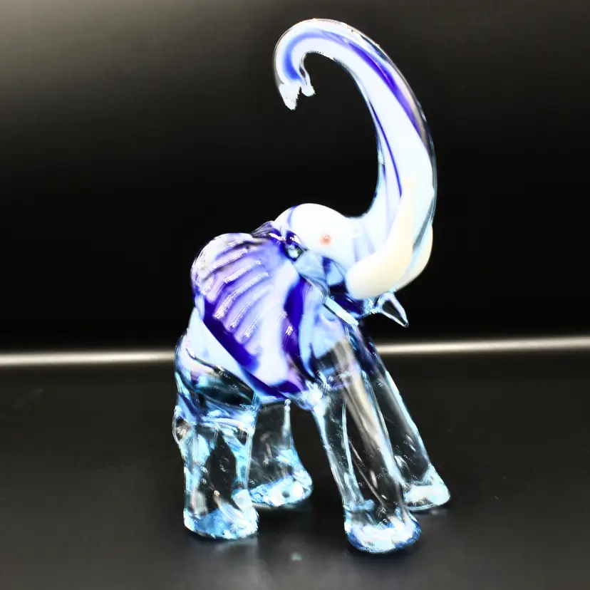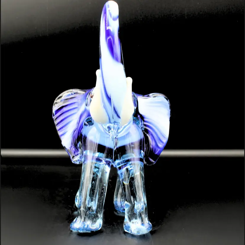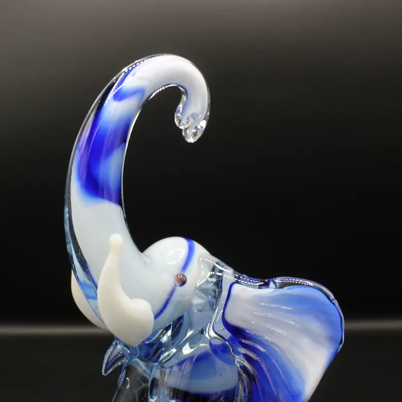 Glass Animal Collectible Vintage hand-blown art glass elephant figurine Stunning blue and white swirl design with clear glass legs Raised trunk symbolizes good luck and prosperity Unique collectible Perfect for display or gifting