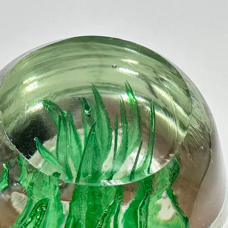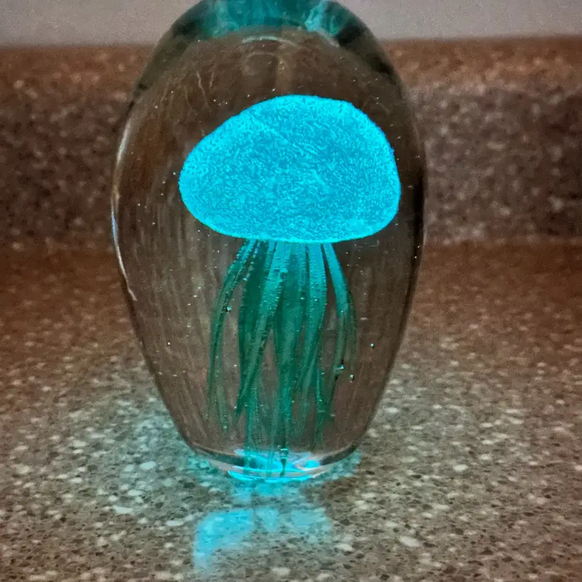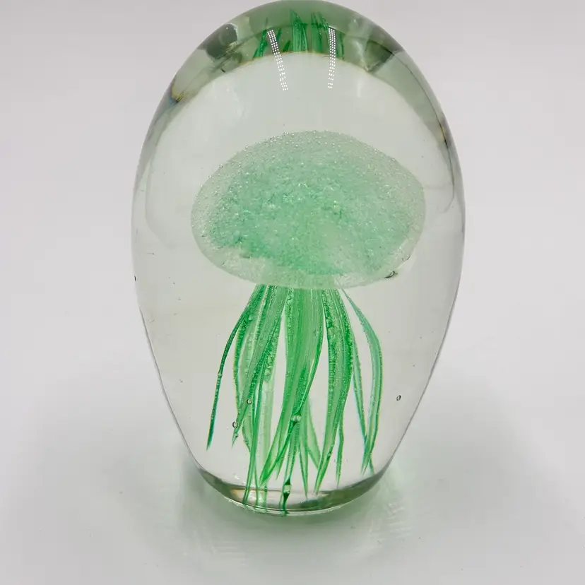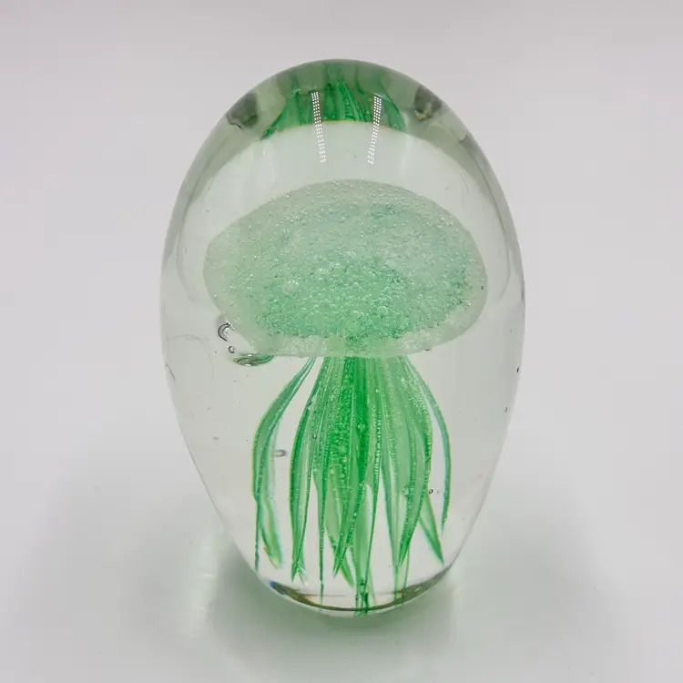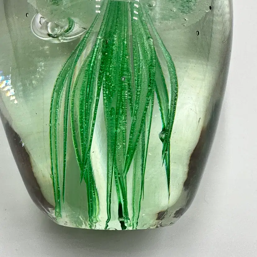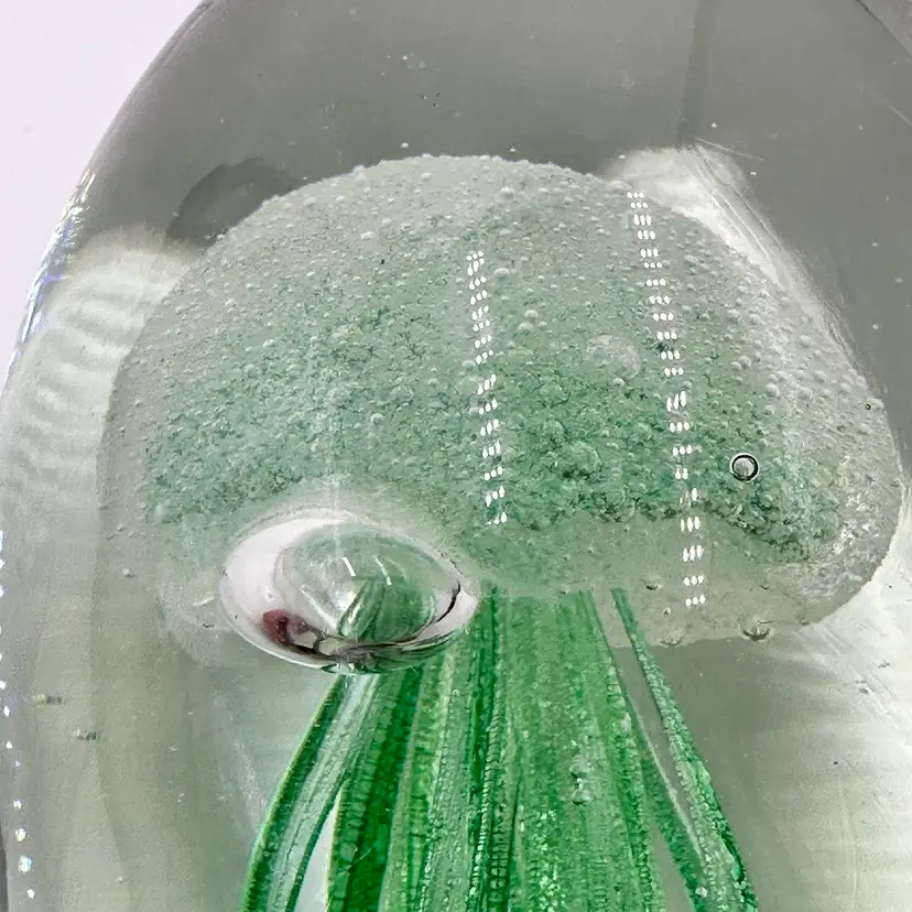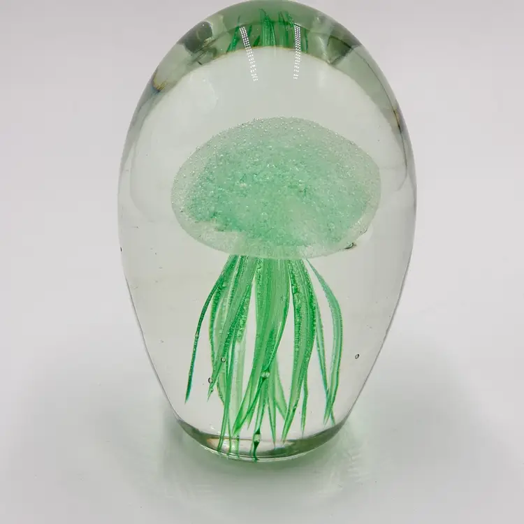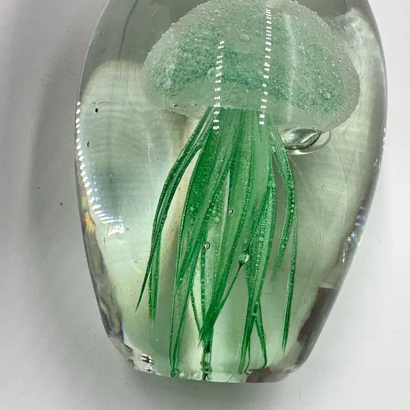 Add a touch of oceanic charm to your desk or collection with this vintage art glass paperweight. The piece features a beautiful green jellyfish design. The jellyfish glows in the dark. This original paperweight is perfect for those who love unique and beautiful glass. In good condition. Does not have any chips or cracks. There is a small pin hole on the side of the paperweight. It appears to be a bubble that was at the surface. It does not have a shape edge. Measures 4 3/4 inches tall and 3 inches wide.