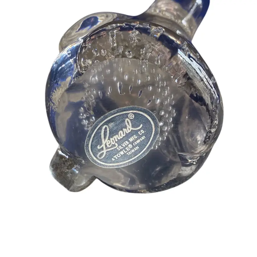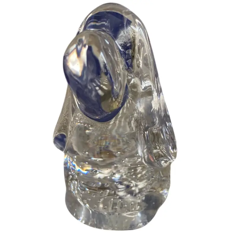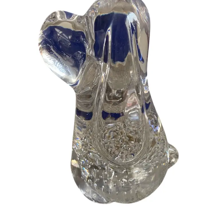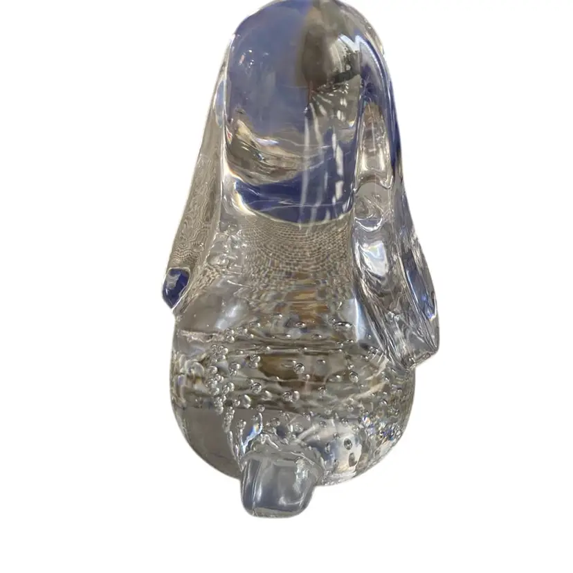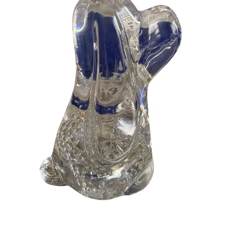 4” tall 2” wide clear glass with bubbles hound dog paperweight. Sticker on bottom says Leonard in Taiwan. No cracks or chips