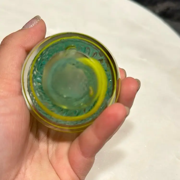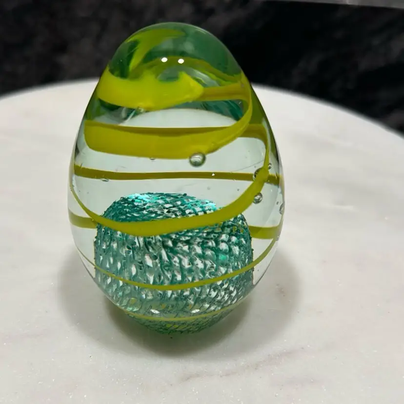Vintage Art Glass Paperweight Clear with Yellow Stripes and Green Latticino