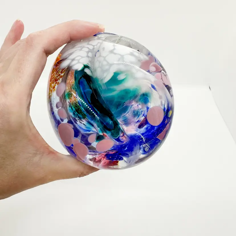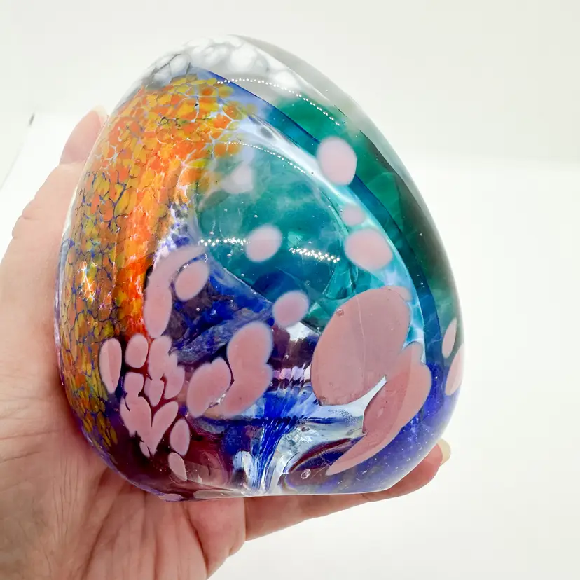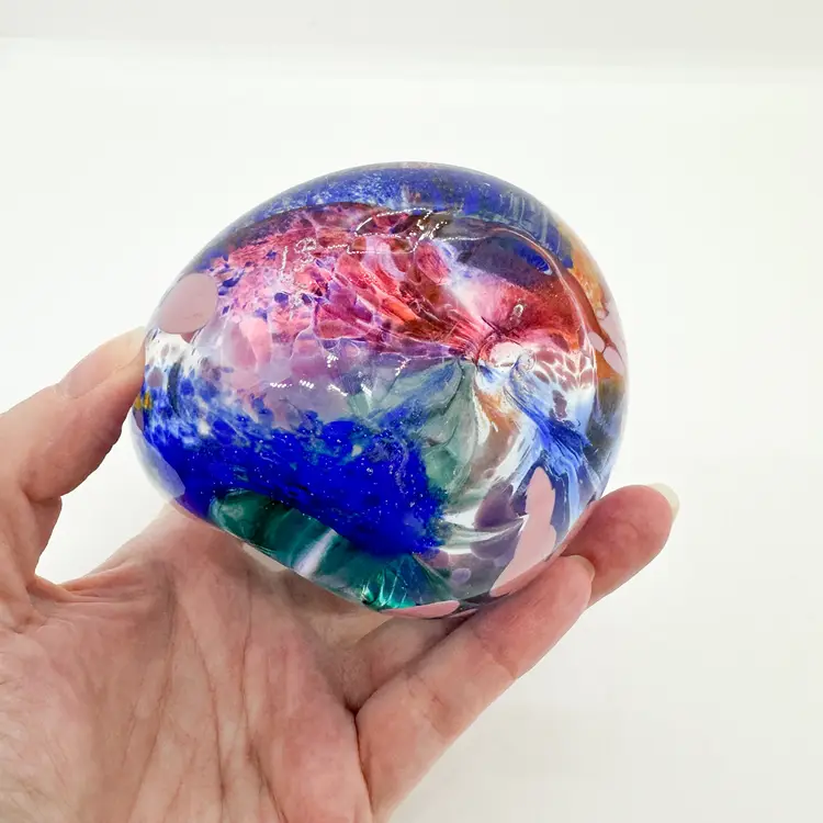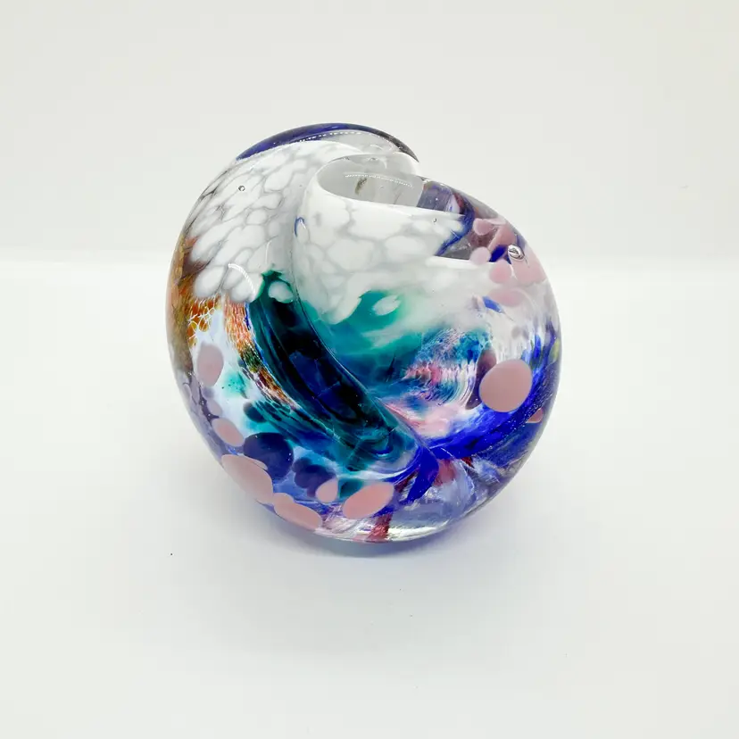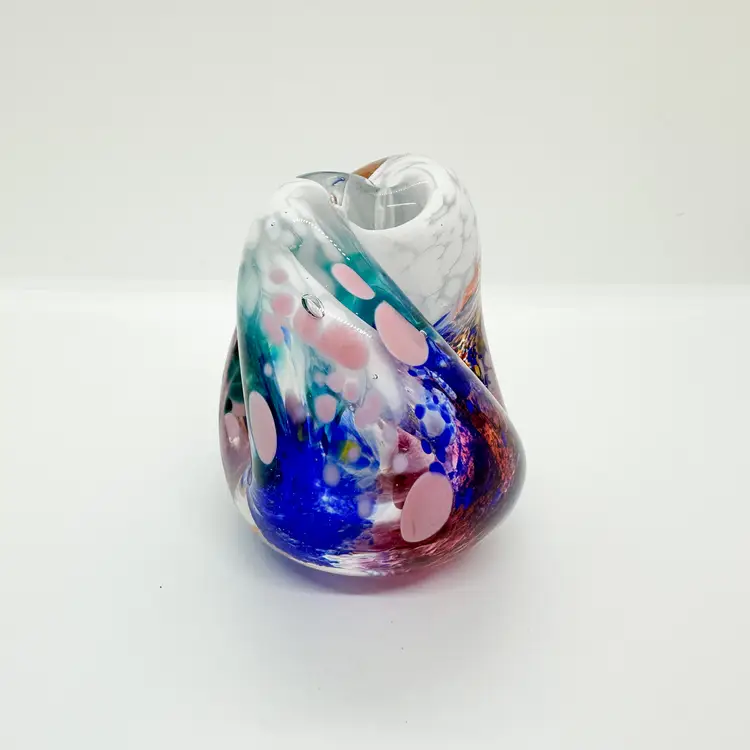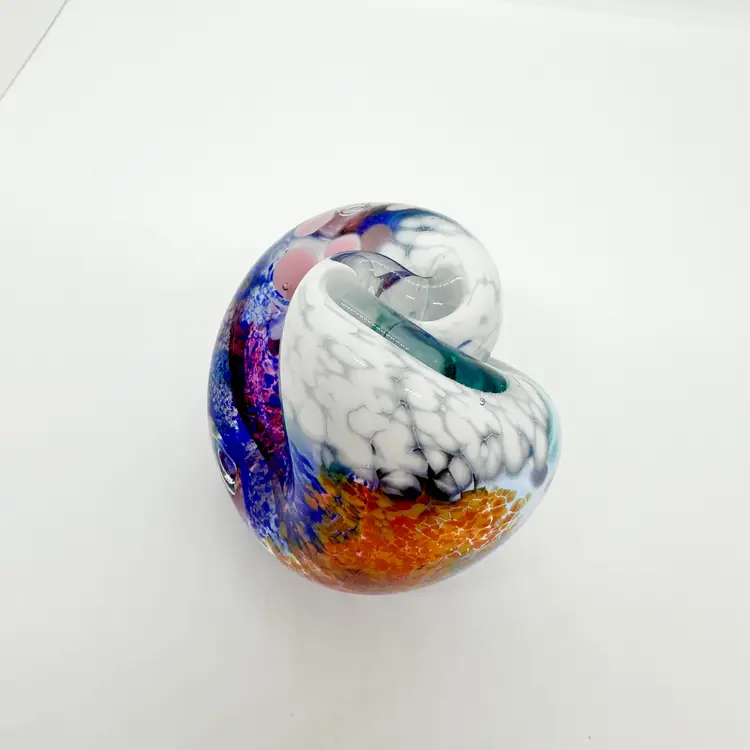 One-of-a-kind hand blown art glass paperweight, signed and dated by artist on bottom edge. Solid glass with a twisted swirl shape, filled with a variety of colored dots that are translucent and opaque. Smooth, clear bottom. No chips/cracks/dimples. About 4" tall x 3.75" round. Weighs over 1lb.