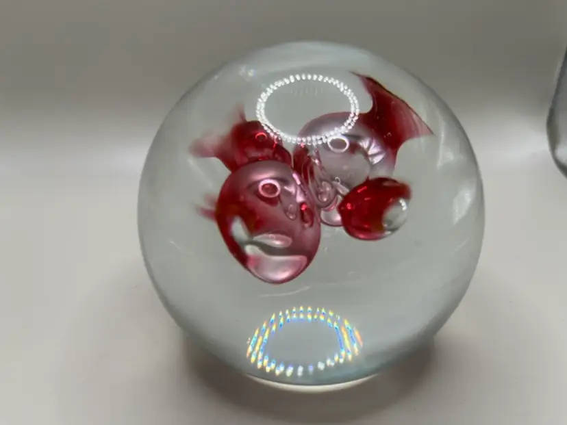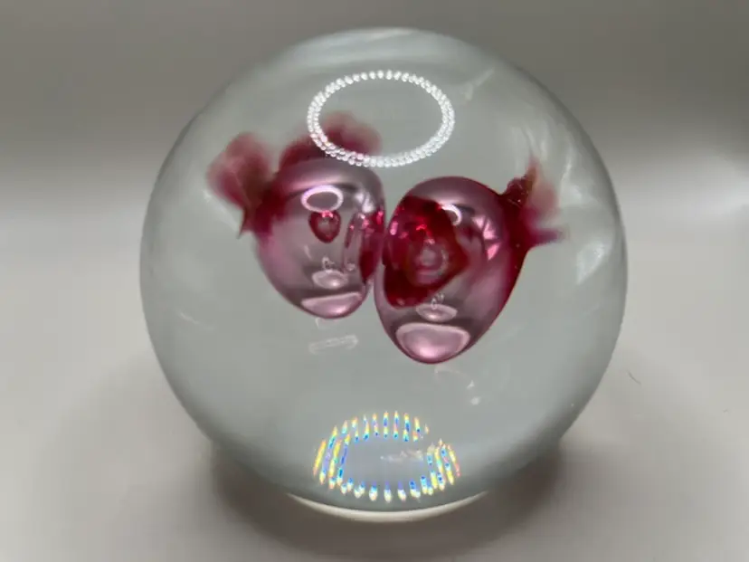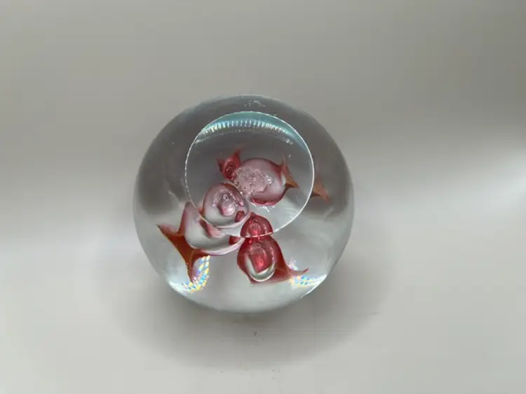 Features 4 floating pink orbs encased in clear glass. Measures 3.5 inches tall