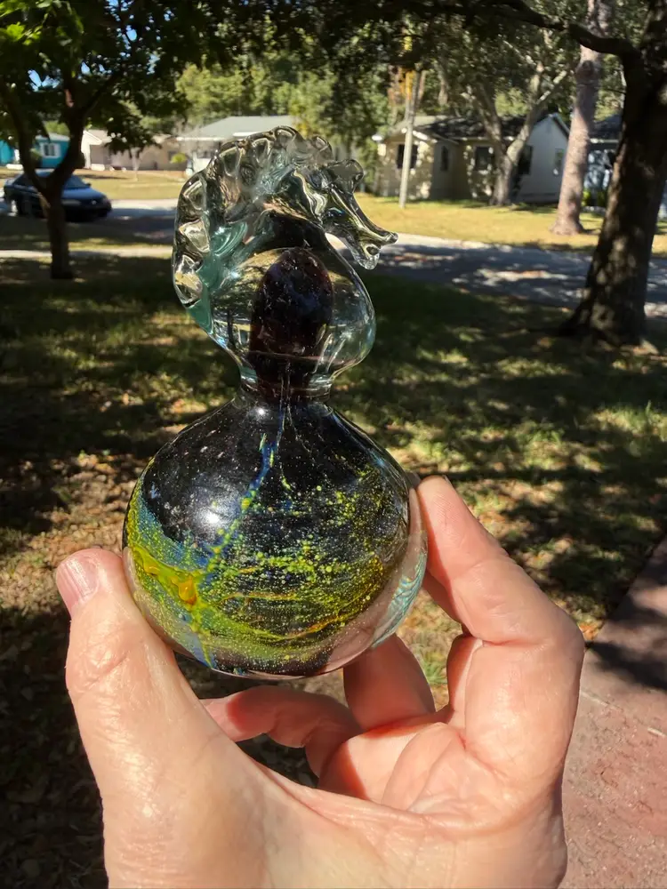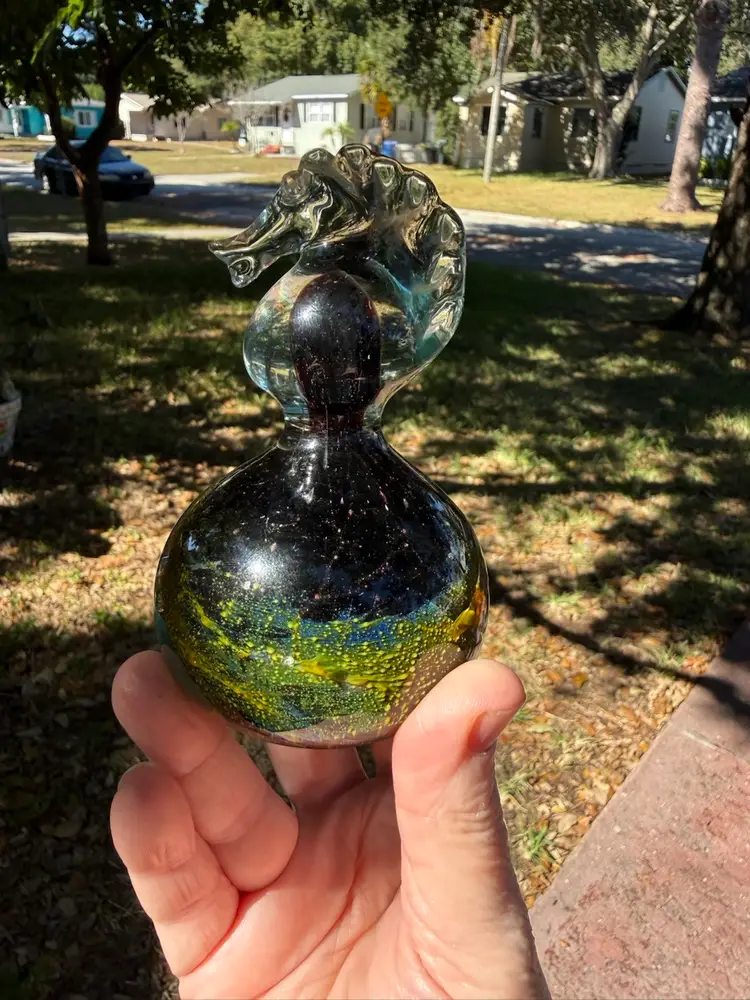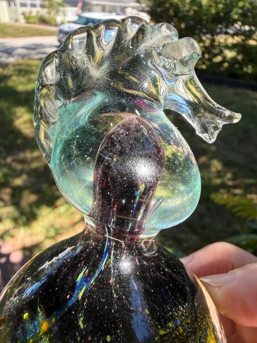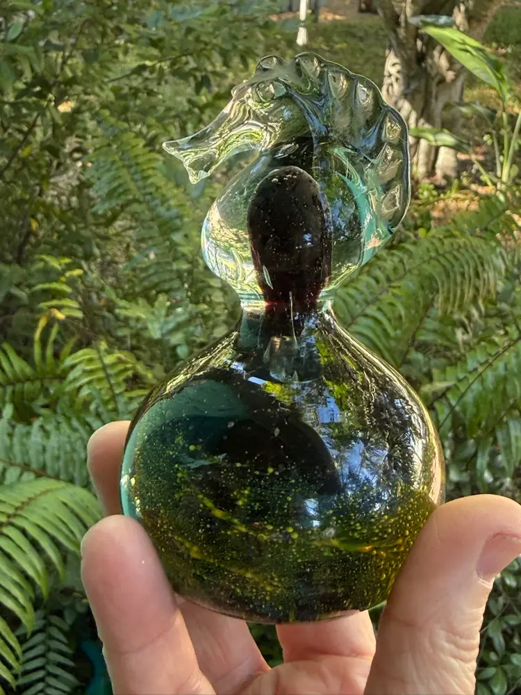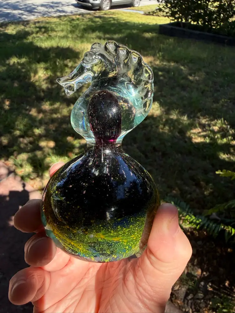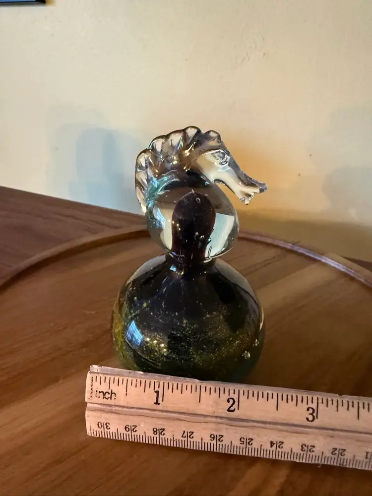 Bring a touch of coastal artistry to your space with this stunning vintage hand-blown glass seahorse sculpture. The clear glass seahorse gracefully curves above a rounded base filled with swirling black, green, and golden bubbles—reminiscent of the ocean’s mysterious depths. Each air bubble and color swirl is unique, showcasing the organic charm of handcrafted art glass. A polished pontil mark at the base hints at its studio-made origins, likely from the late 20th century. Perfect as a paperweight, ocean lover’s gift, or accent for a beach-themed room.