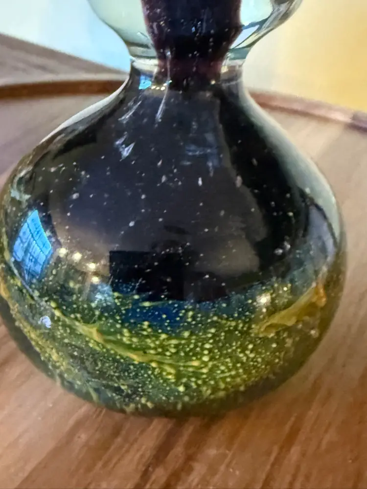 Details: • Height: approx. 4.75 inches • Width: approx. 3 inches • Weight: approx. 1.25–1.5 lbs • Hand-blown art glass • Colors: black, green, gold, and clear glass • Polished base • Condition: excellent vintage condition with minor base wear consistent with age