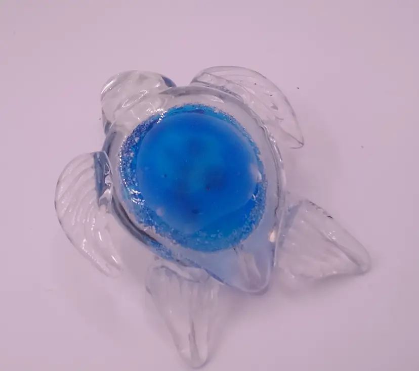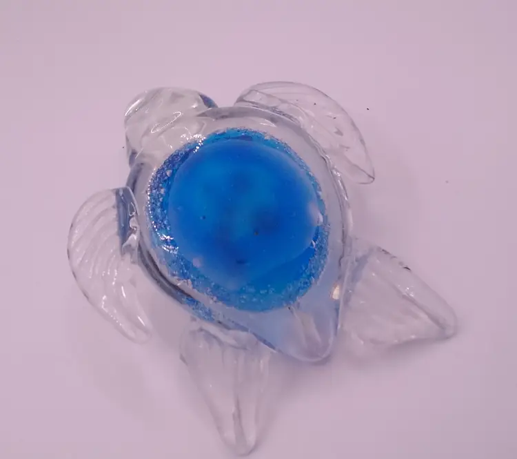 This vintage art glass turtle paperweight features a beautiful blue and clear glass design with an abstract sea turtle theme. The Art Deco style and decorative features make it a unique and eye-catching piece for any collector or lover of art glass. The unmarked brand adds to its charm as a one-of-a-kind piece that will surely be a standout in any collection. no chips or cracks. cloudy bottom
